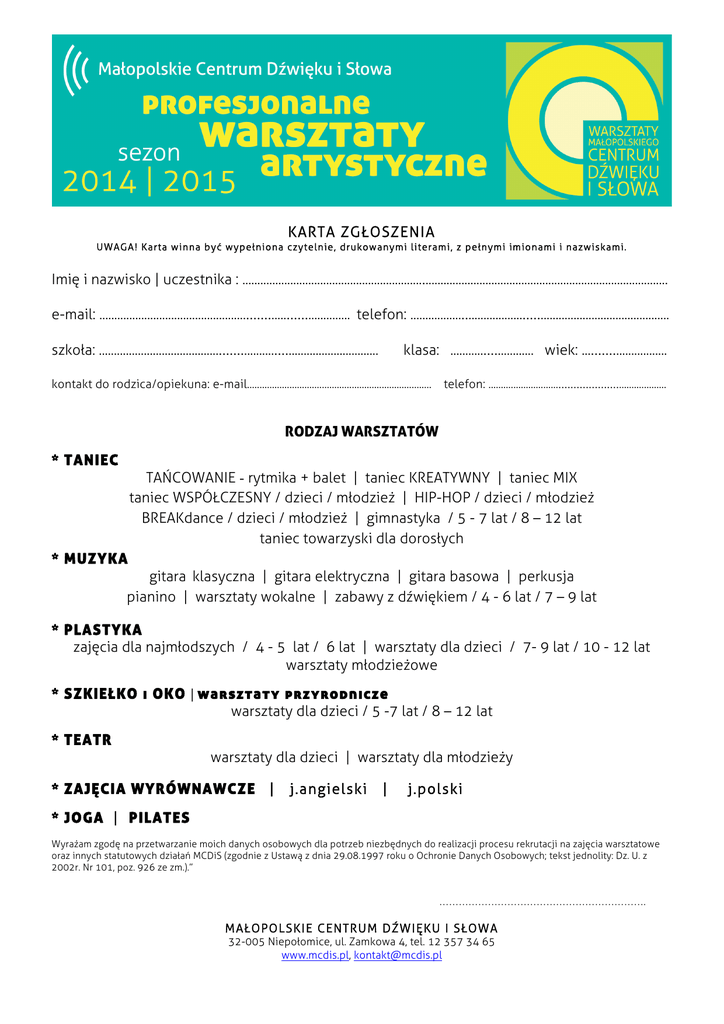 KARTA ZGŁOSZENIA UWAGA! Karta winna być wypełniona czytelnie, drukowanymi literami, z pełnymi imionami i nazwiskami. Imię i nazwisko | uczestnika : .............................................................................................................................................. e-mail: ................................................................................. telefon: ..................................................................................... szkoła: ........................................................................................... klasa: ........................... wiek: ........................... kontakt do rodzica/opiekuna: e-mail.......................................................................... telefon: ................................................................... RODZAJ WARSZTATÓW * TANIEC TAŃCOWANIE - rytmika + balet | taniec KREATYWNY | taniec MIX taniec WSPÓŁCZESNY / dzieci / młodzież | HIP-HOP / dzieci / młodzież BREAKdance / dzieci / młodzież | gimnastyka / 5 - 7 lat / 8 – 12 lat taniec towarzyski dla dorosłych * MUZYKA gitara klasyczna | gitara elektryczna | gitara basowa | perkusja pianino | warsztaty wokalne | zabawy z dźwiękiem / 4 - 6 lat / 7 – 9 lat * PLASTYKA zajęcia dla najmłodszych / 4 - 5 lat / 6 lat | warsztaty dla dzieci / 7- 9 lat / 10 - 12 lat warsztaty młodzieżowe * SZKIEŁKO i OKO | warsztaty przyrodnicze warsztaty dla dzieci / 5 -7 lat / 8 – 12 lat * TEATR warsztaty dla dzieci | warsztaty dla młodzieży * ZAJĘCIA WYRÓWNAWCZE | j.angielski | j.polski * JOGA | PILATES Wyrażam zgodę na przetwarzanie moich danych osobowych dla potrzeb niezbędnych do realizacji procesu rekrutacji na zajęcia warsztatowe oraz innych statutowych działań MCDiS (zgodnie z Ustawą z dnia 29.08.1997 roku o Ochronie Danych Osobowych; tekst jednolity: Dz. U. z 2002r. Nr 101, poz. 926 ze zm.).” ………………………………………………………. MAŁOPOLSKIE CENTRUM DŹWIĘKU I SŁOWA 32-005 Niepołomice, ul. Zamkowa 4, tel. 12 357 34 65 www.mcdis.pl, [email protected]