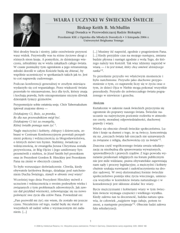 WIARA I UCZYNKI W ÂWIECKIM ÂWIECIE Biskup Keith B. McMullin Drugi Doradca w Przewodniczàcej Radzie Biskupiej Przes∏anie KSE z Ogniska dla M∏odych Doros∏ych • 5 listopada 2006 r. Uniwersytet Brighama Younga Moi drodzy bracia i siostry, jakie orzeêwienie przynosi wasz widok. Przywiod∏y was tu ró˝ne ˝yciowe drogi z ró˝nych stron kraju. A pomyÊlcie, ˝e dzisiejszego wieczoru, zebraliÊmy si´ w wielu zakàtkach ca∏ego Êwiata. W czasie pomi´dzy tym ogniskiem a jego retransmisjà m∏odzi doroÊli w ca∏ym KoÊciele b´dà si´ zbieraç, by wspólnie uczestniczyç w spotkaniach takich jak to. Jest to coÊ naprawd´ cudownego. [...] Musimy iÊç naprzód, zgodnie z pragnieniem Pana. [...] Kiedy przyjdzie czas na mojego nast´pc´, zmiana b´dzie p∏ynna i nastàpi zgodnie z wolà Tego, do którego nale˝y ten KoÊció∏. Tak wi´c idziemy naprzód w wiarà — i to jest temat, który chc´ omówiç dzisiejszego ranka”2. To przes∏anie przysz∏o we w∏aÊciwym momencie i by∏o natchnione. Przysz∏o jako duchowe przypomnienie o tym, co naprawd´ liczy si´ w ˝yciu oraz o tym, ˝e dzieci Ojca w Niebie mogà pokonaç wszystkie przeszkody. Przysz∏o do zeÊwieccza∏ego Êwiata pogrà˝onego w niewierze i grzechu. Podczas konferencji generalnej w zesz∏ym miesiàcu wydarzy∏o si´ coÊ wspania∏ego. Przez wi´kszoÊç Êwiata pozosta∏o to niezauwa˝one, lecz dla tych, którzy znajà i kochajà prawd´, by∏o niezapomniane niczym dêwi´k dziesiàtek tysi´cy grzmotów. Ateizm Przypomnijcie sobie ostatnià sesj´. Chór Tabernakulum Êpiewa∏ znajome s∏owa — Kszta∏cenie w zakresie nauk Êwieckich przyczynia si´ ogromnie do poprawy naszego Êwiata. Âwieckie nauczanie na najwy˝szym poziomie rozkwita w atmosferze cnoty, moralnej odpowiedzialnoÊci, duchowej prawdy i wiary. Dzi´kujemy Ci, Bo˝e, za proroka, By dla nas przewodnikiem móg∏ byç. Dzi´kujemy Ci te˝ za ewangeli´, Której Êwiat∏o pomaga nam ˝yç 1. Wielce si´ obecnie chwali Êwieckie spo∏eczeƒstwa. Ludzie i kraje sà dumni z tego, ˝e sà Êwieccy, koncentrujà si´ na „rzeczach Êwiata lub rzeczach nie uznawanych za zwiàzane z religià, duchowoÊcià czy za Êwi´te”3. Nagle m´˝czyêni i kobiety, ch∏opcy i dziewcz´ta, zebrani w Centrum Konferencyjnym powstali przepe∏nieni pokorà i wdzi´cznoÊcià za b∏ogos∏awieƒstwa, o których mówi ten hymn. StaliÊmy, Êwiadczàc z wdzi´cznoÊcià, ˝e ewangelia Jezusa Chrystusa zosta∏a przywrócona, ˝e Bóg Ojciec i Jego umi∏owany Syn przemówili z niebios, ˝e Józef Smith by∏ prorokiem oraz ˝e Prezydent Gordon B. Hinckley jest Prorokiem Pana na ziemi w obecnych czasach. Znaczna cz´Êç wspó∏czesnego Êwiata uwa˝a sekularyzacj´ za niezb´dnà dla sprawowania wywa˝onych, sprawiedliwych i prawych rzàdów. Z tego powodu wyra˝anie przekonaƒ religijnych na forum publicznym nie jest mile widziane, prawa obywatelskie zapewniajà nam sàdy i procesy legislacyjne, a m´˝czyêni i kobiety ch´tnie szukajà rozwiàzaƒ i zadoÊçuczynienia na drodze sàdowej. W swej ekstremalnej formie Êwieckie spo∏eczeƒstwo pomija ide´ ˝ycia wiecznego, umieszcza wszystko w kontekÊcie Êwiata naturalnego i w konsekwencji jest sk∏onne dzia∏aç bez wiary. To by∏o wzruszajàce doÊwiadczenie. Chwila, kiedy obywatele królestwa Bo˝ego, dzia∏ajàc pod natchnieniem Ducha Âwi´tego, stan´li w obronie swej wiary! WczeÊniej tego dnia Prezydent Hinckley mówi∏ z uczuciem i wdzi´cznoÊcià o swoim podesz∏ym wieku i zwiàzanych z tym problemach zdrowotnych. Jak zawsze da∏ przyk∏ad wiernoÊci, zobowiàzujàc si´ na nowo poÊwi´ciç swe ˝ycie dla celów Pana. Powiedzia∏ on: Bycie m´˝czyznami i kobietami wiary w tym Êwieckim Êwiecie wymaga czujnoÊci i wielkiego wysi∏ku. Kiedy zalewa nas ta doczesnoÊç, ludzka natura sprawia, ˝e cz∏owiek „najpierw tego ˝a∏uje, potem to znosi, a nast´pnie przyjmuje”4. Obecnie ludzi zalewa fala sekularyzacji. „Pan pozwoli∏ mi ˝yç; nie wiem, ile zosta∏o mi jeszcze czasu. Niezale˝nie od tego, nadal b´d´ si´ stara∏ ze wszystkich si∏ radziç sobie z wyznaczonym mi zadaniem. [...] 1 © 2006 by Intellectual Reserve, Inc. Wszystkie prawa zastrze˝one. Printed in Germany. Zatwierdzenie wersji angielskiej: 6/05. 00942 166 Przes∏anie KSE z Ogniska dla M∏odych Doros∏ych • 5 listopada 2006 r. • Biskup Keith B. McMullin jako Stworzyciela, Zbawiciela i Odkupiciela. Ponownie przynios∏o prawid∏owe zrozumienie celów ˝ycia. W 1831 roku powiedziano dzieciom Ojca Niebieskiego: Pozbawiony kontroli przez wiar´, ˝e Chrystus jest Odkupicielem ludzkoÊci, ten Êwiecki czy te˝ naturalny Êwiat kreuje m´˝czyzn i kobiety, którzy sà „dumni, obsesyjnie skoncentrowani na sobie, nadmiernie nastawieni na wspó∏zawodnictwo, zatwardziali w swoich poglàdach, za wszelkà cen´ niezale˝ni i którzy kierujà si´ w ˝yciu w∏asnymi pragnieniami, ˝àdzami [oraz] uznaniem Êwiata. [...] Ogólnie rzecz ujmujàc, cz∏owiek naturalny to istota, która nie odpokutowa∏a, która kroczy [...] w ˝arze w∏asnego ognia [zob. 2 Nefi 7:10–11]. Taka osoba dostosowuje si´ do charakteru rzeczy, które jà otaczajà, a jej wytyczne i kierunek wyznacza upad∏y Êwiat”5. Krótko mówiàc: „Ludzie, którzy znajdujà si´ w swym naturalnym [...] stanie, [...] ˝yjà na tym Êwiecie bez Boga” (Alma 41:11). „Przeto ja, Pan, znajàc kl´sk´, jaka spadnie na mieszkaƒców Ziemi, powo∏a∏em swego s∏ug´ Józefa Smitha Jr., i przemówi∏em doƒ z nieba, i przekaza∏em mu przykazania; [...] Aby wiara [...] wzrasta∏a na Ziemi” (NiP 1:17, 21). Zanim po∏o˝ono fundamenty tego Êwiata, zanim planety otrzyma∏y swoje miejsca we wszechÊwiecie, m´˝czyêni i kobiety ˝yli, poruszali si´ i istnieli (zob. Dz. Apostolskie 17:28). Âwieckie pojmowanie ˝ycia jako czegoÊ wy∏àcznie biologicznego, przeczy podstawowej prawdzie, ÊwiadomoÊci, która tkwi w g