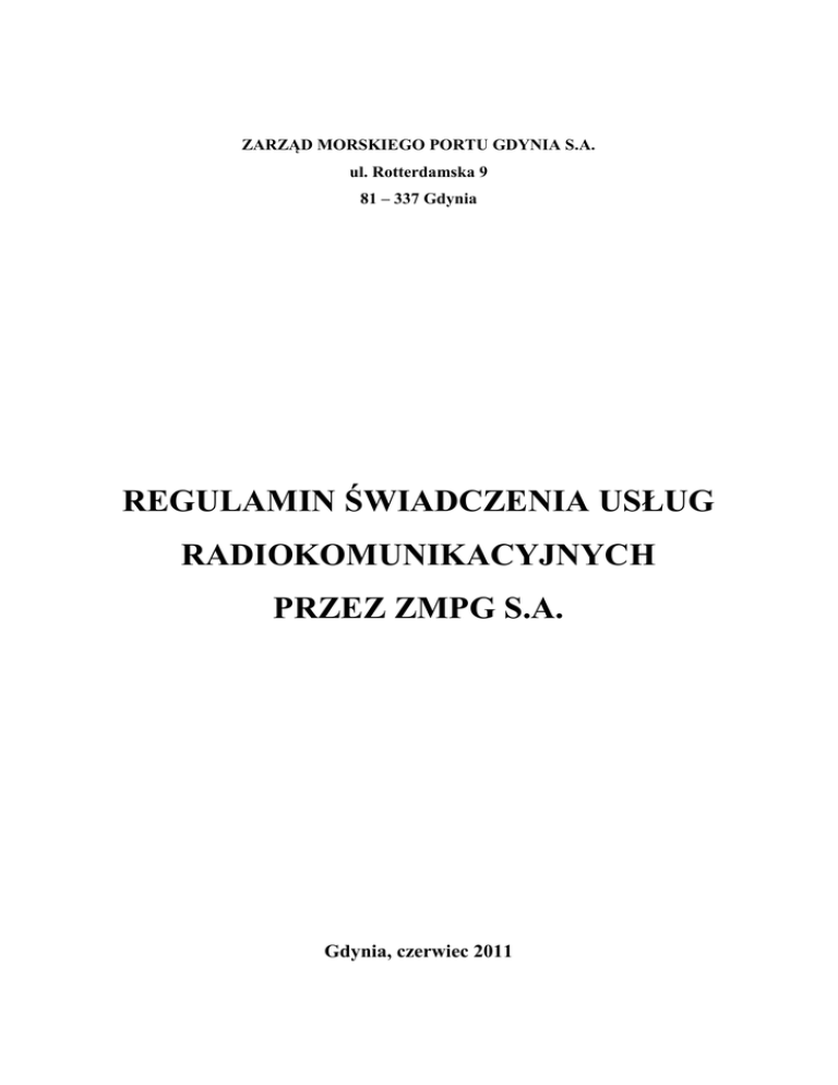 ZARZĄD MORSKIEGO PORTU GDYNIA S.A. ul. Rotterdamska 9 81 – 337 Gdynia REGULAMIN ŚWIADCZENIA USŁUG RADIOKOMUNIKACYJNYCH PRZEZ ZMPG S.A. Gdynia, czerwiec 2011 ROZDZIAŁ I POSTANOWIENIA OGÓLNE §1 Niniejszy regulamin, zwany dalej „Regulaminem” jest wydany w oparciu o wpis do Rejestru przedsiębiorców telekomunikacyjnych nr 1155 oraz Pozwolenie radiowe nr RRL/E/T/0009/2011 z dnia 01.02.2011 r. §2 Regulamin określa zakres i warunki świadczenia usług radiokomunikacyjnych o charakterze dyspozytorskim w sieci trankingowej przez spółkę pod firmą „Zarząd Morskiego Portu Gdynia” Spółka Akcyjna, zwanej dalej ZMPG S.A. §3 ZMPG S.A. działa w oparciu o wpis do Rejestru przedsiębiorców telekomunikacyjnych nr 1155 oraz Pozwolenie radiowe nr RRL/E/T/0009/20011 z dnia 01.02.2011 r. §4 Abonenci sieci trankingowej ZMPG S.A. mogą : 1. uzyskać za pośrednictwem sieci telefonicznej ZMPG S.A. dostęp do sieci telefonicznych innych operatorów, 2. podpisać równolegle umowę z innym operatorem tożsamej technicznie sieci trankingowej po zgłoszeniu takiego zamiaru na piśmie ZMPG S.A. i uzgodnieniu szczegółów programowych. §5 Użyte w Regulaminie określenia oznaczają: 1. „abonament” – uprawnienie do stałego korzystania z usług telekomunikacyjnych, zgodnie z taryfami określonymi w Cenniku Usług Telekomunikacyjnych ZMPG S.A. zwanym dalej „cennikiem”, 2. „abonent” – podmiot, który zawarł z ZMPG S.A. umowę o świadczenie usług telekomunikacyjnych określoną w Rozdziale V, 2 3. „aktywacja” – włączenie radiotelefonu do sieci trankingowej ZMPG S.A. po pierwszym zaprogramowaniu go, 4. „faktura VAT” – dokument księgowy, na podstawie którego abonent uiszcza opłaty za usługi radiokomunikacyjne. ROZDZIAŁ II ZAKRES USŁUG RADIOKOMUNIKACYJNYCH §6 1. ZMPG S.A. świadczy, zgodnie z Regulaminem, usługi radiokomunikacyjne w sieci trankingowej o charakterze dyspozytorskim określone w §6 pkt.2, zwane dalej „usługami radiokomunikacyjnymi”. 2. ZMPG S.A. świadczy następujące rodzaje usług radiokomunikacyjnych: abonament, aktywacja, połączenia telekomunikacyjne. W trakcie prowadzenia rozmów należy pamiętać, że korespondencja odbywa się naprzemiennie tzn. jeżeli jedna strona mówi – druga może tylko słuchać. inne usługi radiokomunikacyjne, określone w Cenniku, świadczone zgodnie z wyborem abonenta. 3. Połączenia telekomunikacyjne dzieli się na: połączenia radiotelefoniczne grupowe, połączenia radiotelefoniczne grupowe z innymi abonentami. Połączenia tego typu są możliwe tylko w przypadku pisemnej zgody wszystkich zainteresowanych. połączenia radiotelefoniczne indywidualne (pomiędzy dwoma radiotelefonami), połączenia radiotelefoniczno – telefoniczne realizowane poprzez sieci ZMPG S.A. połączenia typu EMERGENCY – polegające na natychmiastowym zestawieniu połączenia w sytuacjach zagrożeń. 4. Sieć trankingowa obsługiwana przez ZMPG S.A. umożliwia abonentowi korzystanie z sieci telefonicznych innych operatorów poprzez sieć telefoniczną Portu. Jest to funkcja dodatkowa, wymagająca odpowiedniego sprzętu abonenckiego oraz aktywowania jej przez operatora. 5. Stawki za poszczególne rodzaje usług świadczonych przez ZMPG S.A. określa Cennik. 6. ZMPG S.A. zastrzega sobie prawo do zmiany zakresu świadczonych usług. ZMPG S.A. poinformuje Abonenta o planowanych zmianach z 3 - miesięcznym wyprzedzeniem. 3 Niewypowiedzenie Umowy przez Abonenta w terminie 30 dni od daty poinformowania będzie traktowane jako zgoda na te zmiany. §7 ZMPG S.A. świadczy usługi radiokomunikacyjne w zasięgu sieci trankingowej w zakresie istniejących możliwości technicznych. Sieć trankingowa ZMPG S.A. obejmuje swym zasięgiem następujący obszar : 1. Gdynia od dzielnicy Wzgórze Św. Maksymiliana do Chyloni w pasie od morza do wzgórz morenowych. W zasięgu znajduje się także Pogórze oraz Kosakowo (granica zasięgu), 2. Rumia, Kazimierz, 3. Reda w pasie do Wejherowa Śmiechowa. ROZDZIAŁ III ODPOWIEDZIALNOŚĆ ZMPG S.A. §8 Zasady odpowiedzialności 1. ZMPG S.A. odpowiada za niewykonanie lub nienależyte wykonanie usług radiokomunikacyjnych jedynie w zakresie określonym w ustawie Prawo Telekomunikacyjne. §9 Zakres odpowiedzialności 1. Za każdy dzień przerwy w świadczeniu usług radiokomunikacyjnych abonentowi przysługuje odszkodowanie w wysokości 1/15 średniej opłaty miesięcznej liczonej według rachunków z ostatnich trzech okresów rozliczeniowych, jednak za okres nie dłuższy niż ostatnie 12 miesięcy. 2. Odszkodowanie nie przysługuje, jeżeli w okresie rozliczeniowym łączny czas przerw był krótszy od 36 godzin. 3. Niezależnie od odszkodowania, za każdy dzień, w którym nastąpiła przerwa w świadczeniu usług radiokomunikacyjnych trwająca dłużej niż 12 godzin, abonentowi przysługuje zwrot 1/30 miesięcznej opłaty abonamentowej. § 10 Jeżeli szkoda jest następstwem czynu niedozwolonego, ZMPG S.A. ponosi odpowiedzialność na podstawie przepisów Kodeksu Cywilnego. 4 ROZDZIAŁ IV WARUNKI ŚWIADCZENIA USŁUG RADIOKOMUNIKACYJNYCH § 11 1. ZMPG S.A. świadczy usługi radiokomunikacyjne podmiotom prowadzącym działalność gospodarczą. 2. ZMPG S.A. świadczy usługi radiokomunikacyjne wyłącznie na podstawie umowy o świadczeniu usług radiokomunikacyjnych określonej w Rozdziale V. § 12 Poufność 1. ZMPG S.A. zapewnia abonentowi poufność wobec osób trzecich informacji o świadczonych na jego rzecz usługach radiokomunikacyjnych z wyjątkiem przypadków, gdy ujawnienie tych informacji jest przewidziane przepisami prawa. 2. Ze względu na radiotelefoniczny charakter połączeń ZMPG S.A. nie gwarantuje ochrony tajemnicy ich treści. 3. Pracownicy ZMPG S.A. którzy realizują usługę radiokomunikacyjną, mogą zapoznać się z treścią połączeń radiotelefonicznych w zakresie niezbędnym do realizacji danej usługi. ROZDZIAŁ V UMOWA O ŚWIADCZENIE USŁUG RADIOKOMUNIKACYJNYCH 