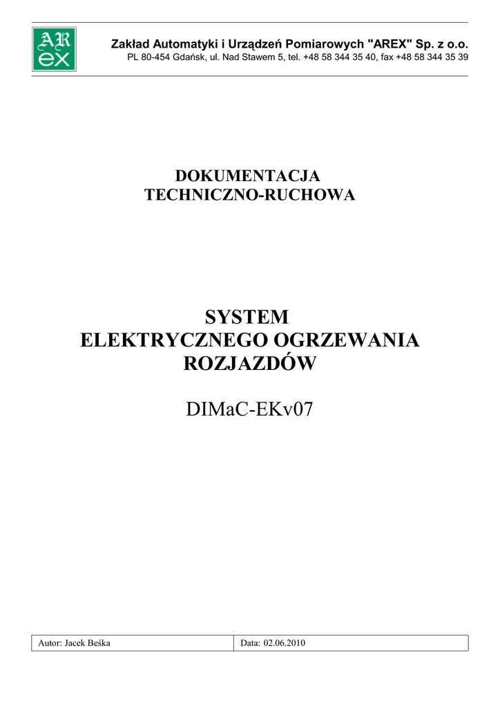 Zakład Automatyki i Urządzeń Pomiarowych "AREX" Sp. z o.o. PL 80-454 Gdańsk, ul. Nad Stawem 5, tel. +48 58 344 35 40, fax +48 58 344 35 39 DOKUMENTACJA TECHNICZNO-RUCHOWA SYSTEM ELEKTRYCZNEGO OGRZEWANIA ROZJAZDÓW DIMaC-EKv07 Autor: Jacek Beśka Data: 02.06.2010 Spis treści 1.Wstęp...........................................................................................................................................................................3 1.1.Dokumenty odniesienia....................................................................................................................................3 1.2.Przeznaczenie systemu.....................................................................................................................................3 1.3.Zakres...............................................................................................................................................................3 2.Budowa systemu...........................................................................................................................................................4 2.1.Struktura systemu.............................................................................................................................................4 2.2.Elementy systemu.............................................................................................................................................4 2.2.1.Przetworniki pogodowe........................................................................................................................4 2.2.1.1.Centralny przetwornik pogodowy..............................................................................................4 2.2.1.2.Zintegrowany przetwornik temperatury szyny ogrzewanej, nieogrzewanej oraz detekcji śniegu nawianego i opadowego.............................................................................................................5 2.2.2.Grzejniki................................................................................................................................................5 2.2.2.1.Grzejniki opornic.......................................................................................................................5 2.2.2.2.Grzałki zamknięć.......................................................................................................................5 2.2.3.Uchwyty grzejników.............................................................................................................................5 2.2.3.1.Uchwyt przeciwpełzny do grzałek opornicowych UGP-03.......................................................5 2.2.3.2.Uchwyty dociskowe do grzałek opornicowych.........................................................................6 2.2.4.Puszki przytorowe.................................................................................................................................6 2.2.5.Transformatory......................................................................................................................................6 2.2.6.Rozdzielnice..........................................................................................................................................6 2.2.7.Nadrzędny sterownik.............................................................................................................................6 2.2.8.Serwer i stanowiska diagnostyczne.......................................................................................................7 3.Warstwa komunikacji systemu.....................................................................................................................................7 4.Wizualizacja.................................................................................................................................................................7 5.Załączniki.....................................................................................................................................................................8 (c) Zakład Automatyki i Urządzeń Pomiarowych "AREX" Sp. z o.o. Strona 2 / 8 1. Wstęp System elektrycznego ogrzewania rozjazdów został opracowany przez Zakład Automatyki i Urządzeń Pomiarowych AREX w 1994 roku. Od tego czasu jest on sukcesywnie wdraŜany na terenach kolejowych w kraju i zagranicą. W 2007 CNTK w Warszawie opracował wytyczne dotyczące systemów EOR, które będą przeznaczone do obligatoryjnego stosowania. Wytyczne te, doświadczenia eksploatacyjne, oraz postęp techniczny i technologiczny przyczyniły się do zmodyfikowania urządzeń systemu DIMaC-EK w zakresie ich budowy i funkcjonowania. System DIMaC-EKv07 spełnia wszystkie wymagania PKP PLK S.A.. 1.1. Dokumenty odniesienia 1. Wytyczne projektowania urządzeń elektrycznego ogrzewania rozjazdów Tom1 Projektowanie instalacji torowych i przytorowych, dobór grzejników PKP PLK S.A. Warszawa 2009 2. Wytyczne projektowania urządzeń elektrycznego ogrzewania rozjazdów Tom2. Komunikacja w systemach eor PKP PLK S.A. Warszawa 2009 3. Iet-1 Instrukcja eksploatacji i utrzymania urządzeń elektrycznego ogrzewania rozjazdów PKP PLK S.A. Warszawa 2007 4. Iet-3 Instrukcja eksploatacji urządzeń oświetlenia zewnętrznego terenów kolejowych. 5. Dokument Normatywny 01-6/ET/2008. Szafa rozdzielcza eor. Warszawa 2008. 6. Dokument Normatywny 01-7/ET/2008. Skrzynia transformatorowa eor. Warszawa 2008 7. Dokument Normatywny 01-9/ET/2008. Uchwyty grzejników eor. Warszawa 2008 1.2. Przeznaczenie systemu System DIMaC-EKv07 przeznaczony jest do zdalnej i lokalnej obsługi elektrycznego ogrzewania rozjazdów i sterowania oświetleniem w trybie automatycznym i ręcznym. System umoŜliwia scentralizowane sterowanie i monitorowanie pracy urządzeń w obrębie jednej stacji, jak równieŜ większego obszaru, lub całych linii kolejowych. Ponadto system umoŜliwia zdalne ustawienie parametrów pracy urządze