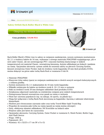 Utworzono: 2017-03-08 00:09:18 Menu: Akcesoria > PRODUCENT > Ortlieb Sakwy Ortlieb Back-Roller Black'n White Line Obejrzyj na stronie internetowej Cena produktu: 519,90 PLN Back-Roller Black'n White Line to sakwy ze zwijanym zamknięciem, nowym systemem montażowym QL 2.1 o średnicy haków do 16 mm, wykonane z nowego materiału PD62/PS60 wyglądającego, jak w serii sakw Classic, ale nie zawierającego PVC i znacznie bardziej elastycznego w niskich temperaturach niż materiał Classic, wewnętrzną kieszenią, dużymi odblaskami po bokach i paskiem na ramię. Opcjonalne akcesoria: system szelek do noszenia sakwy na plecach Carrying System, kieszeń zewnętrzna Outer Pocket, haki do średnicy rurek bagażnika 20 mm (kod produktu E193), można dołączyć na górze sakw torbę Rack-Pack w rozmiarze S lub M. ● ● ● ● ● ● ● ● ● ● ● ● ● ● ● ● ● Materiał: PD62/PS60 Klasyczne tylne sakwy (para) ze zwijanym zamknięciem w dwóch nowych wersjach kolorystycznych z ciekawą grafiką System montażowy QL 2.1 maksymalnie do 16 mm rurek bagażnika Wkładki redukcyjne do haków na średnice rurek 8, 10 i 12 mm w zestawie Haki na średnice rurek 20 mm dostępne oddzielnie (kod produktu E193) Zwiększona odporność materiału na wielokrotne zwijanie przy niskich temperaturach Zintegrowana kieszeń wewnętrzna oraz pasek na ramię w zestawie Może być używana pojedynczo (np. na zakupy, do sportu, na piknik itp.) Mogą być połączone z torbą Rack-Pack mocowaną na bagażniku i łączoną z sakwami właściwymi klamerkami Możliwe jest równoczesne używanie sakw oraz torby Travel-Biker bądź Trunk-Bag Wygodne do noszenia jako torba na ramię (pasek na ramię można odczepić) Duży, efektywny element odblaskowy 3M Scotchlite na bokach sakw Wnętrze sakw jest łatwe do czyszczenia Opcjonalne akcesoria: Carrying System, Outer Pocket w rozmiarze S, Mesh Pocket, Bottle Cage, Anti-Theft Device Waga: 1900 g Pojemność: 40 l Wymiary: 42 x 32/23 x 17 cm (W x S x G) Uwaga: cena, waga i pojemność dotyczą pary sakw. Producent Ortlieb Opcja fotelika dziecięcego Nie Rodzaj Lewa, Prawa Przeznaczenie Miejsce montażu Kolor Na bagażnik Biały_#FFFFFF Akcesoria Adres: www.erowery.pl [email protected] Miejska, Turystyczna Wyprawowa Damski Adres: www.irower.pl Telefon: 605 515 185, 34 361 16 71 Email: [email protected] Email:
