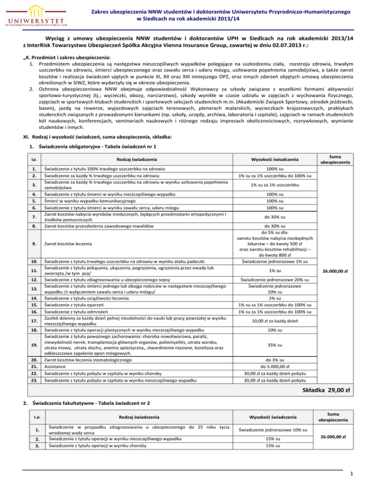 Zakres ubezpieczenia NNW studentów i doktorantów Uniwersytetu Przyrodniczo-Humanistycznego w Siedlcach na rok akademicki 2013/14 Wyciąg z umowy ubezpieczenia NNW studentów i doktorantów UPH w Siedlcach na rok akademicki 2013/14 z InterRisk Towarzystwo Ubezpieczeń Spółka Akcyjna Vienna Insurance Group, zawartej w dniu 02.07.2013 r.: „X. Przedmiot i zakres ubezpieczenia: 1. Przedmiotem ubezpieczenia są następstwa nieszczęśliwych wypadków polegające na uszkodzeniu ciała, rozstroju zdrowia, trwałym uszczerbku na zdrowiu, śmierci ubezpieczonego oraz zawału serca i udaru mózgu, usiłowania popełnienia samobójstwa, a także zwrot kosztów i realizacja świadczeń ujętych w punkcie XI, XII oraz XIII niniejszego OPZ, oraz innych zdarzeń objętych umową ubezpieczenia określonych w SIWZ, które wydarzyły się w okresie ubezpieczenia. 2. Ochrona ubezpieczeniowa NNW obejmuje odpowiedzialność Wykonawcy za szkody związane z wszelkimi formami aktywności sportowo-turystycznej (tj.; wycieczki, obozy, narciarstwo), szkody wynikłe w czasie udziału w zajęciach z wychowania fizycznego, zajęciach w sportowych klubach studenckich i sportowych sekcjach studenckich m.in. (Akademicki Związek Sportowy, ośrodek jeździecki, basen), jazdą na rowerze, wyjazdowych zajęciach terenowych, plenerach malarskich, wycieczkach krajoznawczych, praktykach studenckich związanych z prowadzonymi kierunkami (np. szkoły, urzędy, archiwa, laboratoria i szpitale), zajęciach w ramach studenckich kół naukowych, konferencjach, seminariach naukowych i różnego rodzaju imprezach okolicznościowych, rozrywkowych, wymianie studentów i innych. XI. Rodzaj i wysokość świadczeń, suma ubezpieczenia, składka: 1. Świadczenia obligatoryjne - Tabela świadczeń nr 1 Suma ubezpieczenia Lp. Rodzaj świadczenia Wysokość świadczenia 1. 2. 100% su 1% su za 1% uszczerbku do 100% su 8. Świadczenie z tytułu 100% trwałego uszczerbku na zdrowiu Świadczenie za każdy % trwałego uszczerbku na zdrowiu Świadczenie za każdy % trwałego uszczerbku na zdrowiu w wyniku usiłowania popełnienia samobójstwa Świadczenie z tytułu śmierci w wyniku nieszczęśliwego wypadku Śmierć w wyniku wypadku komunikacyjnego Świadczenie z tytułu śmierci w wyniku zawału serca, udaru mózgu Zwrot kosztów nabycia wyrobów medycznych, będących przedmiotami ortopedycznymi i środków pomocniczych Zwrot kosztów przeszkolenia zawodowego inwalidów 9. Zwrot kosztów leczenia 10. Świadczenie z tytułu trwałego uszczerbku na zdrowiu w wyniku ataku padaczki Świadczenie z tytułu pokąsania, ukąszenia, pogryzienia, ugryzienia przez owady lub zwierzęta /w tym psa/ Świadczenie z tytułu zdiagnozowania u ubezpieczonego sepsy Świadczenie z tytułu śmierci jednego lub obojga rodziców w następstwie nieszczęśliwego wypadku /z wyłączeniem zawału serca i udaru mózgu/ Świadczenie z tytułu uciążliwości leczenia Świadczenie z tytułu oparzeń Świadczenie z tytułu odmrożeń Zasiłek dzienny za każdy dzień pełnej niezdolności do nauki lub pracy powstałej w wyniku nieszczęśliwego wypadku Świadczenie z tytułu operacji plastycznych w wyniku nieszczęśliwego wypadku Świadczenie z tytułu poważnego zachorowania: choroba nowotworowa, paraliż, niewydolność nerek, transplantacja głównych organów, poliomyelitis, utrata wzroku, utrata mowy, utrata słuchu, anemia aplastyczna,, stwardnienie rozsiane, borelioza oraz odkleszczowe zapalenie opon mózgowych. Zwrot kosztów leczenia stomatologicznego Assistance Świadczenie z tytułu pobytu w szpitalu w wyniku choroby Świadczenie z tytułu pobytu w szpitalu w wyniku nieszczęśliwego wypadku 3. 4. 5. 6. 7. 11. 12. 13. 14. 15. 16. 17. 18. 19. 20. 21. 22. 23. 1% su za 1% uszczerbku 100% su 100% su 100% su do 30% su do 30% su do 5% su dla: zwrotu kosztów nabycia niezbędnych lekarstw – do kwoty 500 zł oraz zwrotu kosztów rehabilitacji – do kwoty 800 zł Świadczenie jednorazowe 1% su 1% su 26.000,00 zł Świadczenie jednorazowe 20% su Świadczenie jednorazowe 10% su 2% su 1% su za 1% uszczerbku do 100% su 1% su za 1% uszczerbku do 100% su 10,00 zł za każdy dzień 10% su 35% su do 3% su do 5.000,00 zł 30,00 zł za każdy dzień pobytu 30,00 zł za każdy dzień pobytu Składka 29,00 zł 2. Świadczenia fakultatywne - Tabela świadczeń nr 2 L.p. 1. 2. 3. Rodzaj świadczenia Świadczenie w przypadku zdiagnozowania u ubezpieczonego do 25 roku życia wrodzonej wady serca Świadczenie z tytułu operacji w wyniku nieszczęśliwego wypadku Świadczenie z tytułu operacji w wyniku choroby Wysokość świadczenia Suma ubezpieczenia Świadczenie jednorazowe 10% su 15% su 15% su 26.000,00 zł 1 XII. Definicje: Użyte w niniejszej SIWZ określenia oznaczają: 1) borelioza: wielonarządowa przewlekła choroba bakteryjna manifestująca się różnymi objawami klinicznymi, głównie skórnymi, stawowymi, neurologicznymi i kardiologicznymi, wywołana przez krętki borrelia przenoszone przez kleszcze. 2) choroba: zdiagnozowane w okresie ubezpieczenia zaburzenie w funkcjonowaniu narządów i organów ciała, niezależnie od niczyjej woli, powstałe w wyniku patologii co do której lekarz może postawić diagnozę. 3) kleszczowe zapalenie mózgu: wirusowa choroba ośrodkowego układu nerwowego, przenoszona przez kleszcze, czynnikiem etiologicznym są wirusy z rodziny flaviviridae. 4) koszty leczenia: wydatki poniesione z tytułu udzielenia doraźnej pomocy lekarskiej i pielęgniarskiej, pomocy ambulatoryjnej, pobytu w szpitalu, badań, zabiegów ambulatoryjnych i operacji, nabycia niezbędnych lekarstw i środków opatrunkowych przepisanych przez lekarza, zwrot kosztów rehabilitacji, niezbędnego przewozu ubezpieczonego z miejsca wypadku do szpitala lub ambulatorium. 5) nieszczęśliwy wypadek: nagłe zdarzenie mające miejsce w okresie ochrony ubezpieczeniowej wywołane przyczyną zewnętrzną na skutek której ubezpieczony niezależnie od swojej woli doznał uszkodze