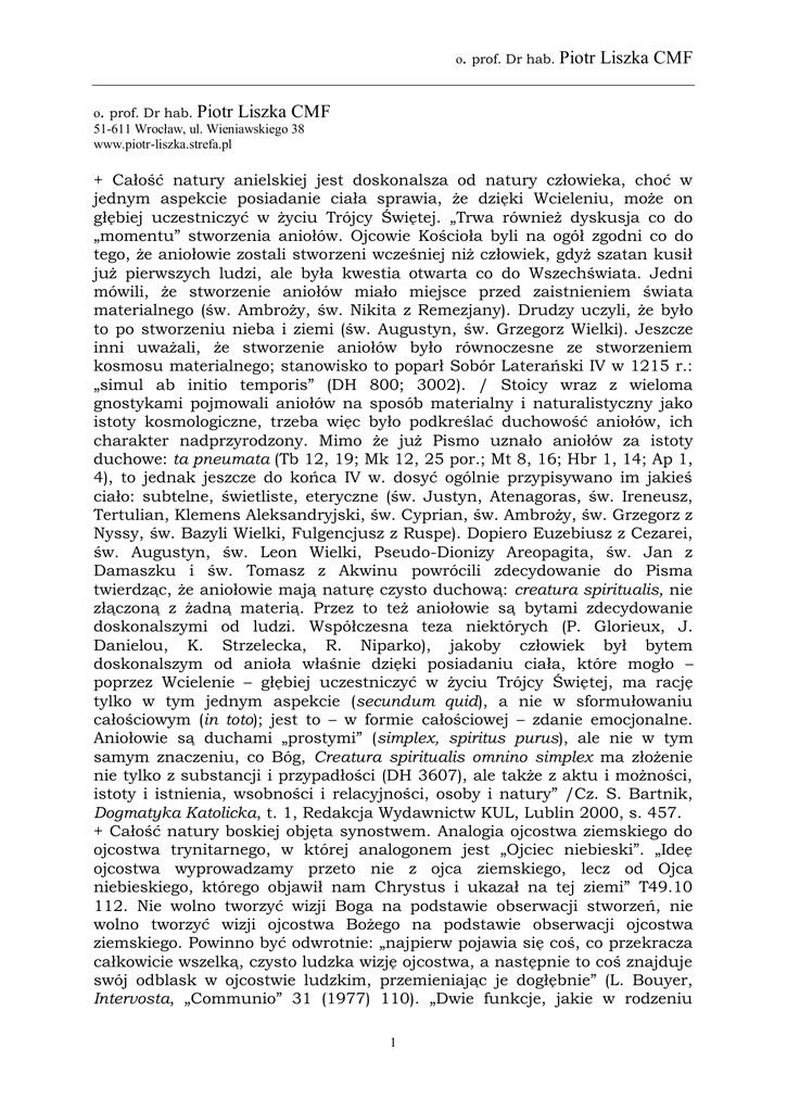 o. prof. Dr hab. Piotr Liszka CMF o. prof. Dr hab. Piotr Liszka CMF 51-611 Wrocław, ul. Wieniawskiego 38 www.piotr-liszka.strefa.pl + Całość natury anielskiej jest doskonalsza od natury człowieka, choć w jednym aspekcie posiadanie ciała sprawia, że dzięki Wcieleniu, może on głębiej uczestniczyć w życiu Trójcy Świętej. „Trwa również dyskusja co do „momentu” stworzenia aniołów. Ojcowie Kościoła byli na ogół zgodni co do tego, że aniołowie zostali stworzeni wcześniej niż człowiek, gdyż szatan kusił już pierwszych ludzi, ale była kwestia otwarta co do Wszechświata. Jedni mówili, że stworzenie aniołów miało miejsce przed zaistnieniem świata materialnego (św. Ambroży, św. Nikita z Remezjany). Drudzy uczyli, że było to po stworzeniu nieba i ziemi (św. Augustyn, św. Grzegorz Wielki). Jeszcze inni uważali, że stworzenie aniołów było równoczesne ze stworzeniem kosmosu materialnego; stanowisko to poparł Sobór Laterański IV w 1215 r.: „simul ab initio temporis” (DH 800; 3002). / Stoicy wraz z wieloma gnostykami pojmowali aniołów na sposób materialny i naturalistyczny jako istoty kosmologiczne, trzeba więc było podkreślać duchowość aniołów, ich charakter nadprzyrodzony. Mimo że już Pismo uznało aniołów za istoty duchowe: ta pneumata (Tb 12, 19; Mk 12, 25 por.; Mt 8, 16; Hbr 1, 14; Ap 1, 4), to jednak jeszcze do końca IV w. dosyć ogólnie przypisywano im jakieś ciało: subtelne, świetliste, eteryczne (św. Justyn, Atenagoras, św. Ireneusz, Tertulian, Klemens Aleksandryjski, św. Cyprian, św. Ambroży, św. Grzegorz z Nyssy, św. Bazyli Wielki, Fulgencjusz z Ruspe). Dopiero Euzebiusz z Cezarei, św. Augustyn, św. Leon Wielki, Pseudo-Dionizy Areopagita, św. Jan z Damaszku i św. Tomasz z Akwinu powrócili zdecydowanie do Pisma twierdząc, że aniołowie mają naturę czysto duchową: creatura spiritualis, nie złączoną z żadną materią. Przez to też aniołowie są bytami zdecydowanie doskonalszymi od ludzi. Współczesna teza niektórych (P. Glorieux, J. Danielou, K. Strzelecka, R. Niparko), jakoby człowiek był bytem doskonalszym od anioła właśnie dzięki posiadaniu ciała, które mogło – poprzez Wcielenie – głębiej uczestniczyć w życiu Trójcy Świętej, ma rację tylko w tym jednym aspekcie (secundum quid), a nie w sformułowaniu całościowym (in toto); jest to – w formie całościowej – zdanie emocjonalne. Aniołowie są duchami „prostymi” (simplex, spiritus purus), ale nie w tym samym znaczeniu, co Bóg, Creatura spiritualis omnino simplex ma złożenie nie tylko z substancji i przypadłości (DH 3607), ale także z aktu i możności, istoty i istnienia, wsobności i relacyjności, osoby i natury” /Cz. S. Bartnik, Dogmatyka Katolicka, t. 1, Redakcja Wydawnictw KUL, Lublin 2000, s. 457. + Całość natury boskiej objęta synostwem. Analogia ojcostwa ziemskiego do ojcostwa trynitarnego, w której analogonem jest „Ojciec niebieski”. „Ideę ojcostwa wyprowadzamy przeto nie z ojca ziemskiego, lecz od Ojca niebieskiego, którego objawił nam Chrystus i ukazał na tej ziemi” T49.10 112. Nie wolno tworzyć wizji Boga na podstawie obserwacji stworzeń, nie wolno tworzyć wizji ojcostwa Bożego na podstawie obserwacji ojcostwa ziemskiego. Powinno być odwrotnie: „najpierw pojawia się coś, co przekracza całkowicie wszelką, czysto ludzka wizję ojcostwa, a następnie to coś znajduje swój odblask w ojcostwie ludzkim, przemieniając je dogłębnie” (L. Bouyer, Intervosta, „Communio” 31 (1977) 110). „Dwie funkcje, jakie w rodzeniu 1 o. prof. Dr hab. Piotr Liszka CMF ludzkim i naturalnym są podzielone pomiędzy matkę i ojca, zespalają się w Bogu, który rodzi swojego Syna jedynego jak ojciec, ale poczyna Go i nosi w sobie jak matka” /De Bérulle, Le grandezze di Cristo, Milano 1935, s. 325/. Poczynanie i rodzenie nie jest temporalne, jest aczasowe, wieczne. Słowo „było na początku” (J 1, 1), a dokładniej: „jest w Początku”, czyli w Ojcu. Początkiem, „Poczęciem” w sensie ontycznym jest Duch Święty. Tak więc Syn Boży „poczyna się” odwiecznie, bezczasowo, w łonie Ojca, mocą Ducha Świętego (Spirituque). Synostwo jest całkowite i istotowe, obejmuje całość natury boskiej. Krytyka i odrzucenie trzech filarów chrystologii i wiary chrześcijańskiej: Tradycji, Pisma Świętego i doświadczenia, zbiega się trzema kryzysami w myśli współczesnej, którymi są: kryzys nauk przyrodniczych, kryzys historyczny i kryzys egzystencjalny T49.13 154. + Całość natury Bożej pełnią życia. Bóg według Ryszarda od św. Wiktora jest kreatywnością, życiem, które ekspanduje w sposób łaskawy i całkowity. Taki jest w całym swym procesie trynitarnym, a w sposób szczególny w swoim początku, w Ojcu. Bóg jest miłością, mocą życia, realizuje się jako spotkanie między Osobami. Bóg jest życiem we wspólnocie, a Jego celem jest przekazywanie życia. Jedność Ojca z Synem rozumiemy jako łaskę, jako miłość, która jest Osobą, jako „My” personalne, jako wspólnotę wewnątrz boskiego spotkania, które „moje” i „twoje” przeciwstawnych podmiotów doprowadza do pełni w personalnym „My” współuczestniczącej łaski. Duch Święty jest kulminacją boskości. W ten sposób są powiązane dwie zasady chrześcijaństwa: Trójca Boża i wcielenie-pascha Syna. Ta sama miłość odwieczna (Trójca immanentna) rozwija się i objawia w miłości historycznej Syna, Jezusa Chrystusa T31.5 32. Jedną z trzech form zrozumienia związku między Duchem Świętym a miłością jest dostrzeganie Ducha Świętego na linii realizacji bytu, który zwieńcza swój proces miłując siebie samego. Bardziej niż osobą (w rozumieniu nowoczesnym) Duch Święty jest finalnym sposobem personalizacji podmiotu, który poznając siebie, miłuje siebie, czyli spoczywa w sobie samym, ratyfikując i potwierdzając swą realność. Może się On nazywa