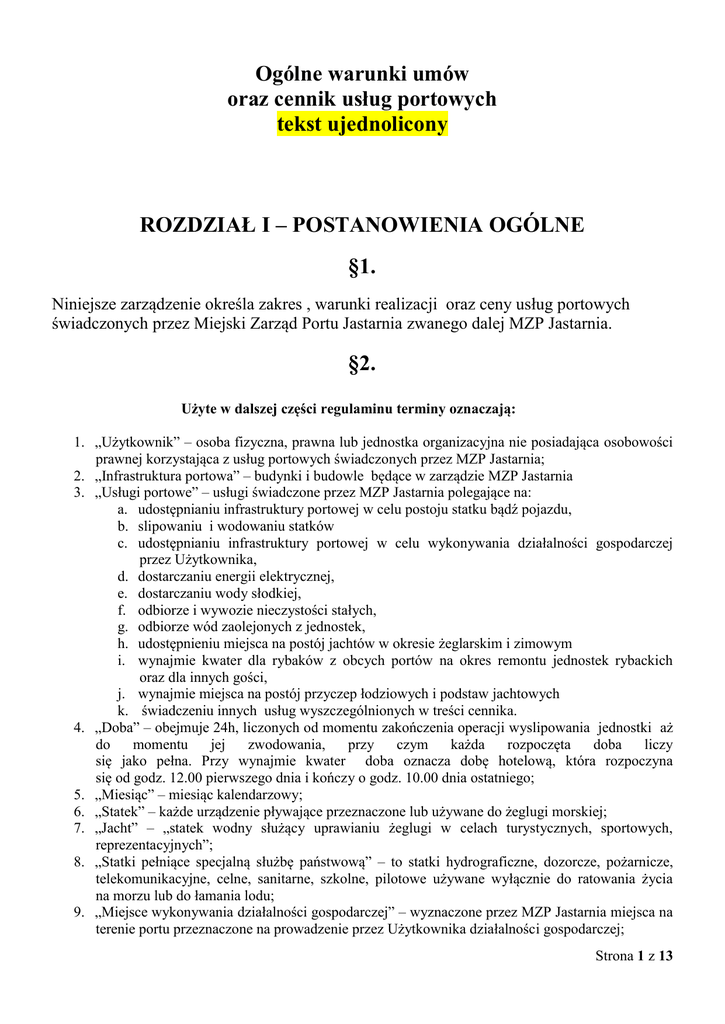 Ogólne warunki umów oraz cennik usług portowych tekst ujednolicony ROZDZIAŁ I – POSTANOWIENIA OGÓLNE §1. Niniejsze zarządzenie określa zakres , warunki realizacji oraz ceny usług portowych świadczonych przez Miejski Zarząd Portu Jastarnia zwanego dalej MZP Jastarnia. §2. Użyte w dalszej części regulaminu terminy oznaczają: 1. „Użytkownik” – osoba fizyczna, prawna lub jednostka organizacyjna nie posiadająca osobowości prawnej korzystająca z usług portowych świadczonych przez MZP Jastarnia; 2. „Infrastruktura portowa” – budynki i budowle będące w zarządzie MZP Jastarnia 3. „Usługi portowe” – usługi świadczone przez MZP Jastarnia polegające na: a. udostępnianiu infrastruktury portowej w celu postoju statku bądź pojazdu, b. slipowaniu i wodowaniu statków c. udostępnianiu infrastruktury portowej w celu wykonywania działalności gospodarczej przez Użytkownika, d. dostarczaniu energii elektrycznej, e. dostarczaniu wody słodkiej, f. odbiorze i wywozie nieczystości stałych, g. odbiorze wód zaolejonych z jednostek, h. udostępnieniu miejsca na postój jachtów w okresie żeglarskim i zimowym i. wynajmie kwater dla rybaków z obcych portów na okres remontu jednostek rybackich oraz dla innych gości, j. wynajmie miejsca na postój przyczep łodziowych i podstaw jachtowych k. świadczeniu innych usług wyszczególnionych w treści cennika. 4. „Doba” – obejmuje 24h, liczonych od momentu zakończenia operacji wyslipowania jednostki aż do momentu jej zwodowania, przy czym każda rozpoczęta doba liczy się jako pełna. Przy wynajmie kwater doba oznacza dobę hotelową, która rozpoczyna się od godz. 12.00 pierwszego dnia i kończy o godz. 10.00 dnia ostatniego; 5. „Miesiąc” – miesiąc kalendarzowy; 6. „Statek” – każde urządzenie pływające przeznaczone lub używane do żeglugi morskiej; 7. „Jacht” – „statek wodny służący uprawianiu żeglugi w celach turystycznych, sportowych, reprezentacyjnych”; 8. „Statki pełniące specjalną służbę państwową” – to statki hydrograficzne, dozorcze, pożarnicze, telekomunikacyjne, celne, sanitarne, szkolne, pilotowe używane wyłącznie do ratowania życia na morzu lub do łamania lodu; 9. „Miejsce wykonywania działalności gospodarczej” – wyznaczone przez MZP Jastarnia miejsca na terenie portu przeznaczone na prowadzenie przez Użytkownika działalności gospodarczej; Strona 1 z 13 10. „Miejsce postojowe” – wyznaczone przez MZP Jastarnia miejsce dla statku przy elemencie infrastruktury portowej oraz miejsce na postój przyczepy podłodziowej. 11. „Sala konferencyjna” – pomieszczenie o powierzchni 60 m2, służące do organizowania bankietów, przyjęć i konferencji z możliwością korzystania z szatni , toalet , zaplecza kuchennego oraz internetu bezprzewodowego”; 12. „Obręb żurawia” – teren wokół żurawia stacjonarnego STB PANDA o promieniu równym długości ramienia żurawia; 13. „Sezon żeglarski” – okres od 01.05. do 15.10 14. „Sezon zimowy” – okres od 16.10. do 30.04. 15. „Rezydent” – osoba, która dokonała opłaty i zawarła umowę na postój jachtu w sezonie żeglarskim na okres miesięczny lub na cały sezon żeglarski. §3. Stawki opłat w cenniku podawane są w złotych polskich. Do stawek opłat podawanych w kwotach netto, doliczony zostanie podatek VAT w odpowiedniej wysokości. ROZDZIAŁ II – UMOWA O ŚWIADCZENIU USŁUG PORTOWYCH §4. Zawarcie umowy na świadczenie usług portowych następuje bądź w momencie określonym w umowie bądź z momentem rozpoczęcia korzystania przez użytkownika z usług portowych świadczonych przez MZP Jastarnia. §5. Czas obowiązywania umowy. 1. Umowa o świadczenie usług portowych może zostać zawarta na piśmie na czas oznaczony lub na czas nieoznaczony. Umowa zawarta ustnie jest ważna jeżeli MZP Jastarnia przystąpi do świadczenia usług. 2. Statki, dla których MZP Jastarnia wyznaczy stałe miejsca postojowe korzystają z usług portowych w drodze umowy zawartej na czas oznaczony, tj. do czasu zakończenia korzystania z usług portowych świadczonych przez MZP Jastarnia. §6. Zasady naliczania opłat. 1. Rodzaj i wysokość opłat za usługi portowe wraz ze szczegółowymi zasadami ich naliczania są określone w Cenniku – ROZDZIAŁ IV. Strona 2 z 13 2. Opłaty za usługi portowe dla Użytkowników korzystających z nich przez czas nieokreślony rozliczane są zgodnie z Cennikiem w terminach określonych w § 7 zarządzenia. 3. Opłaty za usługi portowe dla Użytkowników korzystających z nich przez czas określony z zastrzeżeniem ust. 4, 5, 6 płatne są gotówką lub przelewem niezwłocznie po zakończeniu świadczonych usług na podstawie wystawionej przez MZP Jastarnia faktury VAT. 4. W przypadku postoju jachtów na wodzie w Marinie Jastarnia w okresie sezonu żeglarskiego płatność dokonywa jest z góry za deklarowany okres postoju. 5. W przypadku innych usług o charakterze ciągłym trwającym co najmniej miesiąc płatność następuje z góry za każdy miesiąc kalendarzowy. 6. W przypadku postoju jachtów w okresie zimowym, opłata za usługę określoną w § 16 zarządzenia płatna jest w 2 ratach: a/ 1 rata – płatna w ciągu 15 dni od dnia rozpoczęcia postoju za okres postoju do dnia 31.XII b/ 2 rata – płatna do dnia 31stycznia za okres do końca deklarowanego okresu postoju. W przypadku nie uregulowania należnych rat, MZP Jastarnia ma prawo żądania usunięcia jachtu z miejsca postojowego oraz naliczania opłat za bezumowne korzystanie zgodnie z §10 W przypadku postoju jachtu na lądzie w okresie zimowym dłużej niż zostało to określone w deklaracji zimowania, MZP Jastarnia ma prawo wezwać Użytkownika do natychmiastowego usunięcia jednostki z miejsca postojowego oraz do naliczania opłat za bezumowne korzystanie zgodnie z §10. 7. Opłata za wynajem miejsca postojowego dla przyczepy łodziowej/jachtowej naliczona je