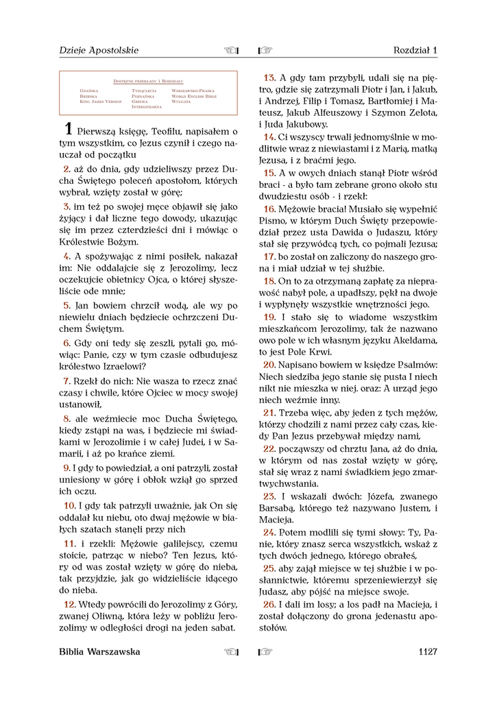 Dzieje Apostolskie L R Dostępne przekłady 1 Rozdziału *W-dz1* Tysiąclecia Warszawsko-Praska Poznańska World English Bible Grecka Wulgata Interlinearna Gdańska Brzeska King James Version 1 Pierwszą księgę, Teofilu, napisałem o tym wszystkim, co Jezus czynił i czego nauczał od początku 2. aż do dnia, gdy udzieliwszy przez Ducha Świętego poleceń apostołom, których wybrał, wzięty został w górę; 3. im też po swojej męce objawił się jako żyjący i dał liczne tego dowody, ukazując się im przez czterdzieści dni i mówiąc o Królestwie Bożym. 4. A spożywając z nimi posiłek, nakazał im: Nie oddalajcie się z Jerozolimy, lecz oczekujcie obietnicy Ojca, o której słyszeliście ode mnie; 5. Jan bowiem chrzcił wodą, ale wy po niewielu dniach będziecie ochrzczeni Duchem Świętym. 6. Gdy oni tedy się zeszli, pytali go, mówiąc: Panie, czy w tym czasie odbudujesz królestwo Izraelowi? 7. Rzekł do nich: Nie wasza to rzecz znać czasy i chwile, które Ojciec w mocy swojej ustanowił, 8. ale weźmiecie moc Ducha Świętego, kiedy zstąpi na was, i będziecie mi świadkami w Jerozolimie i w całej Judei, i w Samarii, i aż po krańce ziemi. 9. I gdy to powiedział, a oni patrzyli, został uniesiony w górę i obłok wziął go sprzed ich oczu. 10. I gdy tak patrzyli uważnie, jak On się oddalał ku niebu, oto dwaj mężowie w białych szatach stanęli przy nich 11. i rzekli: Mężowie galilejscy, czemu stoicie, patrząc w niebo? Ten Jezus, który od was został wzięty w górę do nieba, tak przyjdzie, jak go widzieliście idącego do nieba. 12. Wtedy powrócili do Jerozolimy z Góry, zwanej Oliwną, która leży w pobliżu Jerozolimy w odległości drogi na jeden sabat. Biblia Warszawska Rozdział 1 13. A gdy tam przybyli, udali się na piętro, gdzie się zatrzymali Piotr i Jan, i Jakub, i Andrzej, Filip i Tomasz, Bartłomiej i Mateusz, Jakub Alfeuszowy i Szymon Zelota, i Juda Jakubowy. 14. Ci wszyscy trwali jednomyślnie w modlitwie wraz z niewiastami i z Marią, matką Jezusa, i z braćmi jego. 15. A w owych dniach stanął Piotr wśród braci - a było tam zebrane grono około stu dwudziestu osób - i rzekł: 16. Mężowie bracia! Musiało się wypełnić Pismo, w którym Duch Święty przepowiedział przez usta Dawida o Judaszu, który stał się przywódcą tych, co pojmali Jezusa; 17. bo został on zaliczony do naszego grona i miał udział w tej służbie. 18. On to za otrzymaną zapłatę za nieprawość nabył pole, a upadłszy, pękł na dwoje i wypłynęły wszystkie wnętrzności jego. 19. I stało się to wiadome wszystkim mieszkańcom Jerozolimy, tak że nazwano owo pole w ich własnym języku Akeldama, to jest Pole Krwi. 20. Napisano bowiem w księdze Psalmów: Niech siedziba jego stanie się pusta I niech nikt nie mieszka w niej. oraz: A urząd jego niech weźmie inny. 21. Trzeba więc, aby jeden z tych mężów, którzy chodzili z nami przez cały czas, kiedy Pan Jezus przebywał między nami, 22. począwszy od chrztu Jana, aż do dnia, w którym od nas został wzięty w górę, stał się wraz z nami świadkiem jego zmartwychwstania. 23. I wskazali dwóch: Józefa, zwanego Barsabą, którego też nazywano Justem, i Macieja. 24. Potem modlili się tymi słowy: Ty, Panie, który znasz serca wszystkich, wskaż z tych dwóch jednego, którego obrałeś, 25. aby zajął miejsce w tej służbie i w posłannictwie, któremu sprzeniewierzył się Judasz, aby pójść na miejsce swoje. 26. I dali im losy; a los padł na Macieja, i został dołączony do grona jedenastu apostołów. L R 1127 L R Rozdział 2 będzie wiadome, dajcie też posłuch słowom moim. Dostępne przekłady 2 Rozdziału *W-dz2* Tysiąclecia Warszawsko-Praska Poznańska World English Bible Grecka Wulgata Interlinearna Gdańska Brzeska King James Version 2 A gdy nadszedł dzień Zielonych Świąt, byli wszyscy razem na jednym miejscu. 2. I powstał nagle z nieba szum, jakby wiejącego gwałtownego wiatru, i napełnił cały dom, gdzie siedzieli. 3. I ukazały się im języki jakby z ognia, które się rozdzieliły i usiadły na każdym z nich. 4. I napełnieni zostali wszyscy Duchem Świętym, i zaczęli mówić innymi językami, tak jak im Duch poddawał. 5. A przebywali w Jerozolimie Żydzi, mężowie nabożni, spośród wszystkich ludów, jakie są pod niebem; 6. gdy więc powstał ten szum, zgromadził się tłum i zatrwożył się, bo każdy słyszał ich mówiących w swoim języku. 7. I zdumieli się, i dziwili, mówiąc: Czyż oto wszyscy ci, którzy mówią, nie są Galilejczykami? 8. Jakże więc to jest, że słyszymy, każdy z nas, swój własny język, w którym urodziliśmy się? 9. Partowie i Medowie, i Elamici, i mieszkańcy Mezopotamii, Judei i Kapadocji, Pontu i Azji, 10. Frygii i Pamfilii, Egiptu i części Libii, położonej obok Cyreny, i przychodnie rzymscy, 11. zarówno Żydzi jak prozelici, Kreteńczycy i Arabowie - słyszymy ich, jak w naszych językach głoszą wielkie dzieła Boże. 12. Zdumieli się wtedy wszyscy i będąc w niepewności, mówili jeden do drugiego: Cóż to może znaczyć? 13. Inni zaś drwiąc, mówili: Młodym winem się upili. 14. Na to powstał Piotr wraz z jedenastoma, podniósł swój głos i przemówił do nich: Mężowie judzcy i wy wszyscy, którzy mieszkacie w Jerozolimie! Niechże wam to 1128 Dzieje Apostolskie 15. Albowiem ludzie ci nie są pijani, jak mniemacie, gdyż jest dopiero trzecia godzina dnia, 16. ale tutaj jest to, co było zapowiedziane przez proroka Joela: 17. I stanie się w ostateczne dni, mówi Pan, Że wyleję Ducha mego na wszelkie ciało I prorokować będą synowie wasi i córki wasze, I młodzieńcy wasi widzenia mieć będą, A starcy wasi śnić będą sny; 18. Nawet i na sługi moje i służebnice moje Wyleję w owych dniach Ducha mego I prorokować będą. 19. I uczynię cuda w górze na niebie, I znaki na dole na ziemi, Krew i ogień, i kłęby dymu. 20. Słońce przemieni się w ciemność, A księ