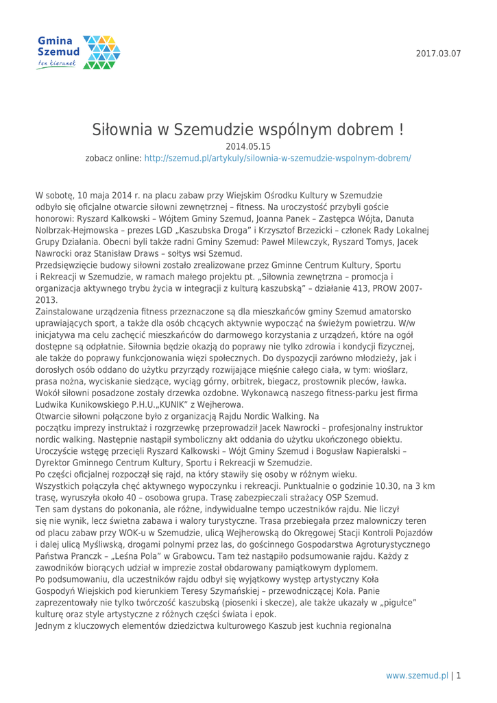 2017.03.07 Siłownia w Szemudzie wspólnym dobrem ! 2014.05.15 zobacz online: http://szemud.pl/artykuly/silownia-w-szemudzie-wspolnym-dobrem/ W sobotę, 10 maja 2014 r. na placu zabaw przy Wiejskim Ośrodku Kultury w Szemudzie odbyło się oficjalne otwarcie siłowni zewnętrznej – fitness. Na uroczystość przybyli goście honorowi: Ryszard Kalkowski – Wójtem Gminy Szemud, Joanna Panek – Zastępca Wójta, Danuta Nolbrzak-Hejmowska – prezes LGD „Kaszubska Droga” i Krzysztof Brzezicki – członek Rady Lokalnej Grupy Działania. Obecni byli także radni Gminy Szemud: Paweł Milewczyk, Ryszard Tomys, Jacek Nawrocki oraz Stanisław Draws – sołtys wsi Szemud. Przedsięwzięcie budowy siłowni zostało zrealizowane przez Gminne Centrum Kultury, Sportu i Rekreacji w Szemudzie, w ramach małego projektu pt. „Siłownia zewnętrzna – promocja i organizacja aktywnego trybu życia w integracji z kulturą kaszubską” – działanie 413, PROW 20072013. Zainstalowane urządzenia fitness przeznaczone są dla mieszkańców gminy Szemud amatorsko uprawiających sport, a także dla osób chcących aktywnie wypocząć na świeżym powietrzu. W/w inicjatywa ma celu zachęcić mieszkańców do darmowego korzystania z urządzeń, które na ogół dostępne są odpłatnie. Siłownia będzie okazją do poprawy nie tylko zdrowia i kondycji fizycznej, ale także do poprawy funkcjonowania więzi społecznych. Do dyspozycji zarówno młodzieży, jak i dorosłych osób oddano do użytku przyrządy rozwijające mięśnie całego ciała, w tym: wioślarz, prasa nożna, wyciskanie siedzące, wyciąg górny, orbitrek, biegacz, prostownik pleców, ławka. Wokół siłowni posadzone zostały drzewka ozdobne. Wykonawcą naszego fitness-parku jest firma Ludwika Kunikowskiego P.H.U.„KUNIK” z Wejherowa. Otwarcie siłowni połączone było z organizacją Rajdu Nordic Walking. Na początku imprezy instruktaż i rozgrzewkę przeprowadził Jacek Nawrocki – profesjonalny instruktor nordic walking. Następnie nastąpił symboliczny akt oddania do użytku ukończonego obiektu. Uroczyście wstęgę przecięli Ryszard Kalkowski – Wójt Gminy Szemud i Bogusław Napieralski – Dyrektor Gminnego Centrum Kultury, Sportu i Rekreacji w Szemudzie. Po części oficjalnej rozpoczął się rajd, na który stawiły się osoby w różnym wieku. Wszystkich połączyła chęć aktywnego wypoczynku i rekreacji. Punktualnie o godzinie 10.30, na 3 km trasę, wyruszyła około 40 – osobowa grupa. Trasę zabezpieczali strażacy OSP Szemud. Ten sam dystans do pokonania, ale różne, indywidualne tempo uczestników rajdu. Nie liczył się nie wynik, lecz świetna zabawa i walory turystyczne. Trasa przebiegała przez malowniczy teren od placu zabaw przy WOK-u w Szemudzie, ulicą Wejherowską do Okręgowej Stacji Kontroli Pojazdów i dalej ulicą Myśliwską, drogami polnymi przez las, do gościnnego Gospodarstwa Agroturystycznego Państwa Pranczk – „Leśna Pola” w Grabowcu. Tam też nastąpiło podsumowanie rajdu. Każdy z zawodników biorących udział w imprezie został obdarowany pamiątkowym dyplomem. Po podsumowaniu, dla uczestników rajdu odbył się wyjątkowy występ artystyczny Koła Gospodyń Wiejskich pod kierunkiem Teresy Szymańskiej – przewodniczącej Koła. Panie zaprezentowały nie tylko twórczość kaszubską (piosenki i skecze), ale także ukazały w „pigułce” kulturę oraz style artystyczne z różnych części świata i epok. Jednym z kluczowych elementów dziedzictwa kulturowego Kaszub jest kuchnia regionalna www.szemud.pl | 1 2017.03.07 wykorzystująca bogactwo okolicznych lasów, jezior, pól oraz morza Bałtyckiego. Koło KGW Szemud przygotowało swoisty poczęstunek z miejscowych produktów. Można było posmakować m.in. zupę z wreków, swojski chleb z Szemuda, zylc, zapiekany pasztet z trusa, krokiety z grzybami z donimirskich lasów, sałatkę warzywną z kaszubskim ananasem – marynowaną cukinią, śledź po kaszubsku, marchwiowy kuch. Główny cel rajdu czyli zwiększenie aktywności ruchowej na świeżym powietrzu – został w pełni osiągnięty. Impreza przyczyniła się do zintegrowania lokalnej społeczności oraz do promocji aktywnego trybu życia i kultury kaszubskiej. Leszek Walkowiak www.szemud.pl | 2