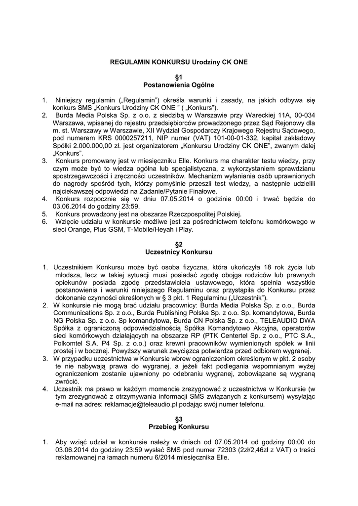 REGULAMIN KONKURSU Urodziny CK ONE §1 Postanowienia Ogólne 1. 2. 3. 4. 5. 6. Niniejszy regulamin („Regulamin”) określa warunki i zasady, na jakich odbywa się konkurs SMS „Konkurs Urodziny CK ONE ” ( „Konkurs”). Burda Media Polska Sp. z o.o. z siedzibą w Warszawie przy Wareckiej 11A, 00-034 Warszawa, wpisanej do rejestru przedsiębiorców prowadzonego przez Sąd Rejonowy dla m. st. Warszawy w Warszawie, XII Wydział Gospodarczy Krajowego Rejestru Sądowego, pod numerem KRS 0000257211, NIP numer (VAT) 101-00-01-332, kapitał zakładowy Spółki 2.000.000,00 zł. jest organizatorem „Konkursu Urodziny CK ONE”, zwanym dalej „Konkurs”. Konkurs promowany jest w miesięczniku Elle. Konkurs ma charakter testu wiedzy, przy czym może być to wiedza ogólna lub specjalistyczna, z wykorzystaniem sprawdzianu spostrzegawczości i zręczności uczestników. Mechanizm wyłaniania osób uprawnionych do nagrody spośród tych, którzy pomyślnie przeszli test wiedzy, a następnie udzielili najciekawszej odpowiedzi na Zadanie/Pytanie Finałowe. Konkurs rozpocznie się w dniu 07.05.2014 o godzinie 00:00 i trwać będzie do 03.06.2014 do godziny 23:59. Konkurs prowadzony jest na obszarze Rzeczpospolitej Polskiej. Wzięcie udziału w konkursie możliwe jest za pośrednictwem telefonu komórkowego w sieci Orange, Plus GSM, T-Mobile/Heyah i Play. §2 Uczestnicy Konkursu 1. Uczestnikiem Konkursu może być osoba fizyczna, która ukończyła 18 rok życia lub młodsza, lecz w takiej sytuacji musi posiadać zgodę obojga rodziców lub prawnych opiekunów posiada zgodę przedstawiciela ustawowego, która spełnia wszystkie postanowienia i warunki niniejszego Regulaminu oraz przystąpiła do Konkursu przez dokonanie czynności określonych w § 3 pkt. 1 Regulaminu („Uczestnik”). 2. W konkursie nie mogą brać udziału pracownicy: Burda Media Polska Sp. z o.o., Burda Communications Sp. z o.o., Burda Publishing Polska Sp. z o.o. Sp. komandytowa, Burda NG Polska Sp. z o.o. Sp komandytowa, Burda CN Polska Sp. z o.o., TELEAUDIO DWA Spółka z ograniczoną odpowiedzialnością Spółka Komandytowo Akcyjna, operatorów sieci komórkowych działających na obszarze RP (PTK Centertel Sp. z o.o., PTC S.A., Polkomtel S.A. P4 Sp. z o.o.) oraz krewni pracowników wymienionych spółek w linii prostej i w bocznej. Powyższy warunek zwycięzca potwierdza przed odbiorem wygranej. 3. W przypadku uczestnictwa w Konkursie wbrew ograniczeniom określonym w pkt. 2 osoby te nie nabywają prawa do wygranej, a jeżeli fakt podlegania wspomnianym wyżej ograniczeniom zostanie ujawniony po odebraniu wygranej, zobowiązane są wygraną zwrócić. 4. Uczestnik ma prawo w każdym momencie zrezygnować z uczestnictwa w Konkursie (w tym zrezygnować z otrzymywania informacji SMS związanych z konkursem) wysyłając e-mail na adres: [email protected] podając swój numer telefonu. §3 Przebieg Konkursu 1. Aby wziąć udział w konkursie należy w dniach od 07.05.2014 od godziny 00:00 do 03.06.2014 do godziny 23:59 wysłać SMS pod numer 72303 (2zł/2,46zł z VAT) o treści reklamowanej na łamach numeru 6/2014 miesięcznika Elle. 2. Uczestnicy, którzy wyślą sms o treści URODZINY CKONE pod numer 72303 grają o zestaw flakonów CK ONE Red Edition (męski i damski) . 3. Po dokonaniu zgłoszenia Uczestnik otrzyma od Organizatora wiadomość SMS z pytaniem konkursowym („Pytanie”). 4. Odpowiedzi na pytanie konkursowe należy udzielać po otrzymaniu Pytania i zaznajomieniu się z jego treścią. Odpowiedź tę należy wysyłać za pomocą SMS pod numer 72303 zgodnie z instrukcją otrzymaną w wiadomości SMS z Pytaniem. 5. Uczestnicy, którzy prawidłowo odpowiedzieli na Pytanie otrzymają od Organizatora SMS z informacją o zakwalifikowaniu do finału Konkursu. 6. W dniu 04.06.2014 w godzinach od 12:00 do 23:59 odbędzie się finał Konkursu. Aby wziąć udział w finale Konkursu zakwalifikowani Uczestnicy winni wysłać w trakcie trwania finału Konkursu SMS o tresci ZESTAW pod numer 72303. 7. Po dokonaniu zgłoszenia Uczestnik otrzyma od Organizatora wiadomość SMS z Zadaniem/Pytaniem Finałowym („Zadanie/Pytanie Finałowe”). Odpowiedzi na Zadanie/Pytanie Finałowe należy udzielać po jego otrzymaniu i zaznajomieniu się z jego treścią. Uwaga! Liczba znaków ze spacjami w wiadomości SMS nie powinna przekraczać 160 znaków, nie należy używać polskich znaków. 8. Spośród nadesłanych odpowiedzi, Jury wybierze te, które uzna za najlepsze i zostaną one nagrodzone. 9. Podstawowe kryteria oceny prac konkursowych są następujące: pomysłowość, zwięzłość i oryginalność odpowiedzi. 10. Jury ma prawo nie przyjąć do Konkursu odpowiedzi niezgodnych z zadaniem/pytaniem zawartym w sms-ie. Jednemu uczestnikowi Konkursu Jury może przyznać tylko jedną nagrodę. 11. W odpowiedzi użytkownik otrzyma podziękowanie za skorzystanie z serwisu. 12. Po zakończeniu Konkursu Organizator ustali listę osób uprawnionych do nagród spośród tych Uczestników, którzy poprawnie odpowiedzieli na Pytanie Konkursowe a następnie ich odpowiedź na Zadanie/Pytanie Finałowe została uznana za najlepszą. 13. Zwycięzcy zostaną wyłonieni po zakończeniu Konkursu w ciągu 20 dni roboczych na podstawie najciekawszych odpowiedzi na Zadanie/Pytanie Finałowe z zastrzeżeniem ust. 10 niniejszego paragrafu spośród wszystkich Uczestników Konkursu, którzy odpowiedzieli na Zadanie/Pytanie Finałowe. 14. W celu przekazania Nagród, nagrodzeni Uczestnicy (Zwycięzcy), po otrzymaniu SMS z informacją o wygranej, są zobowiązani wysłać za pomocą wiadomości SMS swoje pełne dane osobowe niezbędne do przekazania Nagrody (imię, nazwisko, adres, na który na zostać wysłana nagroda czyli: ulica, nr domu/mieszkania, kod pocztowy, miejscowość) pod numer 7057 (0,50zł netto/0,62zł brutto) poprzedzając swoje dane prefixem DANE w ciągu 24 godzin od otrzymania wiadomości SMS informującej o przyznanej Nagrodzie. Podani