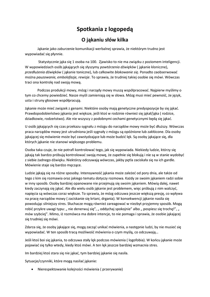 Spotkania z logopedą O jąkaniu słów kilka Jąkanie jako zaburzenie komunikacji werbalnej sprawia, że niektórym trudno jest wypowiadać się płynnie. Statystycznie jąka się 1 osoba na 100. Zjawisko to nie ma związku z poziomem inteligencji. W wypowiedziach osób jąkających się słyszymy powtórzenia dźwięków ( jąkanie kloniczne), przedłużenia dźwięków ( jąkanie toniczne), lub całkowite blokowanie się. Ponadto zaobserwować można pauzowanie, embolofazje, rewizje. To sprawia, że trudniej takiej osobie się mówi. Wówczas traci ona kontrolę nad swoją mową. Podczas produkcji mowy, mózg i narządy mowy muszą współpracować. Najpierw myślimy o tym co chcemy powiedzieć. Nasze myśli zamieniają się w słowa. Mózg musi mieć pewność, że język, usta i struny głosowe współpracują. Jąkanie może mieć związek z genami. Niektóre osoby mają genetyczne predyspozycje by się jąkać. Prawdopodobieństwo jąkania jest większe, jeśli ktoś w rodzinie również się jąkał/jąka ( rodzice, dziadkowie, rodzeństwo). Ale nie wszyscy z podobnymi cechami genetycznymi będą się jąkać. U osób jąkających się czas przekazu sygnału z mózgu do narządów mowy może być dłuższy. Wówczas praca narządów mowy jest utrudniona jeśli sygnały z mózgu są opóźnione lub zakłócone. Dla osoby jąkającej się mówienie może być zawstydzające lub może budzić lęk. Są osoby jąkające się, dla których jąkanie nie stanowi większego problemu. Osoba taka czuje, że nie potrafi kontrolować tego, jak się wypowiada. Niekiedy ludzie, którzy się jąkają tak bardzo próbują kontrolować swoją mowę, że zupełnie się blokują i nie są w stanie wydobyć z siebie żadnego dźwięku. Niektórzy odczuwają wówczas, jakby pętla zaciskała się na ich gardle. Mówienie staje się bardzo męczące. Ludzie jąkają się na różne sposoby. Intensywność jąkania może zależeć od pory dnia, ale także od tego z kim się rozmawia oraz jakiego tematu dotyczy rozmowa. Każdy ze swoim jąkaniem radzi sobie w inny sposób. Osoby bardziej opanowane nie przejmują się swoim jąkaniem. Mówią dalej, nawet kiedy zaczynają się jąkać. Ale dla wielu osób jąkanie jest problemem, więc próbują z nim walczyć, napięcia są wówczas coraz większe. To sprawia, że mózg odczuwa jeszcze większą presję, co wpływa na pracę narządów mowy ( zaciskanie się krtani, drgania). W konsekwencji jąkanie nasila się powodując silniejszy stres. Słuchacze mogą również zareagować w niezbyt przyjemny sposób. Mogą robić przykre uwagi typu: „ nie denerwuj się”, „ oddychaj spokojnie” albo „ pospiesz się trochę!”, „ mów szybciej”. Mimo, iż rozmówca ma dobre intencje, to nie pomaga i sprawia, że osobie jąkającej się trudniej się mówi. Zdarza się, że osoby jąkające się, mogą zacząć unikać mówienia, a następnie ludzi, by nie musieć się wypowiadać. W ten sposób tracą możliwość mówienia o czym myślą, co odczuwają… Jeśli ktoś boi się jąkania, to odczuwa stały lęk podczas mówienia ( logofobia). W końcu jąkanie może pojawiać się tylko wtedy, kiedy ktoś mówi. A ten lęk jeszcze bardziej wzmacnia stres. Im bardziej ktoś stara się nie jąkać, tym bardziej jąkanie się nasila. Sytuacje/czynniki, które mogą nasilać jąkanie: Nierespektowanie kolejności mówienia ( przerywanie) Brak odpowiedniej ilości snu Nadmierna ekscytacja ( np. egzaminy, przeprowadzka, narodziny…) Jak można pomóc osobie, która się jąka? W trakcie rozmowy – zachowuj się naturalnie ( tak jak z osobą niejąkającą się) Skupiaj się zawsze na tym, co osoba jąkająca chce powiedzieć, a nie na jej jąkaniu Niektóre osoby jąkające się nie lubią, gdy kończy się za nich wypowiedź. Terapia jąkania jest bardzo złożonym procesem, na który składają się oddziaływania psychologów, logopedów , którzy posiadają odpowiednie kwalifikacje z dziedziny balbutologopedii. W następnym artykule będzie można było przeczytać o wybranych metodach terapii jąkania. Źródło: 1. Materiały zebrane podczas Międzynarodowej Konferencji Logopedycznej pt. Zaburzenia płynności mowy - teoria i praktyka w Katowicach, 2014r. 2. Jąkanie, Zbigniew Tarkowski,2010 Joanna Bałazy Logopeda, glottodydaktyk, ZSP Mroków
