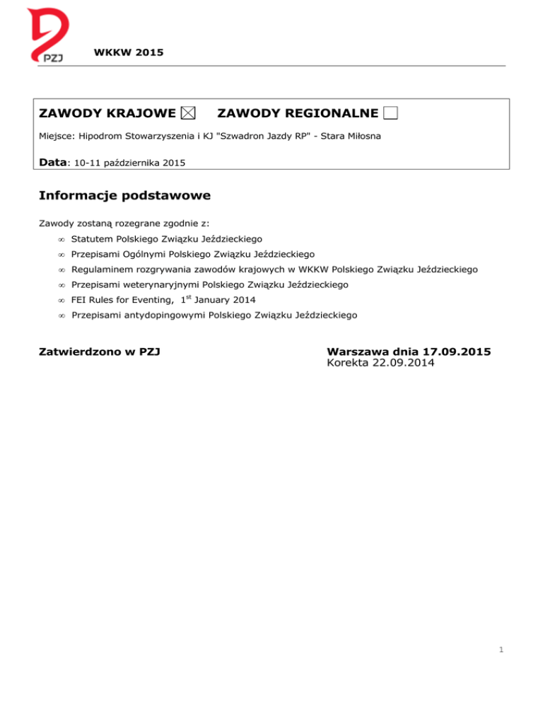 WKKW 2015 201 ZAWODY KRAJOWE ZAWODY REGIONALNE Miejsce: Hipodrom Stowarzyszenia i KJ "Szwadron Jazdy RP" - Stara Miłosna Data: 10-11 11 października 2015 Informacje podstawowe Zawody zostaną rozegrane zgodnie z: • Statutem Polskiego Związku Jeździeckiego • Przepisami Ogólnymi Polskiego Związku Jeździeckiego • Regulaminem rozgrywania zawodów krajowych w WKKW Polskiego Związku Jeździeckiego • Przepisami weterynaryjnymi Polskiego Związku Jeździeckiego • FEI Rules for Eventing, 1st January 201 2014 • Przepisami antydopingowymi Polskiego Związku Jeździeckiego Zatwierdzono w PZJ Warszawa dnia 17.09.2015 Korekta 22.09.2014 1 WKKW 2015 201 I. Sprawy Organizacyjne 1. Typ yp Zawodów Klasy: CNC/1* CNC/ P CNC/ L CNC/ LL Kuce PUCHAR POLSKI: POLSKI ELIMINACJE MISTRZOSTWA POLSKI Kategoria: Seniorzy FINAŁ MISTRZOSTWA REGIONALNE Młodzi Jeźdźcy Juniorzy Juniorzy Młod Młodsi Data: 10 10-11 października aździernika 2015 Miejsce : Warszawa Wesoła, Hipodrom Stara Miłosna Region : II Młodzicy 2. Organizator (kompletny kompletny adres) adres) Nazwa: Klub Jeździecki i Stowarzyszenie Szwadron Jazdy RP Adres: ul. Szkolna 14 Kod pocztowy: 05-077 077 Telefon: 0-601 601-299-564 Email : [email protected] Fax : Internet: 3. Komitet Organizacyjny Przewodniczący: Michał Wo ojnarowski jnarowski Dyrektor Zawodów: Andrzej Waś Biuro Zawodów: Agnieszka Kopka Rzecznik Prasowy: Prasowy Karolina Lasecka Dyrektor Techniczny: Marian Nowicki Szef Stajni: 4. Dane kontaktowe na miejscu zawodów: Adres: Szkolna 14 Tel.: Telefon kom.: 0-601-299 299-564 2 WKKW 2015 201 II. Osoby oficjalne 1. Komisja sędziowska Lp. Imię Nazwisko Funkcja KLASA 1. Paweł Sojecki Sędzia Główny zawodów LL,L,P,1* mini LL 2. Wojciech Frankowski Sędzia LL,L,P,1* mini LL 3. Krzysztof Tomaszewski Sędzia LL,L,P,1* mini LL 4. Elżbieta Wnuk Asystent Komisji LL,L,P,1* mini LL 2. Delegat Techniczny 1. Delegat Techniczny Imię Nazwisko: Nazwisko: 3. Sławomir Pietrzak Gospodarz Toru To – próba terenowa Imię Nazwisko: Marcin Michałek 4. Gospodarz Toru – próba skoków Imię Nazwisko: 5. Marcin Michałek Komisarze Szef komisarzy Imię Nazwisko: Krzysztof Kopacz 6. Lekarz arz weterynarii weterynar i Zawodów Zawodów Imię Nazwisko: Anna Smelczyńska Email Email: Adres: s: Tel. : 601350090 Fax : 7. Lekarz medycyny zawodów Imię Nazwisko: karetka pogotowia 8. Kowal Imię Nazwisko: Sławomir Naumiuk 3 WKKW 2015 201 III. 1. Warunki Techniczne Program zawodów Otwarte trasy krosu mini LL KLASA LL KLASA L KLASA P KLASA 1* Data/Godz. Data/Godz. Data/Godz. Data/Godz. Data/Godz. 9.10.201 .10.2015 15:00 09.10.2015 09 15:00 09.10.201 .10.2015 15:00 09 09.10.2015 15:00 09.10.201 .10.2015 15:00 10.10.201 .10.2015 8:00 11.10.201 .10.2015 8:30 0.10.2015 10 9:00 11 1.10.2015 9:30 10.10.201 .10.2015 10:00 11.10.201 .10.2015 10:30 0.10.2015 10 11:00 11 1.10.2015 11:30 10.10.201 .10.2015 12:00 11.11.201 .11.2015 12:30 10.01.201 .01.2015 13:00 11.10.201 .10.2015 15:00 10 0.10.2015 14:00 11 1.10.2015 15:00 10.10.201 .10.2015 15:00 11.10.201 .10.2015 15:00 10 0.10.2015 16:00 11 1.10.2015 15:00 10.10.201 .10.2015 17:00 11.10.201 .10.2015 15:00 1szy Przegląd Koni 1szy Start Ujeżdzenie 1szy Start kros 3ci Przegląd Koni 1szy Start Skoki Wręczanie nagród 2. Ujeżdżenie FEI 2015 20 1* A P - 1*A PZJ 2009 2009 L i LL PZJ 2014 Mini LL - Program Krajowy LL PZJ 2014 2 3. PRÓBA TERENOWA KLASA LL odcinek Typ podłoża: podłoża Długość : D Trawa , piach Tempo Ilośc skoków Max: 450m/min 12 - 16 Odcinek dcinek Typ podłoża: Długość : D Trawa , piach Tempo Ilośc skoków Ilośc 470-500 500 m/min 15 - 20 1600 1600-2000 KLASA L 1600--2500 4 WKKW 2015 201 KLASA P odcinek Typ podłoża: Długość : Tempo Ilośc skoków D Trawa , piach 1600 1600-2800 500 - 520 m/min 20 - 25 CNC1* odcinek Typ podłoża: Długość : Tempo Ilośc skoków D Trawa , piach 2400 2400-3200 00 520 m/min max. 29 klasa mini LL odcinek Typ podłoża: Długość : Tempo Ilośc skoków D Trawa, piach 900 900-1350 max 420 m/min 7-11 4. SKOKI Typ podłoża Dystans (m) Tempo (m/min) mini LL KLASA LL KLASA L KLASA P CNC1* 250 250-400 250-400 250-450 450 300 300-450 CNC1* 300 300 325 325 350 11 13 Ilośc przeszkód/skoków 9 Ilość przeszkód 8 IV. 9 8 11 8-10 10 10-11/13 11/13 Nagrody Miejsce I II III mini LL Nagrody rzeczowe Nagrody rzeczowe Nagrody rzeczowe LL Nagrody rzeczowe Nagrody rzeczowe Nagrody rzeczowe L Nagrody rzeczowe P 400 PLN CNC1* 600 PLN Nagrody rzeczowe 300 PLN 400 PLN Nagrody rzeczowe 250 PLN 300 PLN 950 PLN 200 PLN 1500 PLN IV SUMA Flots dla min 25% % koni uczestniczących w konkursie 5 WKKW 2015 201 V. ZGŁOSZENIA 1. Terminy zgłoszeń Zgłoszenia ostateczne ( min.10 dni przed ) Data :30 :30 września 2015 Zgłoszenia należy nadsyłać: Nazwa Marek Guz Adres: Telefon: 503030444 kod pocztowy: Email: [email protected] Listy startowe będą dostępne do wglądu od godz. 18.00 dnia: 09.10.2015 na stronie swiatkoni.pl ; voltahorse.pl; voltahorse.pl; facebook-Organizacja facebook Organizacja Zawodów Skokowych 2. Opłaty Klasa Mini LL/LL LL L P CNC 1* boks Opłata (PLN) 150 175 200 225 230 Podłączenie do prądu 100 zł/dzień krajowy program badań antydopingowych ntydopingowych koni (od CNC1*) 15 UWAGA ! Przedpłaty obowiązują TYLKO zawodników biorących boksy. Nie przyjmujemy wpłat za CAŁOŚĆ. ( wpisowe do uiszczenia w BIURZE ZAWODÓW ) Opłata w wysokości 230 PLN zostanie zapłacona do dnia 4 października 2015 Nazwa Banku: PKO SA Adres dres odbiorcy: Mazowiecka 55 Kod pocz.odbiorcy: 05-077 077 Nazwa Odbiorcy: Andrzej Waś Numer konta: 25 1240 2702 1111 0010 1543 1131 3. Oferta pobytu Hotele: Lista hoteli : Hotele: Lista hoteli : Bella Vista Adres: Trakt Brzeski (Wesoła) 99, Warszawa Telefon:22 773 21 61 Hotel Villa Park Wesoła ul. 1 Praskiego Pułku 89 05-077 05 077 Warszawa tel. (22) 773-61-30 773 30 Gościniec Warszawa Wesoła Trakt Brzeski 90A (22) 773773-20-98 3.2 Konie :Stajnie ajnie zostaną udostępnione dla koni koni od dnia 9 p