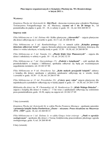 Plan imprez organizowanych w Książnicy Płockiej im. Wł. Broniewskiego w lutym 2011 r. Wystawy: Książnica Płocka (ul. Kościuszki 6): Mój Płock - doroczna wystawa prac członków Płockiego Towarzystwa Fotograficznego im. Al. Macieszy, czynna od 1 do 28 lutego br., od poniedziałku do piątku w godz. 10 – 18, w soboty w godz. 10 - 14, tel. 024 268 00 33 Imprezy stałe Filia biblioteczna nr 1 (ul. Zielona 40): Kółko plastyczne „Akwarelki” – zajęcia plastyczne dla dzieci odbywają się w czwartki w godz. 16-17, tel. 24 268 00 48 Filia biblioteczna nr 3 (ul. Rembielińskiego 11): w ramach cyklu „Książka pomaga dzieciom odkrywać świat” - zajęcia literacko-plastyczne promujące literaturę dziecięcą dla dzieci w wieku szkolnym, w każdą środę w godz. 15.30 – 16.30, tel. 24 268 00 50 Filia biblioteczna nr 5 (ul. Tumska 11): „Płocki Klub Gier Planszowych” – zajęcia dla dzieci i młodzieży w soboty w godz. 10 – 14, tel. 24 262 32 55 Filia biblioteczna nr 7 (ul. Gierzyńskiego 17): „Podróż z książkami” – cykl spotkań dla przedszkolaków o książce i bibliotece; spotkania odbywać się będą po wcześniejszym uzgodnieniu terminów, tel. 24 263 67 80 Filia biblioteczna nr 9 (ul. Orzechowa 5a): „Koło małych przyjaciół książek” zabawy z książką dla dzieci, spotkania z udziałem opiekunów odbywają się w wtorki, środy i czwartki w godz. 10.30 – 11.30, tel. 24 266 87 06 Filia biblioteczna nr 12 (ul. Przyszkolna 22): „Cztery pory roku” zajęcia plastyczne dla najmłodszych czytelników odbywają się w każdy piątek w godz. 15 – 16.30, tel. 24 264 13 09 Biblioteka dla dzieci im. W. Chotomskiej (ul. H. Sienkiewicza 2): „Klub Małego Dziecka” – zajęcia z książką dla dzieci w wieku 2 – 5 lat wraz z opiekunami odbywają się codziennie poza poniedziałkiem; godz. 10.30, zapisy na zajęcia tel. 24 262 27 69 3 luty (czwartek) Książnica Płocka (ul. Kościuszki 6): w cyklu Płocka Premiera Miesiąca - spotkanie autorskie i promocja książki Jacka Pawłowicza „Znane – nieznane. Prasa niezależna na Mazowszu 1976 –1989”, godz. 18, tel. 24 268 00 33 Filia biblioteczna nr 1 (ul. Zielona 1): w cyklu Ginący świat zwierząt – „Ptaki w ogrodzie zoologicznym”- spotkanie dla dzieci z Teresą Gołębiowską pracownikiem płockiego ogrodu zoologicznego, godz. 9, tel. 24 268 00 48 8 luty (wtorek) Filia biblioteczna nr 1 (ul. Zielona 1): w cyklu Europejska wiosna - „Gry i zabawy Unii Europejskiej” spotkanie dla dzieci z panią Katarzyną Szczawińską- Kamelską pracownikiem punktu informacyjnego Europe Direct w Płocku, godz. 9, tel. 24 268 00 48 8 luty (wtorek) Filia biblioteczna nr 1 (ul. Zielona 1): w cyklu Europejska wiosna - „Co Unia Europejska robi aby...” spotkanie dla dzieci z panią Katarzyną Szczawińską-Kamelską pracownikiem punktu informacyjnego Europe Direct w Płocku, godz. 10.30, tel. 24 268 00 48 8 luty (wtorek) Biblioteka dla dzieci (ul. Sienkiewicza 2): „Złości i inne trudności - jak radzić sobie z trudnymi zachowaniami małych dzieci” - spotkanie adresowane do młodych rodziców prowadzone przez Małgorzatę Paćkowską i Katarzynę Podolewską, specjalistów z Poradni Psychologiczno-Pedagogicznej nr 2 w Płocku, godz. 16.30, tel. 24 262 27 69 FERIE W BIBLIOTECE Filia biblioteczna nr 1 (ul. Zielona 1): „Muminkowe bajanie i majsterkowanie” - zabawy słowne i plastyczne z tekstem przy muzyce, zabawy z chustą animacyjną, quizy, rebusy, nauka piosenki; spotkania w poniedziałki, wtorki, środy, czwartki, piątki w godz. 11.00 – 12.30, tel. 24 268 00 48 Filia biblioteczna nr 3 (ul. Rembielińskiego 11): „Zima z książką” - gry i zabawy literackoplastyczne, w poniedziałki, wtorki, środy, czwartki i piątki w godz. 12.00 – 13.00, tel. 24 268 00 50 14 lutego (poniedziałek) Walentynkowe serduszka miłości – zajęcia literacko – plastyczne 15 lutego, 22 lutego (wtorek) Quizy literackie – zajęcia promujące literaturę dziecięcą 16 lutego (środa) Zima wkoło, jest wesoło - zagadki pantomimą, rebusy i zagadki obrazkowe 17 lutego (czwartek) Bałwanki – zajęcia literackie w połączeniu z zajęciami plastycznymi (w oparciu o wiersz W. Chotomskiej – Dziesięć bałwanków) 18 lutego (piątek) Sztuczki ze sztuką – zajęcia plastyczne 21 lutego (poniedziałek) Pingwinki - zajęcia literackie opowiadanie Pingu i przyjaciele) w połączeniu z zajęciami plastycznymi (w oparciu o 23 lutego (środa) Muminki - zajęcia literackie w połączeniu z zajęciami plastycznymi (w oparciu o opowiadanie T. Jansson – Zima Muminków) 24 lutego (czwartek) Tajemnice zwierząt na dalekiej północy – zajęcia literacko – plastyczne 25 lutego (piątek) Zimowe pejzaże – zajęcia plastyczne Filia biblioteczna nr 4 (ul. Krzywoustego 3): Ferie w bibliotece - zajęcia edukacyjne we wtorki, czwartki i piątki w godz. 12.00 – 13.30, tel. 24 263 34 28 15 lutego, 22 lutego (wtorki) „Pod moim łóżkiem nie mieszka potwór” – na podstawie dziecięcej literatury fantastycznej mali czytelnicy będą układać własne opowiadania 17 lutego, 24 lutego (czwartki) „Witraż piękny – kolorowy” – za pomocą różnych technik plastycznych dzieci wykonają witraże 18 lutego, 25 lutego (piątki) „Zabawa w grupie jest OK” – zajęcia z wykorzystaniem gier planszowych Filia biblioteczna nr 5 (ul. Tumska 11): „Spotkania w planszolandii” – wtorki, piątki po wcześniejszym uzgodnieniu godzin, tel. 24 262 32 55 Filia biblioteczna nr 7 (ul. Gierzyńskiego 17): „Nauka przez zabawę” - zajęcia edukacyjne dla małych czytelników we wtorki, środy, czwartki i piątki w godz. 11.00 – 13.00, tel. 24 263 67 80 15 lutego, 22 lutego (wtorki) Gry, quizy i zagadki literackie 16 lutego, 23 lutego (środy) Poznajemy kraje Unii Europejskiej – Włochy 17 lutego, 24 lutego (czwartek) Zajęcia plastyczne 18 lutego, 25 lutego (piątki) www.sieciaki.pl – poznajemy be