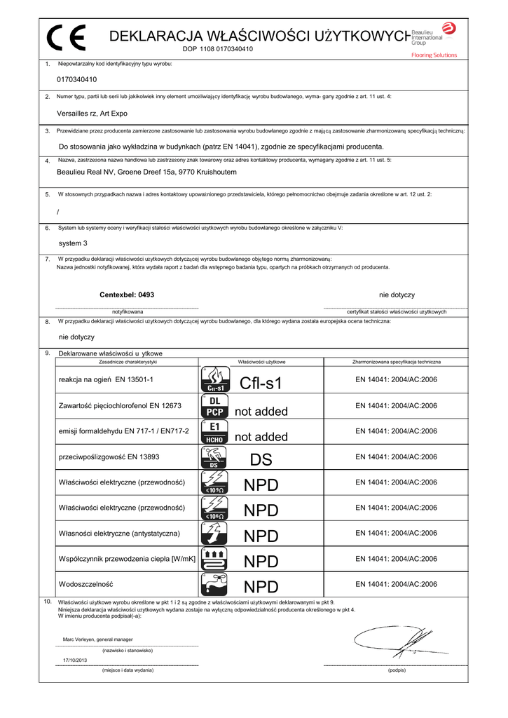 DEKLARACJA WŁAŚCIWOŚCI UŻYTKOWYCH DOP 1108 0170340410 1. Niepowtarzalny kod identyfikacyjny typu wyrobu: 0170340410 2. Numer typu, partii lub serii lub jakikolwiek inny element umożliwiający identyfikację wyrobu budowlanego, wyma- gany zgodnie z art. 11 ust. 4: Versailles rz, Art Expo 3. Przewidziane przez producenta zamierzone zastosowanie lub zastosowania wyrobu budowlanego zgodnie z mającą zastosowanie zharmonizowaną specyfikacją techniczną: Do stosowania jako wykładzina w budynkach (patrz EN 14041), zgodnie ze specyfikacjami producenta. 4. Nazwa, zastrzeżona nazwa handlowa lub zastrzeżony znak towarowy oraz adres kontaktowy producenta, wymagany zgodnie z art. 11 ust. 5: Beaulieu Real NV, Groene Dreef 15a, 9770 Kruishoutem 5. W stosownych przypadkach nazwa i adres kontaktowy upoważnionego przedstawiciela, którego pełnomocnictwo obejmuje zadania określone w art. 12 ust. 2: / 6. System lub systemy oceny i weryfikacji stałości właściwości użytkowych wyrobu budowlanego określone w załączniku V: system 3 7. W przypadku deklaracji właściwości użytkowych dotyczącej wyrobu budowlanego objętego normą zharmonizowaną: Nazwa jednostki notyfikowanej, która wydała raport z badań dla wstępnego badania typu, opartych na próbkach otrzymanych od producenta. 8. Centexbel: 0493 nie dotyczy notyfikowana certyfikat stałości właściwości użytkowych W przypadku deklaracji właściwości użytkowych dotyczącej wyrobu budowlanego, dla którego wydana została europejska ocena techniczna: nie dotyczy 9. Deklarowane właściwości u ytkowe Zasadnicze charakterystyki reakcja na ogień EN 13501-1 Zawartość pięciochlorofenol EN 12673 emisji formaldehydu EN 717-1 / EN717-2 przeciwpoślizgowość EN 13893 10. Właściwości użytkowe Zharmonizowana specyfikacja techniczna Cfl-s1 EN 14041: 2004/AC:2006 not added not added EN 14041: 2004/AC:2006 EN 14041: 2004/AC:2006 DS EN 14041: 2004/AC:2006 Właściwości elektryczne (przewodność) NPD EN 14041: 2004/AC:2006 Właściwości elektryczne (przewodność) NPD EN 14041: 2004/AC:2006 Własności elektryczne (antystatyczna) NPD EN 14041: 2004/AC:2006 Współczynnik przewodzenia ciepła [W/mK] NPD EN 14041: 2004/AC:2006 Wodoszczelność NPD EN 14041: 2004/AC:2006 Właściwości użytkowe wyrobu określone w pkt 1 i 2 są zgodne z właściwościami użytkowymi deklarowanymi w pkt 9. Niniejsza deklaracja właściwości użytkowych wydana zostaje na wyłączną odpowiedzialność producenta określonego w pkt 4. W imieniu producenta podpisał(-a): Marc Verleyen, general manager (nazwisko i stanowisko) 17/10/2013 (miejsce i data wydania) (podpis)