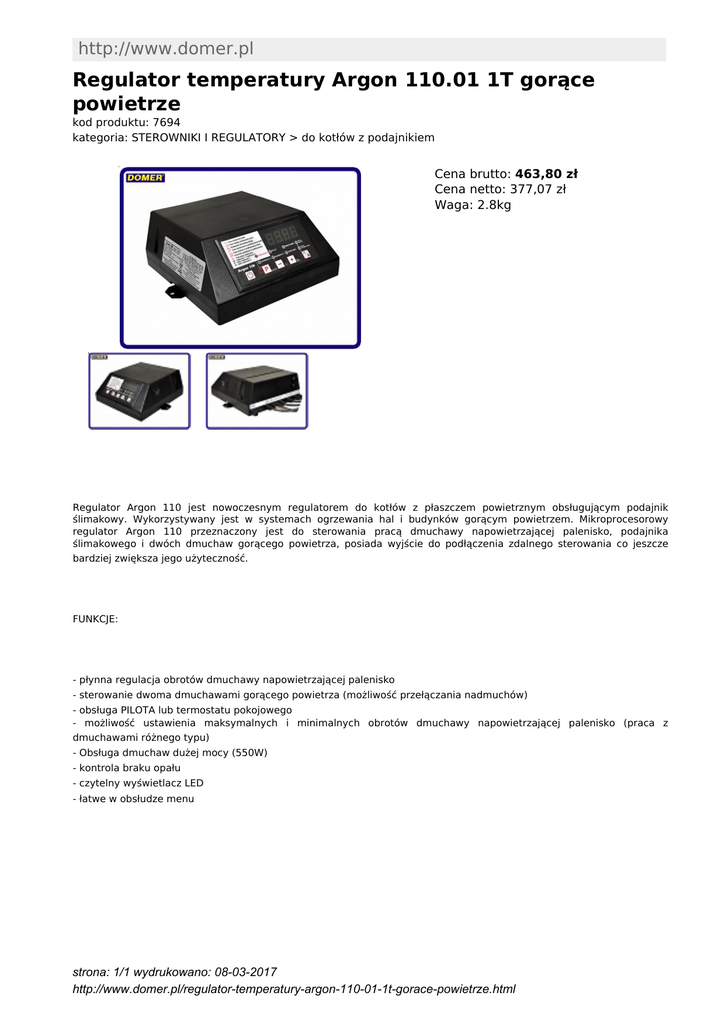 http://www.domer.pl Regulator temperatury Argon 110.01 1T gorące powietrze kod produktu: 7694 kategoria: STEROWNIKI I REGULATORY > do kotłów z podajnikiem Cena brutto: 463,80 zł Cena netto: 377,07 zł Waga: 2.8kg Regulator Argon 110 jest nowoczesnym regulatorem do kotłów z płaszczem powietrznym obsługującym podajnik ślimakowy. Wykorzystywany jest w systemach ogrzewania hal i budynków gorącym powietrzem. Mikroprocesorowy regulator Argon 110 przeznaczony jest do sterowania pracą dmuchawy napowietrzającej palenisko, podajnika ślimakowego i dwóch dmuchaw gorącego powietrza, posiada wyjście do podłączenia zdalnego sterowania co jeszcze bardziej zwiększa jego użyteczność. FUNKCJE: - płynna regulacja obrotów dmuchawy napowietrzającej palenisko - sterowanie dwoma dmuchawami gorącego powietrza (możliwość przełączania nadmuchów) - obsługa PILOTA lub termostatu pokojowego - możliwość ustawienia maksymalnych i minimalnych obrotów dmuchawy napowietrzającej palenisko (praca z dmuchawami różnego typu) - Obsługa dmuchaw dużej mocy (550W) - kontrola braku opału - czytelny wyświetlacz LED - łatwe w obsłudze menu strona: 1/1 wydrukowano: 08-03-2017 http://www.domer.pl/regulator-temperatury-argon-110-01-1t-gorace-powietrze.html