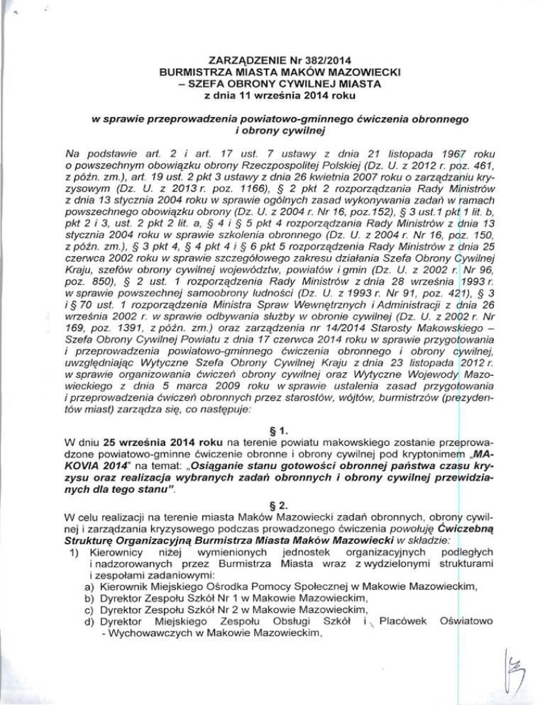 ZARZĄDZENIE Nr 382/2014 BURMISTRZA MIASTA MAKÓW MAZOWIECKI - SZEFA OBRONY CYWILNEJ MIASTA z dnia 11 września 2014 roku w sprawie przeprowadzenia powiatowo-gminnego i obrony cywilnej ćwiczenia obronnego Na podstawie art. 2 i art. 17 ust. 7 ustawy z dnia 21 listopada 1967 roku o powszechnym obowiązku obrony Rzeczpospolitej Polskiej (Oz. U. z 2012 r. poz. 461, z późno zm.), art. 19 ust. 2 pkt 3 ustawy z dnia 26 kwietnia 2007 roku o zarządzaniu kry zysowym (Oz. U. z 2013 r. poz. 1166), § 2 pkt 2 rozporządzania Rady Ministrów z dnia 13 stycznia 2004 roku w sprawie ogólnych zasad wykonywania zadań w ramach powszechnego obowiązku obrony (Oz. U. z 2004 r. Nr 16, poz. 152), § 3 ust. 1 pkt 1 lit. b, pkt 2 i 3, ust. 2 pkt 2 lit. a, § 4 i § 5 pkt 4 rozporządzania Rady Ministrów z dnia 13 stycznia 2004 roku w sprawie szkolenia obronnego (Oz. U. z 2004 r. Nr 16, poz. 150, z późn. zm.), § 3 pkt 4, § 4 pkt 4 i § 6 pkt 5 rozporządzenia Rady Ministrów z dnia 25 czerwca 2002 roku w sprawie szczegółowego zakresu działania Szefa Obrony Cywilnej Kraju, szefów obrony cywilnej województw, powiatów i gmin (Oz. U. z 2002 r. Nr 96, poz. 850), § 2 ust. 1 rozporządzenia Rady Ministrów z dnia 28 września 1993 r. w sprawie powszechnej samoobrony ludności (Oz. U. z 1993 r. Nr 91, poz. 421),§ 3 i § 70 ust. 1 rozporządzenia Ministra Spraw Wewnętrznych i Administracji z dnia 26 września 2002 r. w sprawie odbywania służby w obronie cywilnej (Oz. U. z 2002 r. Nr 169, poz. 1391, z późn. zm.) oraz zarządzenia nr 14/2014 Starosty Makowskiego Szefa Obrony Cywilnej Powiatu z dnia 17 czerwca 2014 roku w sprawie przygotowania i przeprowadzenia powiatowo-gminnego ćwiczenia obronnego i obrony cywilnej, uwzględniając Wytyczne Szefa Obrony Cywilnej Kraju z dnia 23 listopada 2012 r. w sprawie organizowania ćwiczeń obrony cywilnej oraz Wytyczne Wojewody Mazo wieckiego z dnia 5 marca 2009 roku w sprawie ustalenia zasad przygotowania i przeprowadzenia ćwiczeń obronnych przez starostów, wójtów, burmistrzów (prezyden tów miast) zarządza się, co na stępuje: § 1. W dniu 25 września 2014 roku na terenie powiatu makowskiego zostanie przeprowa dzone powiatowo-gminne ćwiczenie obronne i obrony cywilnej pod kryptonimem "MA KOVlA 2014" na temat: " Osiąganie stanu gotowości obronnej państwa czasu kry zysu oraz realizacja wybranych zadań obronnych i obrony cywilnej przewidzia nych dla tego stanu". § 2. W celu realizacji na terenie miasta Maków Mazowiecki zadań obronnych , obrony cywil nej i zarządzania kryzysowego podczas prowadzonego ćwiczenia powoluję Ćwiczebną Strukturę Organizacyjną Burmistrza Miasta Maków Mazowiecki w składzie: 1) Kierownicy nlze) wymienionych jednostek organizacyjnych podległych i nadzorowanych przez Burmistrza Miasta wraz z wydzielonymi strukturami i zespołami zadaniowymi : a) Kierownik Miejskiego Ośrodka Pomocy Społecznej w Makowie Mazowieckim , b) Dyrektor Zespołu Szkół Nr 1 w Makowie Mazowieckim , c) Dyrektor Zespołu Szkół Nr 2 w Makowie Mazowieckim , d) Dyrektor Miejskiego Zespołu Obsługi Szkół I \. Placówek Oświatowo - Wychowawczych w Makowie Mazowieckim , 2) 3) 4) 5) 6) e) Prezes Miejskiego Przedsiębiorstwa Usług Komunalnych Sp. z 0 .0 . w Makowie Mazowieckim , Dwa składy zmian dyżurnych Stałego Dyżuru Burmistrza Miasta Maków Mazowiecki oraz kierowników wymienionych wyżej jednostek; Kierownicy Wydziałów wraz z zespołami zadaniowymi przewidzianymi w stosownych planach do realizacji zadań obronnych , obrony cywilnej i zarządzania kryzysowego; Komendant Drużyny Wykrywania i Alarmowania (DWA) wraz z obsadą etatową Punktu Alarmowania; Kierujący Akcją Kurierską, kurier-łącznik, dwóch kurierów-wykonawców oraz (apli kacyjnie) kurierzy przewidziani do rozwinięcia Akcji Kurierskiej w mieście Maków Mazowiecki ; Członkowie Miejskiego Zespołu Zarządzania Kryzysowego. § 3. 1) 2) 3) Gotowość systemu łączności osiągnąć do godziny 13.00 dnia 24 września br. Od godziny 13.00 być w gotowości do sprawdzenia systemu łączności szczebla wojewódzkiego , powiatowego i gminnego. Gotowość struktur wymienionych w § 2 osiągnąć do godziny 07.30 dnia 25 września br. §4. 1) 2) Realizacją zadań Na swojego podczas ćwiczenia będę kierował osobiście . wyznaczam Zastępcę Burmistrza Miasta . zastępcę § 5. Zadania należy realizować zgodnie z Kartami Realizacji Zadań Obronnych i Obrony Cywilnej oraz procedurami określonymi w Planie Zarządzania Kryzysowego metodą aplikacyjną z częściowym udziałem stanu osobowego ćwiczących struktur organizacyj nych oraz na mapach i planach . § 6. Miejsca rozwinięcia elementów wchodzących w skład Systemu Kierowania Burmistrza Miasta powinny być zgodne z ustaleniami zawartymi w stosownym Zarządzeniu Burmistrza Miasta oraz Kierowników struktur wymienionych w § 2. § 7. Koszty przeprowadzenia ćwiczenia pokryć ze środków własnych uczestników ćwiczenia . § 8. Kierowników jednostek podległych i nadzorowanych przez Burmistrza Miasta oraz Kierowników Wydziałów Urzędu Miejskiego, zobowiązuje się do: 1) osobistego kierowania realizacją zadań obronnych, obrony cywilnej i zarządzania kryzysowego przez podległe oraz nadzorowane struktury organizacyjne; 2) realizacji przedsięwzięć planistycznych , organizacyjnych i szkoleniowych mających na celu przygotowanie podległych pracowników do uczestnictwa w ćwiczeniu; 3) przygotowania dokumentacji ćwiczebnej oraz aktualizacja dokumentacji planistycznej dotyczącej wykonywania zadań obronnych , obrony cywilnej i zarządzania kryzysowego; fi 4) przestrzegania przepisów bezpieczeństwa i higieny pracy, przeciwpożarowych , ruchu drogowego oraz innych wynikających ze specyfiki realizowanych podczas ćwiczenia zadań ; 5) 6) zapewnienia ochrony informacji niejawnych oraz właściwego obiegu dokumen tów w trakcie przygotowania i prowadzenia ćwiczenia ; udzielenia instruktażu oraz dokonania s
