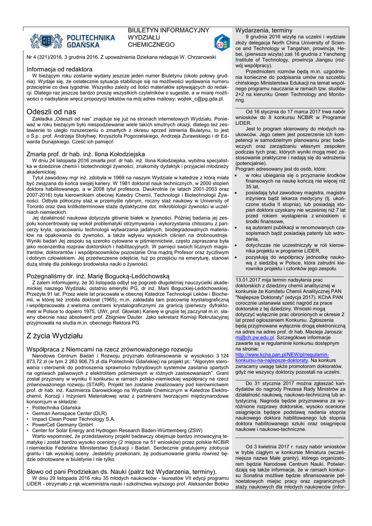 BIULETYN INFORMACYJNY WYDZIAŁU CHEMICZNEGO Nr 4 (321)/2016. 3 grudnia 2016. Z upoważnienia Dziekana redaguje W. Chrzanowski Informacja od redaktora W bieżącym roku zostanie wydany jeszcze jeden numer Biuletynu (około połowy grudnia). Wydaje się, że ostatecznie sytuacja stabilizuje się na możliwości wydawania numeru przeciętnie co dwa tygodnie. Wszystko zależy od ilości materiałów spływających do redakcji. Dlatego raz jeszcze bardzo proszę wszystkich czytelników o sugestie, a w miarę możliwości o nadsyłanie wręcz propozycji tekstów na mój adres mailowy: [email protected]. Odeszli od nas Zakładka „Odeszli od nas” znajduje się już na stronach internetowych Wydziału. Ponieważ w roku bieżącym było niespodziewanie wiele takich smutnych okazji, dlatego też zestawienie to uległo rozszerzeniu o zmarłych z okresu sprzed istnienia Biuletynu, to jest o Ś.p.: prof. Andrzeja Stołyhwę, Krzysztofa Pogorzelskiego, Andrzeja Żurawskiego i dr Edwarda Dunajskiego. Cześć ich pamięci! Zmarła prof. dr hab. inż. Ilona Kołodziejska W dniu 24 listopada 2016 zmarła prof. dr hab. inż. Ilona Kołodziejska, wybitna specjalistka w dziedzinie chemii i biotechnologii żywności, znakomity dydaktyk i przyjaciel młodzieży akademickiej. Tytuł zawodowy mgr inż. zdobyła w 1969 na naszym Wydziale w katedrze z którą miała być związana do końca swojej kariery. W 1981 doktorat nauk technicznych, w 2000 stopień doktora habilitowanego, a w 2008 tytuł profesora. Dwukrotnie (w latach 2001-2003 oraz 2007-2016) była kierownikiem obecnej Katedry Chemii, Technologii i Biotechnologii Żywności. Odbyła półroczny staż w przemyśle rybnym, roczny staż naukowy w University of Toronto oraz dwa krótkoterminowe staże dydaktyczne dot. mikrobiologii żywności w uczelniach niemieckich. Jej działalność naukowa dotyczyła głównie białek w żywności. Później badania jej zespołu koncentrowały się wokół problematyki otrzymywania i wykorzystania chitozanu z pancerzy kryla, opracowaniu technologii wytwarzania jadalnych, biodegradowalnych materiałów na opakowania do żywności, a także wpływu wysokich ciśnień na drobnoustroje. Wyniki badań Jej zespołu są szeroko cytowane w piśmiennictwie, często zapraszana była jako recenzentka rozpraw doktorskich i habilitacyjnych. W pamięci swoich licznych magistrantów, doktorantów i współpracowników pozostanie Ona mądrą Profesor oraz życzliwym i dobrym człowiekiem. Jej przedwczesne odejście, tuż po przejściu na emeryturę, stanowi dużą stratę dla polskiego środowiska nauki o żywności. Pożegnaliśmy dr. inż. Marię Bogucką-Ledóchowską Z żalem informujemy, że 30 listopada odbył się pogrzeb długoletniej nauczycielki akademickiej naszego Wydziału, ostatnio emerytki PG, dr inż. Marii Boguckiej-Ledóchowskiej. Przeżyła 91 lat. Przez wiele lat pracowała w obecnej Katedrze Technologii Leków i Biochemii, w której też zrobiła doktorat (1965), m.in. zakładała tam pracownię krystalograficzną i współpracowała z wieloma centrami krystalograficznymi za granicą (pierwszy dyfraktometr w Polsce to dopiero 1975, UWr, prof. Głowiak) Karierę w grupie tej zaczynał m.in. sławny obecnie nasz absolwent prof. Zbigniew Dauter. Jako sekretarz Komisji Rekrutacyjnej przyjmowała na studia m.in. obecnego Rektora PG. Z życia Wydziału Współpraca z Niemcami na rzecz zrównoważonego rozwoju Narodowe Centrum Badań i Rozwoju przyznało dofinansowanie w wysokości 3 124 873,72 zł (w tym 2 263 906,75 zł dla Politechniki Gdańskiej) na projekt pt.: "Algorytm sterowania i sterownik do podnoszenia sprawności hybrydowych systemów zasilania opartych na ogniwach paliwowych z elektrolitem polimerowym w różnych zastosowaniach”. Grant został przyznany w wyniku II konkursu w ramach polsko-niemieckiej współpracy na rzecz zrównoważonego rozwoju (STAIR). Projekt ten zostanie zrealizowany pod kierownictwem prof. dr hab. inż. Kazimierza Darowickiego na Wydziale Chemicznym w Katedrze Elektrochemii, Korozji i Inżynierii Materiałowej wraz z partnerami tworzącymi międzynarodowe konsorcjum w składzie: • Politechnika Gdańska • German Aerospace Center (DLR) • Impact Clean Power Technology S.A. • PowerCell Germany GmbH • Center for Solar Energy and Hydrogen Research Baden-Württemberg (ZSW) Warto wspomnieć, że przedstawiony projekt badawczy obejmuje bardzo innowacyjną tematykę i został bardzo wysoko oceniony (2 miejsce na 51 wniosków) przez polskie NCBiR i niemieckie Federalne Ministerstwo Edukacji i Badań. Serdecznie gratulujemy zdobycia grantu i tak wysokiej oceny. Jesteśmy przekonani, żę podsumowanie grantu również będzie odnotowane w biuletynie i nie tylko. Słowo od pani Prodziekan ds. Nauki (patrz też Wydarzenia, terminy). W dniu 29 listopada 2016 roku 35 młodych naukowców - laureatów VII edycji programu LIDER - otrzymało z rąk wiceministra nauki i szkolnictwa wyższego prof. Aleksander Bobko Wydarzenia, terminy 9 grudnia 2016 wizytę na uczelni i wydziale złoży delegacja North China University of Science and Technology w Tangshan, prowincja, Hebei, (pierwsza wizyta) zaś 16 grudnia z Yancheng Institute of Technology, prowincja Jiangsu (rozwój współpracy). Przedmiotem rozmów będą m.in. uzgodnienia konieczne do podpisania umów na szczeblu chińskiego Ministerstwa Edukacji na temat wspólnego programu nauczania w ramach tzw. studiów 2+2 na kierunku Green Technology and Monitoring. _______________________________________ Od 16 stycznia do 17 marca 2017 trwa nabór wniosków do 8 konkursu NCBiR w Programie LIDER. Jest to program skierowany do młodych naukowców. Jego celem jest poszerzenie ich kompetencji w samodzielnym planowaniu prac badawczych oraz zarządzaniu własnym zespołem podczas tych prac, których wyniki mogą mieć zastosowanie praktyczne i nadają się do wdrożenia (potencjalnie). Program adresowany jest do osób, które: w roku ubiegania się o pr