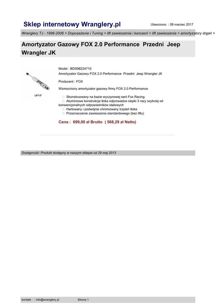 Sklep internetowy Wranglery.pl Utworzono : 08 marzec 2017 Wranglery TJ - 1996-2006 > Doposażenie i Tuning > lift zawieszenia i karoserii > lift zawieszenia > amortyzatory drgań > Amortyzator Gazowy FOX 2.0 Performance Przedni Jeep Wrangler JK Model : BDS98224710 Amortyzator Gazowy FOX 2.0 Performance Przedni Jeep Wrangler JK Producent : FOX Wzmocniony amortyzator gazowy firmy FOX 2.0 Performance � Skonstruowany na bazie wyczynowej serii Fox Racing � Aluminiowa konstrukcja tłoka odprowadza ciepło 3 razy szybciej od konwencjonalnych odpowiedników stalowych � Hartowany i podwójnie chromowany trzpień tłoka � Przeznaczenie zawieszenia standardowego (bez liftu) Cena : 699,00 zł Brutto ( 568,29 zł Netto) Dostępność: Produkt dostępny w naszym sklepie od 29 maj 2013 kontakt : - [email protected] Strona 1