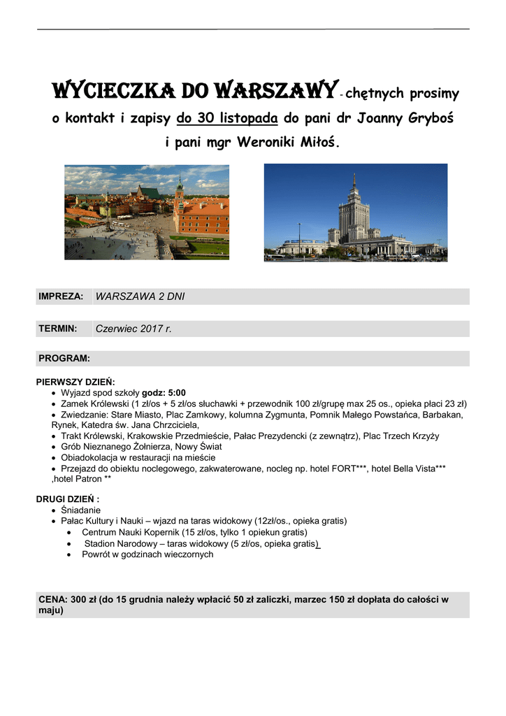 Wycieczka do WarszaWy - chętnych prosimy o kontakt i zapisy do 30 listopada do pani dr Joanny Gryboś i pani mgr Weroniki Miłoś. IMPREZA: WARSZAWA 2 DNI TERMIN: Czerwiec 2017 r. PROGRAM: PIERWSZY DZIEŃ: Wyjazd spod szkoły godz: 5:00 Zamek Królewski (1 zł/os + 5 zł/os słuchawki + przewodnik 100 zł/grupę max 25 os., opieka płaci 23 zł) Zwiedzanie: Stare Miasto, Plac Zamkowy, kolumna Zygmunta, Pomnik Małego Powstańca, Barbakan, Rynek, Katedra św. Jana Chrzciciela, Trakt Królewski, Krakowskie Przedmieście, Pałac Prezydencki (z zewnątrz), Plac Trzech Krzyży Grób Nieznanego Żołnierza, Nowy Świat Obiadokolacja w restauracji na mieście Przejazd do obiektu noclegowego, zakwaterowane, nocleg np. hotel FORT***, hotel Bella Vista*** ,hotel Patron ** DRUGI DZIEŃ : Śniadanie Pałac Kultury i Nauki – wjazd na taras widokowy (12zł/os., opieka gratis) Centrum Nauki Kopernik (15 zł/os, tylko 1 opiekun gratis) Stadion Narodowy – taras widokowy (5 zł/os, opieka gratis) Powrót w godzinach wieczornych CENA: 300 zł (do 15 grudnia należy wpłacić 50 zł zaliczki, marzec 150 zł dopłata do całości w maju)