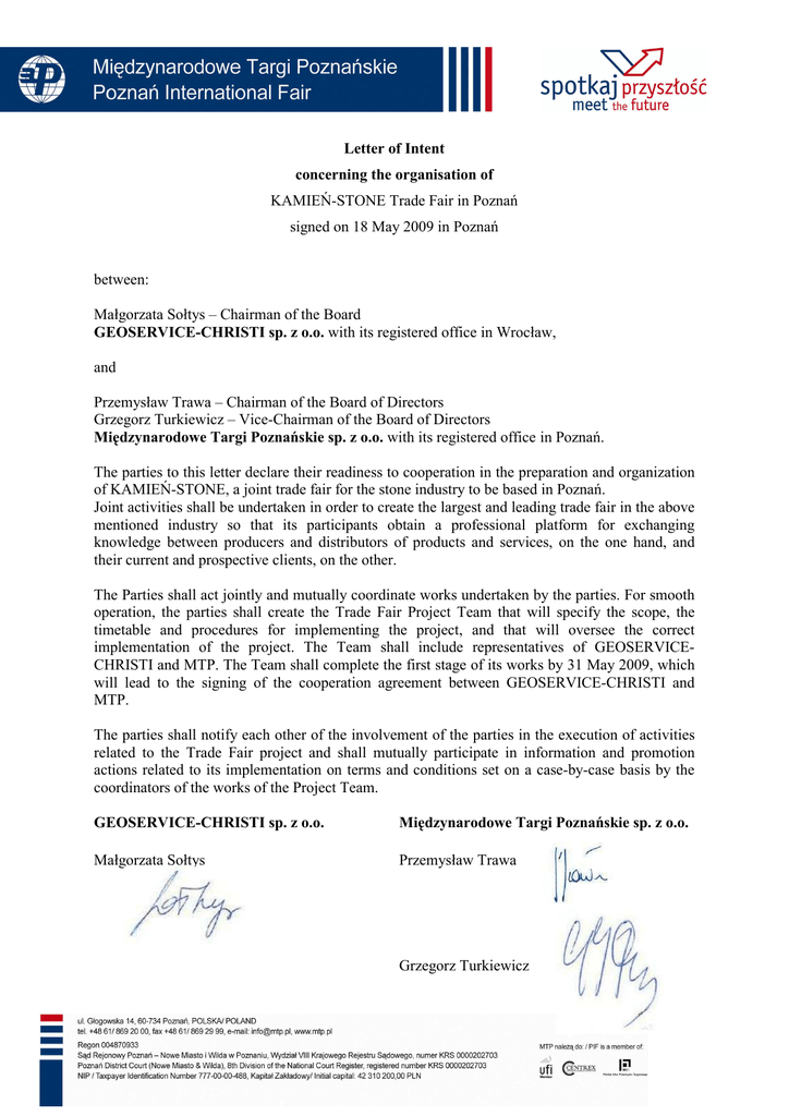 Letter of Intent concerning the organisation of KAMIEŃ-STONE Trade Fair in Poznań signed on 18 May 2009 in Poznań between: Małgorzata Sołtys – Chairman of the Board GEOSERVICE-CHRISTI sp. z o.o. with its registered office in Wrocław, and Przemysław Trawa – Chairman of the Board of Directors Grzegorz Turkiewicz – Vice-Chairman of the Board of Directors Międzynarodowe Targi Poznańskie sp. z o.o. with its registered office in Poznań. The parties to this letter declare their readiness to cooperation in the preparation and organization of KAMIEŃ-STONE, a joint trade fair for the stone industry to be based in Poznań. Joint activities shall be undertaken in order to create the largest and leading trade fair in the above mentioned industry so that its participants obtain a professional platform for exchanging knowledge between producers and distributors of products and services, on the one hand, and their current and prospective clients, on the other. The Parties shall act jointly and mutually coordinate works undertaken by the parties. For smooth operation, the parties shall create the Trade Fair Project Team that will specify the scope, the timetable and procedures for implementing the project, and that will oversee the correct implementation of the project. The Team shall include representatives of GEOSERVICECHRISTI and MTP. The Team shall complete the first stage of its works by 31 May 2009, which will lead to the signing of the cooperation agreement between GEOSERVICE-CHRISTI and MTP. The parties shall notify each other of the involvement of the parties in the execution of activities related to the Trade Fair project and shall mutually participate in information and promotion actions related to its implementation on terms and conditions set on a case-by-case basis by the coordinators of the works of the Project Team. GEOSERVICE-CHRISTI sp. z o.o. Międzynarodowe Targi Poznańskie sp. z o.o. Małgorzata Sołtys Przemysław Trawa Grzegorz Turkiewicz