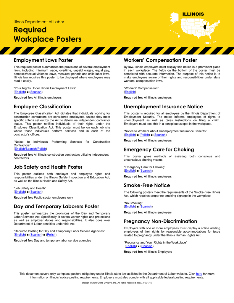 Illinois Department of Labor Required Workplace Posters Employment Laws Poster Workers’ Compensation Poster This required poster summarizes the provisions of several employment laws, including minimum wage, overtime, unpaid wages, equal pay, domestic/sexual violence leave, meal/rest periods and child labor laws. Illinois law requires this poster to be displayed where employees may read it easily. By law, Illinois employers must display this notice in a prominent place in each workplace. The fields on the bottom of the poster must be completed with accurate information. The purpose of this notice is to make employees aware of their rights and responsibilities under state workers’ compensation laws. “Your Rights Under Illinois Employment Laws” (English) ■ (Spanish) “Workers’ Compensation” (English) Required for: All Illinois employers Required for: All Illinois employers Employee Classification Unemployment Insurance Notice The Employee Classification Act dictates that individuals working for construction contractors are considered employees, unless they meet specific criteria set out by the Act to determine independent contractor status. This poster notifies individuals of their rights under the Employee Classification Act. This poster must be on each job site where those individuals perform services and in each of the contractor’s offices. This poster is required for all employers by the Illinois Department of Employment Security. The notice informs employees of rights to unemployment as well as gives instructions on filing a claim. Employers must post this in a conspicuous spot in the workplace. “Notice to Individuals Contractors” (English/Spanish/Polish) Required for: All Illinois employers Performing Services for Construction “Notice to Workers About Unemployment Insurance Benefits” (English) ■ (Polish) ■ (Spanish) Emergency Care for Choking Required for: All Illinois construction contractors utilizing independent contractors Job Safety and Health Poster This poster outlines both employer and employee rights and responsibilities under the Illinois Safety Inspection and Education Act, as well as the Illinois Health and Safety Act. “Job Safety and Health” (English) ■ (Spanish) This poster gives methods of assisting both conscious and unconscious choking victims. “Emergency Care for Choking” (English) ■ (Spanish) Required for: All Illinois employers Smoke-Free Notice The following posters meet the requirements of the Smoke-Free Illinois Act, which requires proper no-smoking signage in the workplace. Required for: Public-sector employers only Day and Temporary Laborers Poster “No Smoking” (English) ■ (Spanish) This poster summarizes the provisions of the Day and Temporary Labor Services Act. Specifically, it covers worker rights and protections as well as employer duties and responsibilities. It also goes over Department of Labor penalties under this Act. Required for: All Illinois employers “Required Posting for Day and Temporary Labor Service Agencies” (English) ■ (Spanish) ■ (Polish) Required for: Day and temporary labor service agencies Pregnancy Non-Discrimination Employers with one or more employees must display a notice alerting employees of their rights for reasonable accommodations for issue related to pregnancy under the Illinois Human Rights Act. “Pregnancy and Your Rights in the Workplace” (English) ■ (Spanish) Required for: All Illinois Employers This document covers only workplace posters obligatory under Illinois state law as listed in the Department of Labor website. Click here for more information on Illinois’ notice-posting requirements. Employers must also comply with all applicable federal posting requirements. Design © 2010-2015 Zywave, Inc. All rights reserved. Rev. JPA 1/15 Your Rights Under Illinois Employment Laws ILLINOIS MINIMUM WAGE $7.75 PER HOUR $8.00 PER HOUR $8.25 PER HOUR Beginning July 1, 2008 Beginning July 1, 2009 Beginning July 1, 2010 Minimum Wage & Overtime Equal Pay for Equal Work Child Labor • Coverage: Applies to employers with 4 or more employees. Certain workers are not covered by the Minimum Wage Law and some workers may be paid less than the minimum wage under limited conditions. For more information, visit our website. • Tipped Employees: Must be paid at least 60% of the applicable minimum wage. If an employee’s tips combined with the wages from the employer do not equal the minimum wage, the employer must make up the difference. • Overtime: Most hourly employees and some salaried employees are covered by the overtime law and must be compensated at time and one-half of their regular pay for hours worked over 40 in a workweek. Hotline: 1-800-478-3998 Equal Pay Act Requires employers to pay equal wages to men and women doing the same or substantially similar work, unless such wage differences are based upon a seniority system, a merit system, or factors other than gender. Hotline: 1-866-EPA-IDOL Workers under Age 16 • Children under the age of 14 may not work in most jobs, except under limited conditions. • 14 and 15-year-olds may work if the following requirements are met: Unpaid Wages Wage Payment and Collection Act • Employees must receive their final compensation, including earned wages, vacation pay, commissions and bonuses on their next regularly scheduled payday. • Unauthorized deductions from paychecks are not allowed except as specified by law. Phone: 312-793-2808 Domestic or Sexual Violence Leave Victims’ Economic Security and Safety Act Provides employees who are victims of domestic or sexual violence, or who have family members who are victims, with up to 12 weeks of unpaid leave during a 12-month period. Phone: 312-793-6797 Meal and Rest Periods One Day Rest in Seven Act • Provides employees with 24 consecutive hours of rest each calendar week. • Employers may obtain permits from the Department allowing employees to voluntarily work seven consecu