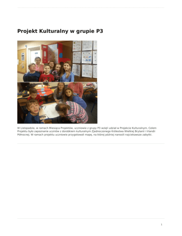 Projekt Kulturalny w grupie P3 W Listopadzie, w ramach Miesiąca Projektów, uczniowie z grupy P3 wzięli udział w Projekcie Kulturalnym. Celem Projektu było zapoznanie uczniów z dorobkiem kulturalnym Zjednoczonego Królestwa Wielkiej Brytanii i Irlandii Północnej. W ramach projektu uczniowie przygotowali mapę, na której później nanosili najciekawsze zabytki. 1