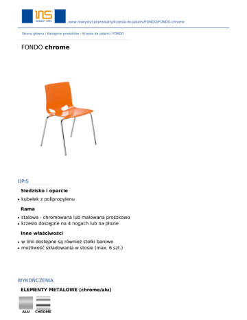 www.nowystyl.pl/produkty/krzesla-do-jadalni/FONDO/FONDO-chrome Strona główna / Kategorie produktów / Krzesła do jadalni / FONDO FONDO chrome OPIS Siedzisko i oparcie ● kubełek z polipropylenu Rama ● ● stalowa - chromowana lub malowana proszkowo krzesło dostępne na 4 nogach lub na płozie Inne właściwości ● ● w linii dostępne są również stołki barowe możliwość składowania w stosie (max. 6 szt.) WYKOŃCZENIA ELEMENTY METALOWE (chrome/alu) ALU CHROME TWORZYWO SZTUCZNE (FONDO) Gloss White Gloss Ecru Gloss Lime Green Gloss Orange Gloss Red WYMIARY wysokość krzesła: 445 wysokość podłokietników: 410 Wszelkie prawa zastrzeżone © 2013 Grupa Nowy Styl KONTAKT Nowy Styl Sp. z o.o. Pużaka 49 38-400 Krosno Infolinia: 0801 177-291 Tel. 13 43 76 100 Fax: 13 43 62 732 [email protected] www.nowystyl.com Dział Sprzedaży Krajowej Pużaka 49 38-400 Krosno Tel. 13 43 76 100 Dział Marketingu Warszawska 15 32-086 Węgrzce Tel. 12 63 98 602 Gloss Purple Gloss Anthracite
