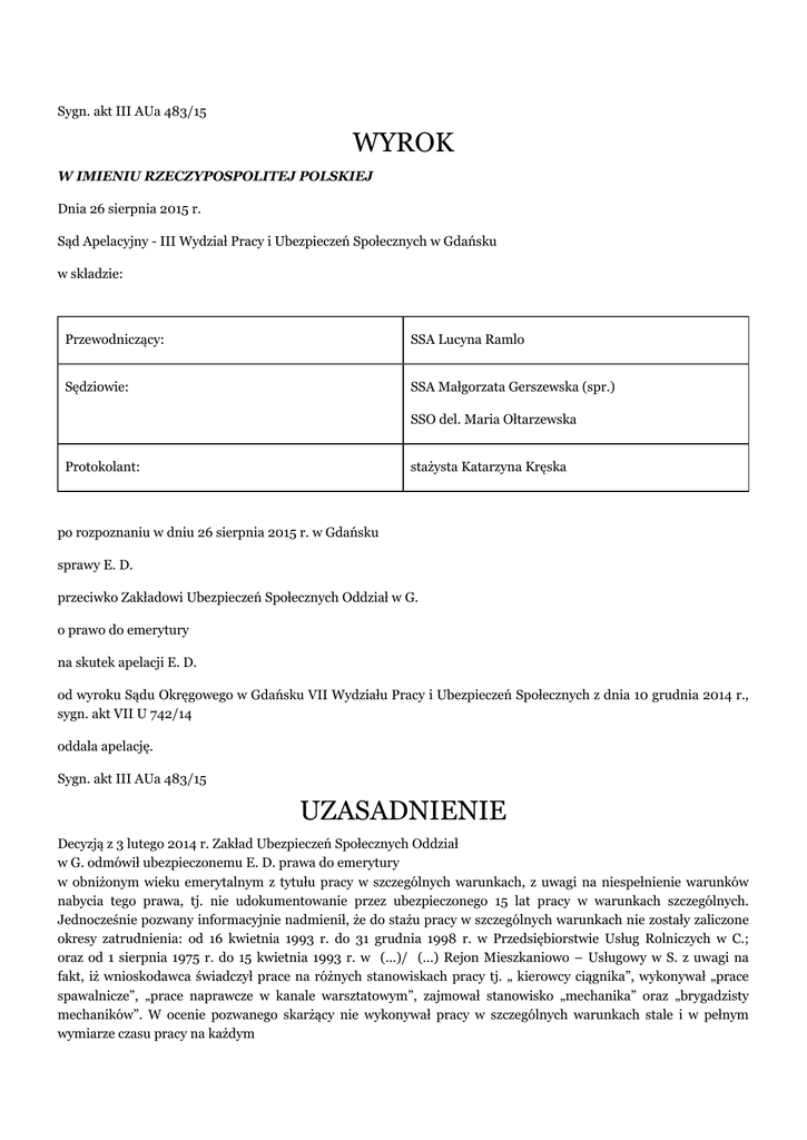 Sygn. akt III AUa 483/15 WYROK W IMIENIU RZECZYPOSPOLITEJ POLSKIEJ Dnia 26 sierpnia 2015 r. Sąd Apelacyjny - III Wydział Pracy i Ubezpieczeń Społecznych w Gdańsku w składzie: Przewodniczący: SSA Lucyna Ramlo Sędziowie: SSA Małgorzata Gerszewska (spr.) SSO del. Maria Ołtarzewska Protokolant: stażysta Katarzyna Kręska po rozpoznaniu w dniu 26 sierpnia 2015 r. w Gdańsku sprawy E. D. przeciwko Zakładowi Ubezpieczeń Społecznych Oddział w G. o prawo do emerytury na skutek apelacji E. D. od wyroku Sądu Okręgowego w Gdańsku VII Wydziału Pracy i Ubezpieczeń Społecznych z dnia 10 grudnia 2014 r., sygn. akt VII U 742/14 oddala apelację. Sygn. akt III AUa 483/15 UZASADNIENIE Decyzją z 3 lutego 2014 r. Zakład Ubezpieczeń Społecznych Oddział w G. odmówił ubezpieczonemu E. D. prawa do emerytury w obniżonym wieku emerytalnym z tytułu pracy w szczególnych warunkach, z uwagi na niespełnienie warunków nabycia tego prawa, tj. nie udokumentowanie przez ubezpieczonego 15 lat pracy w warunkach szczególnych. Jednocześnie pozwany informacyjnie nadmienił, że do stażu pracy w szczególnych warunkach nie zostały zaliczone okresy zatrudnienia: od 16 kwietnia 1993 r. do 31 grudnia 1998 r. w Przedsiębiorstwie Usług Rolniczych w C.; oraz od 1 sierpnia 1975 r. do 15 kwietnia 1993 r. w (...)/ (...) Rejon Mieszkaniowo – Usługowy w S. z uwagi na fakt, iż wnioskodawca świadczył prace na różnych stanowiskach pracy tj. „ kierowcy ciągnika”, wykonywał „prace spawalnicze”, „prace naprawcze w kanale warsztatowym”, zajmował stanowisko „mechanika” oraz „brygadzisty mechaników”. W ocenie pozwanego skarżący nie wykonywał pracy w szczególnych warunkach stale i w pełnym wymiarze czasu pracy na każdym z wskazanych powyżej stanowisk. Odwołanie od powyższej decyzji wywiódł ubezpieczony, wnosząc o zmianę zaskarżonej decyzji oraz przyznanie mu prawa do emerytury. W uzasadnieniu odwołania wnioskodawca wyjaśnił, że świadczył prace w charakterze mechanika wykonującego prace naprawcze w kanałach warsztatowych przez okres 24 lat. W odpowiedzi na odwołanie pozwany Zakład Ubezpieczeń Społecznych Oddział w G. wniósł o jego oddalenie, podtrzymując stanowisko zawarte w treści zaskarżonej decyzji. Wyrokiem z 10 grudnia 2014 r. Sąd Okręgowy w Gdańsku – VII Wydział Pracy i Ubezpieczeń Społecznych, sygn. akt VII U 742/14 - oddalił odwołanie, wskazując następujące motywy rozstrzygnięcia: Ubezpieczony E. D., urodzony dnia (...), 27 listopada 2013 r. wystąpił z wnioskiem o przyznanie prawa do emerytury. Ubezpieczony nie jest członkiem Otwartego Funduszu Emerytalnym, a wymagany prawem wiek 60 lat ukończył (...) W toku postępowania przed organem rentowym na dzień 31 grudnia 1998 r. skarżący udowodnił 27 lat, 5 miesięcy i 2 dni okresów składkowych i nieskładkowych. Zaskarżoną w niniejszej sprawie decyzją z dnia 3 lutego 2014 r. Zakład Ubezpieczeń Społecznych Oddział w G. odmówił ubezpieczonemu E. D. prawa do emerytury w obniżonym wieku emerytalnym z tytułu pracy w szczególnym warunkach, z uwagi na niespełnienie warunków nabycia tego prawa, tj. nie udokumentowania przez ubezpieczonego 15 lat pracy w warunkach szczególnych. W spornym okresie czasu tj. od 1 sierpnia 1975 r. do 15 kwietnia 1993 r. wnioskodawca był zatrudniony w pełnym wymiarze czasu pracy Gospodarstwie (...) Skarbu Państwa w C. na stanowisku mechanika, brygadzisty mechaników. Wskazane gospodarstwo w zakresie swojej działalności zajmowało się produkcją zwierzęcą i tuczem trzody chlewnej. Zakład pracy, w którym zatrudniony był skarżący, składał się z kilku części, które ze względów sanitarnych odpowiednio znajdowały się wewnątrz oraz na zewnątrz fermy. Na zewnątrz mieścił się zakład mechaniczny zewnętrzny, w którym pracę świadczył ubezpieczony, oczyszczalnia ścieków oraz kotłownia. Wewnątrz fermy również istniał dział mechaniczny, w którym wykonywano naprawy różnego typu sprzętów oraz urządzeń używanych przy produkcji trzody (z wyłączeniem pojazdów). W warsztacie zewnętrznym na stałe zatrudniony był tylko jeden pracownik – ubezpieczony. Nie było w nim innych mechaników ani elektryków. Wykonując przypisane zadania wnioskodawca korzystał okazjonalnie z pomocy kierowców oraz uczniów. Wewnątrz warsztatu, w którym prace świadczył ubezpieczony znajdowało się jedno stanowisko kanałowe oraz dwa stanowiska na których wykonywano naprawy nad posadzką. Do obowiązków skarżącego należało wykonywanie napraw pojazdów takich jak. np. wózki akumulatorowe, ciągniki, przyczepy, taczki. Szereg czynności należących do obowiązków ubezpieczonego wykonywana była przez niego w kanale. Tam wnioskodawca dokonywał napraw m. in. skrzyni biegów, silników. W trakcie zatrudnienia ubezpieczony zajmował się również naprawą nadwozi, tj. wykonywaniem prac, które nie wymagały zejścia do kanału. W związku z powyższym ubezpieczony naprawiał progi, zajmował się również wymianą zderzaków czy błotników. Większe naprawy – polegające np. na konieczności naprawy karoserii ubezpieczony oddawał do profesjonalnego warsztatu samochodowego. Wnioskodawca posiadał uprawnienia spawalnicze, niejednokrotnie zdarzało się, że musiał przyspawać określony element podczas wykonywania napraw w kanale. Dodatkowo od 1 sierpnia 1975 r. pracodawca powierzył skarżącemu obowiązki wyboru i dostawy tuczników z bloku na rampę załadowczą oraz rozładunek pasz. W sytuacji, w której brakowało ludzi do pracy osoby kierujące zakładem pracy zlecały wykonanie wskazanych powyżej czynności poszczególnym pracownikom – w tym także wnioskodawcy. Wybór oraz dostawa tuczników z bloku na rampę polegała na tym, że grupa pracowników oznakowywała trzodę, którą następnie płoszono, po to by przetransportować ją kolejno na przyczepę ciągnika, a następnie na rampę skąd trzoda b