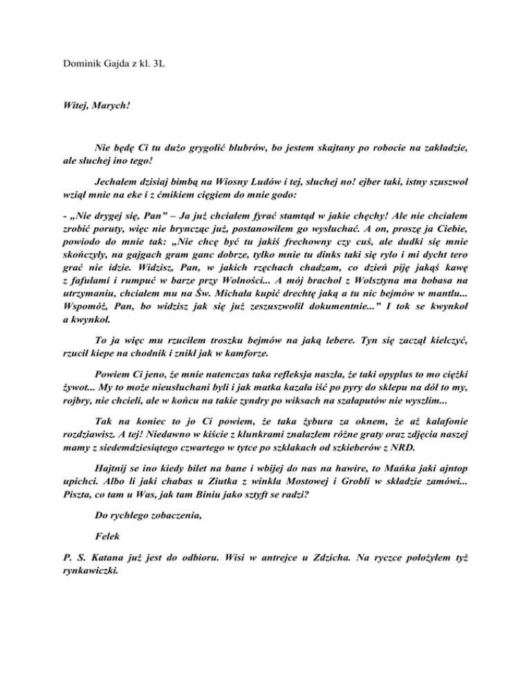 Dominik Gajda z kl. 3L Witej, Marych! Nie będę Ci tu duŜo grygolić blubrów, bo jestem skajtany po robocie na zakładzie, ale słuchej ino tego! Jechałem dzisiaj bimbą na Wiosny Ludów i tej, słuchej no! ejber taki, istny szuszwol wziął mnie na eke i z ćmikiem cięgiem do mnie godo: - „Nie drygej się, Pan” – Ja juŜ chciałem fyrać stamtąd w jakie chęchy! Ale nie chciałem zrobić poruty, więc nie bryncząc juŜ, postanowiłem go wysłuchać. A on, proszę ja Ciebie, powiodo do mnie tak: „Nie chcę być tu jakiś frechowny czy cuś, ale dudki się mnie skończyły, na gajgach gram ganc dobrze, tylko mnie tu dinks taki się rylo i mi dycht tero grać nie idzie. Widzisz, Pan, w jakich rzęchach chadzam, co dzień piję jakąś kawę z fafułami i rumpuć w barze przy Wolności... A mój brachol z Wolsztyna ma bobasa na utrzymaniu, chciałem mu na Św. Michała kupić drechtę jaką a tu nic bejmów w mantlu... WspomóŜ, Pan, bo widzisz jak się juŜ zeszuszwolił dokumentnie...” I tok se kwynkoł a kwynkoł. To ja więc mu rzuciłem troszku bejmów na jaką lebere. Tyn się zaczął kielczyć, rzucił kiepe na chodnik i znikł jak w kamforze. Powiem Ci jeno, Ŝe mnie natenczas taka refleksja naszła, Ŝe taki opyplus to mo cięŜki Ŝywot... My to moŜe nieusłuchani byli i jak matka kazała iść po pyry do sklepu na dół to my, rojbry, nie chcieli, ale w końcu na takie zyndry po wiksach na szałaputów nie wyszlim... Tak na koniec to jo Ci powiem, Ŝe taka Ŝybura za oknem, Ŝe aŜ kalafonie rozdziawisz. A tej! Niedawno w kiście z klunkrami znalazłem róŜne graty oraz zdjęcia naszej mamy z siedemdziesiątego czwartego w tytce po szklakach od szkieberów z NRD. Hajtnij se ino kiedy bilet na bane i wbijej do nas na hawire, to Mańka jaki ajntop upichci. Albo li jaki chabas u Ziutka z winkla Mostowej i Grobli w składzie zamówi... Piszta, co tam u Was, jak tam Biniu jako sztyft se radzi? Do rychłego zobaczenia, Felek P. S. Katana juŜ jest do odbioru. Wisi w antrejce u Zdzicha. Na ryczce połoŜyłem tyŜ rynkawiczki.