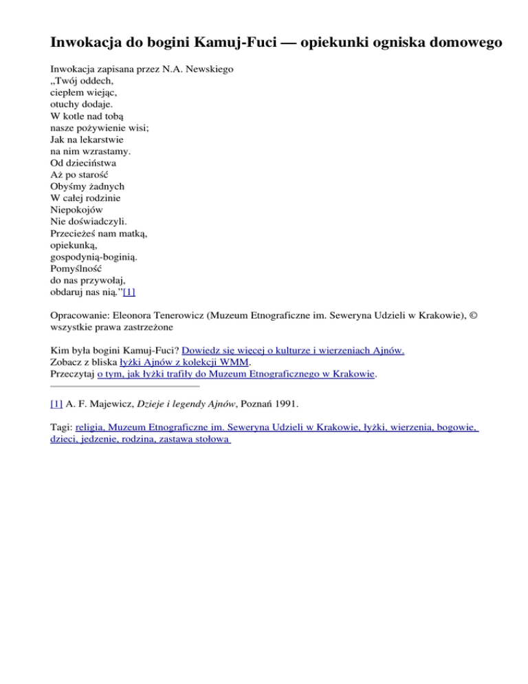 Inwokacja do bogini KamujFuci — opiekunki ogniska domowego Inwokacja zapisana przez N.A. Newskiego „Twój oddech, ciepłem wiejąc, otuchy dodaje. W kotle nad tobą nasze pożywienie wisi; Jak na lekarstwie na nim wzrastamy. Od dzieciństwa Aż po starość Obyśmy żadnych W całej rodzinie Niepokojów Nie doświadczyli. Przecieżeś nam matką, opiekunką, gospodyniąboginią. Pomyślność do nas przywołaj, obdaruj nas nią.”[1] Opracowanie: Eleonora Tenerowicz (Muzeum Etnograficzne im. Seweryna Udzieli w Krakowie), © wszystkie prawa zastrzeżone Kim była bogini KamujFuci? Dowiedz się więcej o kulturze i wierzeniach Ajnów. Zobacz z bliska łyżki Ajnów z kolekcji WMM. Przeczytaj o tym, jak łyżki trafiły do Muzeum Etnograficznego w Krakowie. [1] A. F. Majewicz, Dzieje i legendy Ajnów, Poznań 1991. Tagi: religia, Muzeum Etnograficzne im. Seweryna Udzieli w Krakowie, łyżki, wierzenia, bogowie, dzieci, jedzenie, rodzina, zastawa stołowa