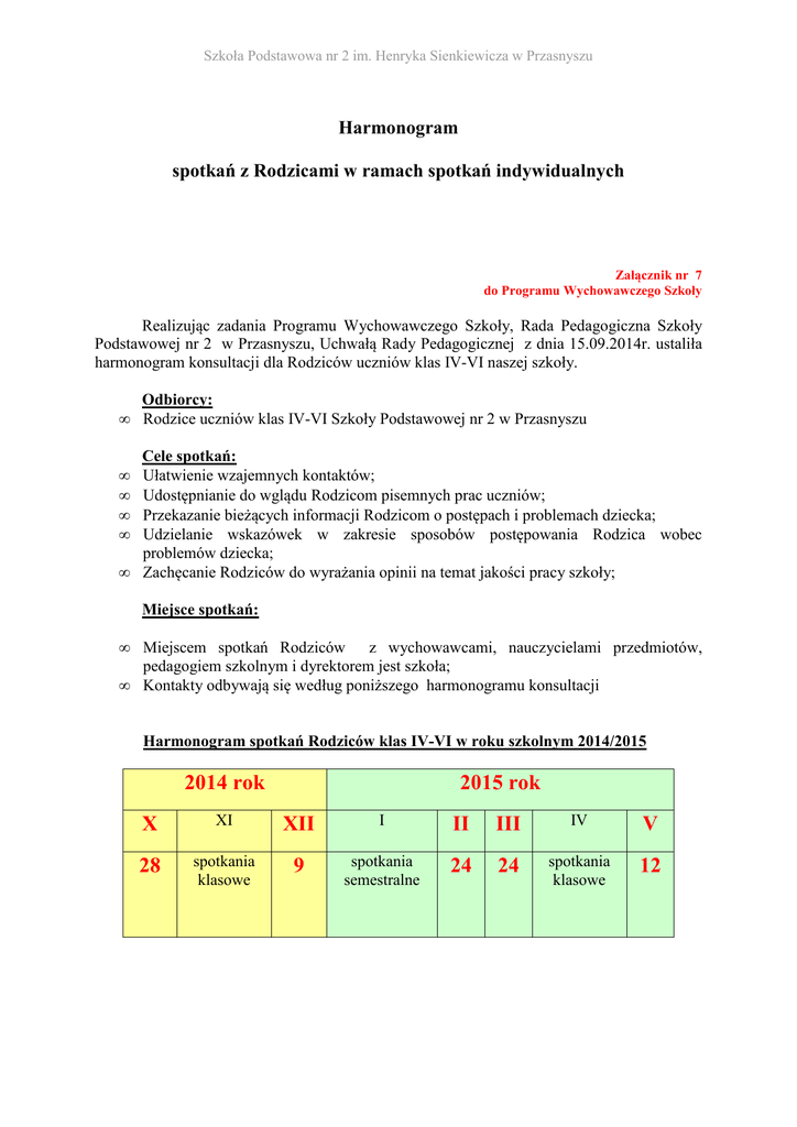 Szkoła Podstawowa nr 2 im. Henryka Sienkiewicza w Przasnyszu Harmonogram spotkań z Rodzicami w ramach spotkań indywidualnych Załącznik nr 7 do Programu Wychowawczego Szkoły Realizując zadania Programu Wychowawczego Szkoły, Rada Pedagogiczna Szkoły Podstawowej nr 2 w Przasnyszu, Uchwałą Rady Pedagogicznej z dnia 15.09.2014r. ustaliła harmonogram konsultacji dla Rodziców uczniów klas IV-VI naszej szkoły. Odbiorcy: • Rodzice uczniów klas IV-VI Szkoły Podstawowej nr 2 w Przasnyszu Cele spotkań: Ułatwienie wzajemnych kontaktów; Udostępnianie do wglądu Rodzicom pisemnych prac uczniów; Przekazanie bieżących informacji Rodzicom o postępach i problemach dziecka; Udzielanie wskazówek w zakresie sposobów postępowania Rodzica wobec problemów dziecka; • Zachęcanie Rodziców do wyrażania opinii na temat jakości pracy szkoły; • • • • Miejsce spotkań: • • Miejscem spotkań Rodziców z wychowawcami, nauczycielami przedmiotów, pedagogiem szkolnym i dyrektorem jest szkoła; Kontakty odbywają się według poniższego harmonogramu konsultacji Harmonogram spotkań Rodziców klas IV-VI w roku szkolnym 2014/2015 2014 rok 2015 rok X XI XII I II III IV V 28 spotkania klasowe 9 spotkania semestralne 24 24 spotkania klasowe 12