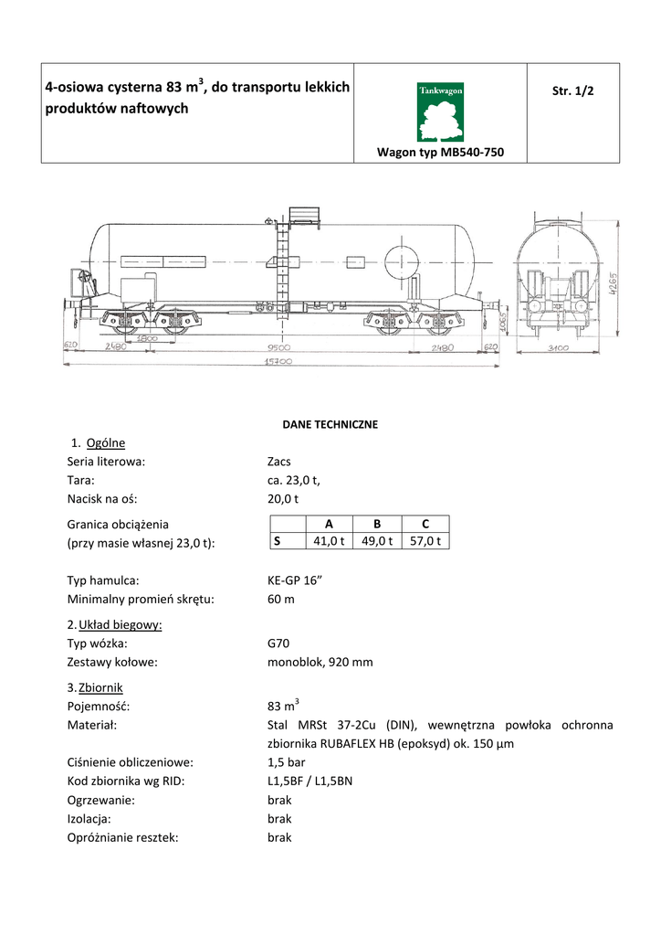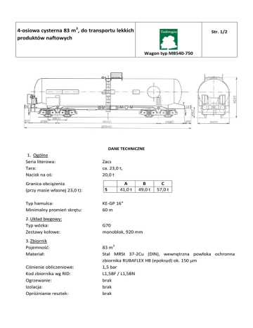 4-osiowa cysterna 83 m3, do transportu lekkich produktów naftowych Str. 1/2 Wagon typ MB540-750 DANE TECHNICZNE 1. Ogólne Seria literowa: Tara: Nacisk na oś: Granica obciążenia (przy masie własnej 23,0 t): Zacs ca. 23,0 t, 20,0 t S A 41,0 t B 49,0 t Typ hamulca: Minimalny promień skrętu: KE-GP 16” 60 m 2. Układ biegowy: Typ wózka: Zestawy kołowe: G70 monoblok, 920 mm 3. Zbiornik Pojemność: Materiał: Ciśnienie obliczeniowe: Kod zbiornika wg RID: Ogrzewanie: Izolacja: Opróżnianie resztek: C 57,0 t 83 m3 Stal MRSt 37-2Cu (DIN), wewnętrzna powłoka ochronna zbiornika RUBAFLEX HB (epoksyd) ok. 150 μm 1,5 bar L1,5BF / L1,5BN brak brak brak 4-osiowa cysterna 83 m3, do transportu lekkich produktów naftowych Str. 2/2 Wagon typ MB540-750 Wymuszone napowietrzanie Wahadło gazowe: 4. Urządzenia za- i wyładunkowe Właz zbiornika: Zawór denny: Trójnik: Zawory spustowe: brak brak 1-śrubowy DN500, w szczycie zbiornika DN100 „Gestra” obsługiwany z dołu (z poziomu toru) DN100 2 zawory zasuwowe DN100 nakręcane na trójnik spustowy, z przyłączem M130x6