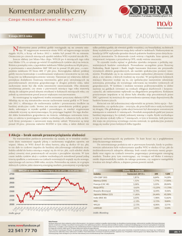 Komentarz analityczny Czego można oczekiwać w maju? 9 maja 2013 roku N iekorzystna passa polskiej giełdy rozciągnęła się na czwarty miesiąc. W najgorszym momencie strata WIG od tegorocznego szczytu sięgała 10,5%, a licząc od końca 2012 r. indeks był ponad 9% na minusie. Ostatecznie po czterech miesiącach spadek indeksu WIG wyniósł niecałe 8%. Jeszcze słabszy jest bilans blue chips. WIG20 po 4 miesiącach tego roku traci blisko 11%, co sytuuje go wśród 10 najsłabszych rynków akcji na świecie. Różnica pomiędzy nim, a japońskim indeksem Nikkei przekracza 40 pkt proc., w porównaniu z amerykańskim S&P 500 jest to ponad 20 pkt proc., a europejskim indeksem DJ Stoxx 600 17 pkt proc. Bezwzględna słabość polskiej giełdy mocno kontrastuje z oczekiwaniami większości inwestorów na ten rok, liczącymi na kilkunastoprocentowe wzrosty. Natomiast jej relatywna słabość powiększa dodatkowo frustrację inwestorów, gdyż przy utrzymujących się przewidywaniach ożywienia gospodarczego w drugiej połowie roku, takie zachowanie może być dla wielu inwestorów niezrozumiałe. Oba elementy uwydatniają pytanie, czy straty z pierwszych miesięcy tego roku stanowią okazję do zakupów przed silnymi zwyżkami w kolejnych miesiącach roku, czy jednak są ostrzeżeniem przed jeszcze większym rozczarowaniem. By rozstrzygnąć tę wątpliwość trzeba zrozumieć przyczyny słabości GPW. Składają się na nią nienaturalne mocne zachowanie naszej giełdy w IV kwartale 2012 r., skłaniające do realizowania zysków i przenoszenia środków na bardziej atrakcyjne rynki. Istotne jest znaczne spowolnienie polskiej gospodarki, uderzające w wyniki spółek i powodujące, że niezbyt wygórowane wskaźniki wyceny są niewystarczające, by przyciągać kapitał. Do tego dochodzi słaba koniunktura gospodarcza na świecie, osłabiająca notowania towarów, co uderza w postrzeganie rynków wschodzących, zwłaszcza tych, na których firmy powiązane z surowcami mają istotny udział. Wymowne są tutaj: ponad 20-proc. przecena walorów KGHM w tym roku, a także słabość nie Akcje – brak oznak przezwyciężania słabości Na warszawskim parkiecie potwierdza się zasada, że w trendzie zniżkowym dużo ważniejsze sygnały płyną z zachowania względem oporów, niż wsparć. Mimo, że WIG dotarł do silnej bariery, jaką są okolice 43 tys. pkt, to nie dało to rynkowi impulsu do bardziej zdecydowanego odrabiania strat. Indeks zdołał do końca miesiąca wspiąć się do 44 tys. pkt, czyli odrobić około jednej czwartej strat poniesionych od szczytu z początków stycznia. W tym czasie indeks rynków akcji z rynków wschodzących zniwelował ponad jedną trzecią spadków, a notowania na rynkach rozwiniętych wspięły się do nowego, najwyższego od czerwca 2008 roku, szczytu. Potwierdza się zatem, że w grupie słabszych rynków, jakie stanowią emerging markets, pozostajemy w podgrupie tylko polskiej giełdy, ale również giełdy rosyjskiej, czy brazylijskiej, na których firmy wydobywcze i paliwowe mają duży udział w indeksach. Niekorzystnie na kondycję GPW wpływała sprzedaż dużych pakietów banków przez dotychczasowych inwestorów. To drenowało rynek wtórny z kapitału. Inne sprawy, jak niepewność związana z przyszłością OFE, miały wtórne znaczenie. Te czynniki trzeba wpisać w globalne zjawiska związane z polityką najważniejszych banków centralnych. Prowadzone szczególnie przez Rezerwę Federalną, Bank Japonii i Bank Anglii luzowanie ilościowe nie przynosiło wyraźnych efektów gospodarczych, ale nasilało spekulacyjne postawy inwestorów. Przekładało się to na zainteresowanie najbardziej płynnymi rynkami akcji, a nie takimi, z których trudniej się wycofać. W perspektywie kolejnych miesięcy kluczowe wydaje się to, czy spekulacyjne nastawienie zdominuje notowania, prowadząc do wyraźnego oderwania się trendów rynkowych od gospodarczych. W krótkim i średnim terminie podtrzymywałoby to dobre nastroje na giełdach (również na rynkach obligacji skarbowych i korporacyjnych), ale niekorzystnie wpływało na długofalowe perspektywy. Kolejnym pozytywnym impulsem w tej sferze była obniżka stóp procentowych przez EBC i gotowość tej instytucji do wprowadzenia ujemnej stopy depozytowej dla banków komercyjnych. Kwiecień nie dał jednoznacznej odpowiedzi na pytanie, która opcja – fundamentalna, czy spekulacyjna – zwycięża, ale przechylił nieco szalę na korzyść tej drugiej. Dla globalnego rynku akcji kwiecień był dziewiątym wzrostowym miesiącem w ostatnich 11 miesiącach. Dorobek europejskich giełd jest jeszcze bardziej imponujący, bo zyskały jedenasty miesiąc z rzędu. Rynki wschodzące w tym okresie zyskały tylko w 7 miesiącach, w tym w kwietniu. Jeśli pierwsze dni maja nie przyniosą wyraźnego zwrotu notowań, to spekulacyjne postawy mogą się nasilać przez kolejnych kilka tygodni. najgorzej zachowujących się parkietów. To każe liczyć się z pogłębieniem dotychczasowego minimum. Do ostrożniejszego podejścia niż w pierwszym kwartale, kiedy to podstawowym założeniem było wykorzystanie spadku WIG w okolice 43 tys. pkt do średniookresowych zakupów, skłaniają: brak oznak ożywienia naszej gospodarki oraz regres na rynkach towarów, pogarszający postrzeganie emerging markets. Trudno przy tym rozstrzygnąć, czy trwające od blisko 4 miesięcy zniżki doprowadziłyby indeks do takiego poziomu, czy najpierw nastąpiłoby trwalsze niż dotąd odbicie, a dopiero potem powrót zniżek. Giełdy na świecie WIG20 w okresie 12 miesięcy (02.05.2012 – 30.04.2013) kwiecień 2013 r. 3M 12M USA (S&P 500) 1,81% 6,64% 14,28% Niemcy (DAX) 1,52% 1,77% 17,05% Francja (CAC 40) 3,36% 3,33% 20,04% 2400 Rosja (RTS) -3,62% -13,25% -11,73% 2300 Brazylia (Bovespa) -0,78% -6,44% -9,56% Japonia (Nikkei 225) 11,80% 24,44% 45,58% Indie (BSE 30) 3,55% -1,96% 12,62% WIG -2,18% -5,72% 9,66% WIG20 -2,15% -6,96% 3,51% mWIG40