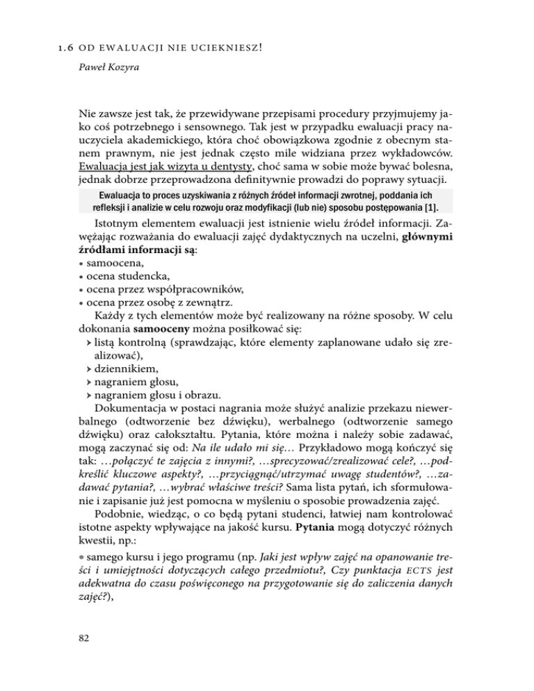 1.6 O D E W A L U A C J I N I E U C I E K N I E S Z ! Paweł Kozyra Nie zawsze jest tak, że przewidywane przepisami procedury przyjmujemy jako coś potrzebnego i sensownego. Tak jest w przypadku ewaluacji pracy nauczyciela akademickiego, która choć obowiązkowa zgodnie z obecnym stanem prawnym, nie jest jednak często mile widziana przez wykładowców. Ewaluacja jest jak wizyta u dentysty, choć sama w sobie może bywać bolesna, jednak dobrze przeprowadzona definitywnie prowadzi do poprawy sytuacji. Ewaluacja to proces uzyskiwania z różnych źródeł informacji zwrotnej, poddania ich refleksji i analizie w celu rozwoju oraz modyfikacji (lub nie) sposobu postępowania [1]. Istotnym elementem ewaluacji jest istnienie wielu źródeł informacji. Zawężając rozważania do ewaluacji zajęć dydaktycznych na uczelni, głównymi źródłami informacji są: • samoocena, • ocena studencka, • ocena przez współpracowników, • ocena przez osobę z zewnątrz. Każdy z tych elementów może być realizowany na różne sposoby. W celu dokonania samooceny można posiłkować się: → listą kontrolną (sprawdzając, które elementy zaplanowane udało się zrealizować), → dziennikiem, → nagraniem głosu, → nagraniem głosu i obrazu. Dokumentacja w postaci nagrania może służyć analizie przekazu niewerbalnego (odtworzenie bez dźwięku), werbalnego (odtworzenie samego dźwięku) oraz całokształtu. Pytania, które można i należy sobie zadawać, mogą zaczynać się od: Na ile udało mi się… Przykładowo mogą kończyć się tak: …połączyć te zajęcia z innymi?, …sprecyzować/zrealizować cele?, …podkreślić kluczowe aspekty?, …przyciągnąć/utrzymać uwagę studentów?, …zadawać pytania?, …wybrać właściwe treści? Sama lista pytań, ich sformułowanie i zapisanie już jest pomocna w myśleniu o sposobie prowadzenia zajęć. Podobnie, wiedząc, o co będą pytani studenci, łatwiej nam kontrolować istotne aspekty wpływające na jakość kursu. Pytania mogą dotyczyć różnych kwestii, np.: • samego kursu i jego programu (np. Jaki jest wpływ zajęć na opanowanie treści i umiejętności dotyczących całego przedmiotu?, Czy punktacja ECTS jest adekwatna do czasu poświęconego na przygotowanie się do zaliczenia danych zajęć?), 82 • warunków kształcenia (dostęp do literatury dla potrzeb danego kursu, zakres korzystania przez prowadzącego i uczestników z pomocy dydaktycznych, warunki nauki na zajęciach), • prowadzącego kurs itd. Jednocześnie mogą mieć charakter bardzo podstawowy*, np.: → czy prowadzący traktował studentów z szacunkiem? → czy był gotów udzielić dodatkowych wyjaśnień? → czy trudne zagadnienia były wyjaśniane jasno i precyzyjnie? → czy zajęcia odbywały się zgodnie z harmonogramem? → czy system ocen był sprawiedliwy? Mogą być ogólne – w jakim stopniu zgadzasz się ze stwierdzeniami: Jestem zadowolony z kursu jako całości lub bardziej szczegółowe - sięgać głębiej prowadzący większą uwagę przywiązywał do tego, co zapamiętałem niż co zrozumiałem, prowadzący włożył dużo wysiłku w analizę mojej pracy lub też dotyczyć organizacji kursu dostęp do aparatury był w zupełności wystarczający. Technicznie „pytania” zatem mogą być prośbą o ocenę stopnia prawdziwości pewnych stwierdzeń. Pytań nie może być za mało, gdyż nie można w takim przypadku scharakteryzować w pełni zachowania i umiejętności dydaktycznych określonych nauczycieli, ani za dużo, gdyż wypełniającego ankietę znuży to zajęcie. Pytania powinny być zróżnicowane w zależności od celu kształcenia i charakteru zajęć - odrębne pytania dla wykładów (Czy materiały dydaktyczne dotyczące wykładu były dostępne?, Czy wykłady przyczyniły się do zrozumienia i opanowania danej tematyki?), zajęć laboratoryjnych (Jaki był dostęp do aparatury? Czy była możliwość pracy samodzielnej? W jakim stopniu ćwiczenia laboratoryjne przyczyniły się do rozwoju umiejętności praktycznych?) itd. Niezwykle istotna jest umiejętność stymulowania aktywności studentów, która może być sprawdzana poprzez pytanie: Czy zajęcia mobilizowały do samodzielnej pracy i twórczego rozwiązywania problemów? Ocena studencka może być zrealizowana za pomocą: • kwestionariuszy (ankiet), • metaplanu,** • otwartej dyskusji, • snowballing (jawnego wprowadzania badacza i zapoznawania z innymi przez osoby z wewnątrz badanej grupy), • formalnej komisji. Można także pomyśleć o wykorzystaniu takich technicznych rozwiązań jak strony www lub skrzynki na „skargi i wnioski”. Ta ostatnia metoda ma na przykład tę zaletę, że możliwe jest uzyskanie natychmiastowej informacji. Na Uniwersytecie Jagiellońskim od roku akademickiego 2006/2007 ogólno**Wspólny dla wszystkich kierunków UJ trzon ankiety ewaluacyjnej, ponadto wydziały/instytuty mają prawo dołączenia 5 dalszych pytań, uwzględniających specyfikę nauczania. **Opis metody metaplanu podany jest w rozdziale 1.2.1. 83 uczelniany system informatyczny (USOS ) obsługuje również ankiety studenckie. Informacja zwrotna od współpracowników może także mieć różne formy realizacji: → opieka mentora (kierownika zakładu, pracowni, koordynatora kursu), → ewaluacja przez osobę na równorzędnym stanowisku, → wymiana doświadczeń. Prowadzenie ewaluacji napotyka na zarzuty i problemy, np. obawy, iż ankiety mogą być wykorzystane przeciwko wymagającym nauczycielom. Trzeba umieć znaleźć antidotum na te bolączki tak na własny użytek, jak i po to, by odeprzeć zarzuty sceptyków. Jednocześnie należy być świadomym ograniczeń, nie ulegać nadmiernym emocjom oraz unikać nadinterpretowania wyników. Do najpopularniejszych problemów należą [2]: 1. Konieczność wykorzystywania wielu źródeł informacji jest jednocześnie jedną z przyczyn możliwych kłopotów. Nie ma bowiem jednego, najlepszego, uniwer