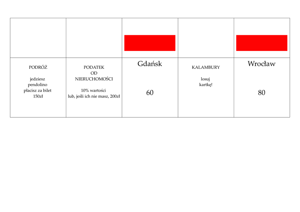 PODRÓŻ jedziesz pendolino płacisz za bilet 150zł PODATEK OD NIERUCHOMOŚCI 10% wartości lub, jeśli ich nie masz, 200zł Gdańsk KALAMBURY Wrocław losuj kartkę! 60 80 Sztokholm Göteborg 120 100 ? Malmö 100 PODRÓŻ płyniesz wodolotem na wyspy greckie, płacisz za bilet 200zł Nikozja Limassol ELEKTROWNIA WIATROWA Larnaka 150zł 160 140 dla wizytujących podatek od nieodnawialnych źródeł energii 140 Heraklion Ηράκλειο Iraklio Saloniki Θεσσαλονίκη Tesaloniki 120 120 KALAMBURY losuj kartkę! Ateny Αθήνα Athīīna 120 PODRÓŻ İstanbul Ankara czarterujesz jacht, by popłynąć na Półwysep Iberyjski 200zł 120 120 ? İzmir 120 Lizbona Porto Lisboa 280 260 KAMIEŃ,PAPIER,NOŻYCE wygrany w następnej kolejce może rzucić kostką jeszcze raz Braga 260 PODRÓŻ płyniesz promem, płacisz za bilet 200zł Helsinki 10 PYTAŃ Tampere Espoo 300 300 losuj kartkę! 320 Warszawa 320 PODATEK OD LUKSUSU 75zł Kraków 300 ? WIĘZIENIE z wizytą w więzieniu P ? Idziesz do więzienia! start za przejście przez start otrzymujesz 200zł ?