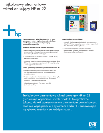 Trójkolorowy atramentowy wkład drukujcy HP nr 22 Czarny atramentowy wkład drukujcy HP nr 22 został opracowany z myl o uytkownikach indywidualnych poszukujcych niedrogiego rozwizania przy sporadycznych wydrukach. Wspaniałe kolorowe wydruki fotograficznej jakoci. • Imponujce kolory i trwałe zdjcia, dziki opatentowanym atramentom barwnikowym i zaawansowanej technologii atramentowych wkładów drukujcych. Łatwa instalacja i prosta obsługa. • Materiały eksploatacyjne do drukarek atramentowych i drukarki HP Inkjet zaprojektowano z myl o zapewnieniu stale doskonałej jakoci wydruków. • Opracowane z ogromn precyzj i dokładnie przetestowane materiały eksploatacyjne i drukarki doskonale ze sob współpracuj. • Dobra odpornoć na działanie wiatła – wydruki dłuej zachowuj ywe kolory. • Moliwoć przechowywania dokumentów przez długi okres. Tekst drukowany za pomoc atramentu HP pozostaje ostry i wyrany przez dłuszy czas. Zawsze ywe kolory wydruków wykonanych na drukarce HP. • Szeroka gama papierów do codziennego uytku oraz noników specjalnych zapewnia wyjtkowe rezultaty za kadym razem. • Niezawodny druk kart okolicznociowych, prac domowych, listów, wiadomoci poczty elektronicznej, materiałów pobranych z Internetu oraz raportów. • Jakoć i niezawodnoć HP to prosty wydruk i doskonałe rezultaty. Trójkolorowy atramentowy wkład drukujcy HP nr 22 gwarantuje wspaniałe, trwałe wydruki fotograficznej jakoci, dziki opatentowanym atramentom barwnikowym. Idealnie współpracuje z systemem druku HP, zapewniajc wyjtkowe rezultaty za kadym razem. Trójkolorowy atramentowy wkład drukujcy HP nr 22 Specyfikacja produktu Numer produktu C9352AE Opis Trójkolorowy atramentowy wkład drukujcy HP nr 22 Numer wyboru 22 Wymiary (dł. x szer. x głb.) 141 x 131 x 37 mm Masa 70g Informacje na temat wydajnoci znajduj si na stronie www.hp.com/pageyield © 2005 Hewlett-Packard Development Company, L.P. Specyfikacje zawarte w tym dokumencie mog bez uprzedzenia ulec zmianie. Wszystkie gwarancje udzielane w odniesieniu do produktów i usług HP okrelone zostały w owiadczeniach gwarancyjnych załczanych do kadego produktu i usługi. aden zapis niniejszego dokumentu nie moe być uwaany za dodatkow gwarancj. HP nie ponosi odpowiedzialnoci za błdy techniczne lub drukarskie w niniejszym dokumencie. Wicej informacji na temat materiałów eksploatacyjnych HP mona uzyskać pod adresem www.hp.pl 5983-2802PLE, 08/2005