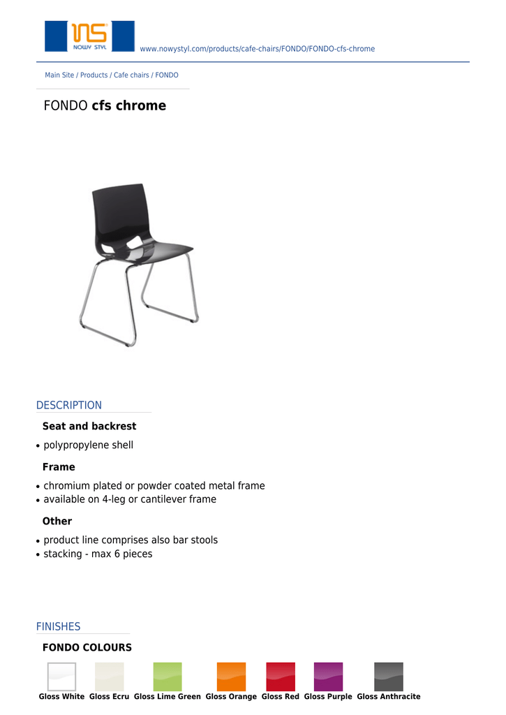 www.nowystyl.com/products/cafe-chairs/FONDO/FONDO-cfs-chrome Main Site / Products / Cafe chairs / FONDO FONDO cfs chrome DESCRIPTION Seat and backrest ● polypropylene shell Frame ● ● chromium plated or powder coated metal frame available on 4-leg or cantilever frame Other ● ● product line comprises also bar stools stacking - max 6 pieces FINISHES FONDO COLOURS Gloss White Gloss Ecru Gloss Lime Green Gloss Orange Gloss Red Gloss Purple Gloss Anthracite ELEMENTY METALOWE (chrome/kolor) ALU BLACK CHROME RAL-7016-Anthracite RAL-4006-Purple RAL-120-80-60-Lime-Green RAL-3020-Red RAL 2003 RAL-9003-White Orange DIMENSIONS All rights reserved 2013 Nowy Styl Group CONTACT Nowy Styl Sp. z o.o. Pużaka 49 38-400 Krosno Tel. +48 13 43 76 100 Fax +48 13 43 62 732 [email protected] Export Department Mięsowicza 6 38-400 Krosno Poland Tel. +48 13 43 76 111 [email protected] Marketing Department Warszawska 15 32-086 Węgrzce Poland Tel. +48 12 63 98 602