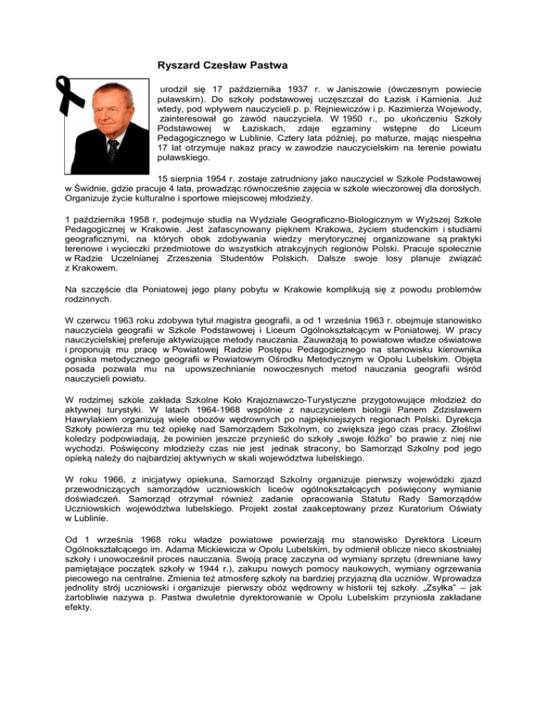 Ryszard Czesław Pastwa urodził się 17 października 1937 r. w Janiszowie (ówczesnym powiecie puławskim). Do szkoły podstawowej uczęszczał do Łazisk i Kamienia. Już wtedy, pod wpływem nauczycieli p. p. Rejniewiczów i p. Kazimierza Wojewody, zainteresował go zawód nauczyciela. W 1950 r., po ukończeniu Szkoły Podstawowej w Łaziskach, zdaje egzaminy wstępne do Liceum Pedagogicznego w Lublinie. Cztery lata później, po maturze, mając niespełna 17 lat otrzymuje nakaz pracy w zawodzie nauczycielskim na terenie powiatu puławskiego. 15 sierpnia 1954 r. zostaje zatrudniony jako nauczyciel w Szkole Podstawowej w Świdnie, gdzie pracuje 4 lata, prowadząc równocześnie zajęcia w szkole wieczorowej dla dorosłych. Organizuje życie kulturalne i sportowe miejscowej młodzieży. 1 października 1958 r. podejmuje studia na Wydziale Geograficzno-Biologicznym w Wyższej Szkole Pedagogicznej w Krakowie. Jest zafascynowany pięknem Krakowa, życiem studenckim i studiami geograficznymi, na których obok zdobywania wiedzy merytorycznej organizowane są praktyki terenowe i wycieczki przedmiotowe do wszystkich atrakcyjnych regionów Polski. Pracuje społecznie w Radzie Uczelnianej Zrzeszenia Studentów Polskich. Dalsze swoje losy planuje związać z Krakowem. Na szczęście dla Poniatowej jego plany pobytu w Krakowie komplikują się z powodu problemów rodzinnych. W czerwcu 1963 roku zdobywa tytuł magistra geografii, a od 1 września 1963 r. obejmuje stanowisko nauczyciela geografii w Szkole Podstawowej i Liceum Ogólnokształcącym w Poniatowej. W pracy nauczycielskiej preferuje aktywizujące metody nauczania. Zauważają to powiatowe władze oświatowe i proponują mu pracę w Powiatowej Radzie Postępu Pedagogicznego na stanowisku kierownika ogniska metodycznego geografii w Powiatowym Ośrodku Metodycznym w Opolu Lubelskim. Objęta posada pozwala mu na upowszechnianie nowoczesnych metod nauczania geografii wśród nauczycieli powiatu. W rodzimej szkole zakłada Szkolne Koło Krajoznawczo-Turystyczne przygotowujące młodzież do aktywnej turystyki. W latach 1964-1968 wspólnie z nauczycielem biologii Panem Zdzisławem Hawrylakiem organizują wiele obozów wędrownych po najpiękniejszych regionach Polski. Dyrekcja Szkoły powierza mu też opiekę nad Samorządem Szkolnym, co zwiększa jego czas pracy. Złośliwi koledzy podpowiadają, że powinien jeszcze przynieść do szkoły „swoje łóżko” bo prawie z niej nie wychodzi. Poświęcony młodzieży czas nie jest jednak stracony, bo Samorząd Szkolny pod jego opieką należy do najbardziej aktywnych w skali województwa lubelskiego. W roku 1966, z inicjatywy opiekuna, Samorząd Szkolny organizuje pierwszy wojewódzki zjazd przewodniczących samorządów uczniowskich liceów ogólnokształcących poświęcony wymianie doświadczeń. Samorząd otrzymał również zadanie opracowania Statutu Rady Samorządów Uczniowskich województwa lubelskiego. Projekt został zaakceptowany przez Kuratorium Oświaty w Lublinie. Od 1 września 1968 roku władze powiatowe powierzają mu stanowisko Dyrektora Liceum Ogólnokształcącego im. Adama Mickiewicza w Opolu Lubelskim, by odmienił oblicze nieco skostniałej szkoły i unowocześnił proces nauczania. Swoją pracę zaczyna od wymiany sprzętu (drewniane ławy pamiętające początek szkoły w 1944 r.), zakupu nowych pomocy naukowych, wymiany ogrzewania piecowego na centralne. Zmienia też atmosferę szkoły na bardziej przyjazną dla uczniów. Wprowadza jednolity strój uczniowski i organizuje pierwszy obóz wędrowny w historii tej szkoły. „Zsyłka” – jak żartobliwie nazywa p. Pastwa dwuletnie dyrektorowanie w Opolu Lubelskim przyniosła zakładane efekty. Od 1 września 1970 r. wraca do Poniatowej na stanowisko Kierownika Szkoły Podstawowej. W tym samym roku zmienia także stan cywilny, pojmując za żonę Panią Halinę Marię Mastalerz pracownicę Sądu Powiatowego w Puławach, a później wieloletnią zasłużoną dla szkoły nauczycielkę bibliotekarkę. W nowym miejscu pracy daje się poznać jako innowator. Wprowadza nauczanie systemem pracowni i klasopracowni, przekonuje Radę Pedagogiczną do nauczania problemowego metodą prof. K. Lecha, działalność wychowawczą opiera na systemie wychowawczym prof. H. Muszyńskiego. W związku z nową reformą oświaty Inspektor Szkolny powiatu opolskiego powołuje go z dniem 1 stycznia 1973 na Gminnego Dyrektora szkół miasta i gminy Poniatowa z zadaniem powołania 1 września 1973 roku pierwszej w powiecie Zbiorczej Szkoły Gminnej w Poniatowej. Zbiorcza Szkoła Gminna miała być zlokalizowana w siedzibie gminy, stanowiąc jej centrum oświatowe, w skład którego wchodzić miały wszystkie placówki oświatowo-wychowawcze, znajdujące się na terenie gminy począwszy od przedszkoli przez szkoły podstawowe aż do szkół średnich oraz ewentualnych form oświaty dorosłych. Taki organizm powstał w Poniatowej po uprzedniej akcji przekonywującej środowiska Kowali, Poniatowej Wsi i Kolonii oraz Dąbrowy Wronowskiej i Plizina do obniżenia stopnia organizacji ich szkół i ich zmiany na punkty filialne z klasami I-IV. Uczniowie z klas V-VIII dowożeni byli do Poniatowej. Taki system istniał do początku lat osiemdziesiątych. Według opinii Pana Dyrektora działał sprawnie chociaż w ciężkich warunkach lokalowych. Zbiorcza Szkoła Gminna w Poniatowej należała do najlepszych szkół w województwie lubelskim. Sukcesy szkoły w dziedzinie nauczania, wychowania, sportu, działalności artystycznej i opiekuńczej opisane są na stronie internetowej szkoły. Wyniki pracy szkoły byłyby pewnie dużo lepsze gdyby nie trudne warunki lokalowe i zmianowy system nauczania. Od momentu powołania Zbiorczej Szkoły Gminnej narodziła się myśl wybudowania nowego budynku szkoły. Inicjatywę budowy podjęli Gminny Dyrektor Szkół i Inspektor Oświaty w Opolu Lubelskim. Poparły ją władze administracyjne miasta i gminy oraz dyrekcja ZE
