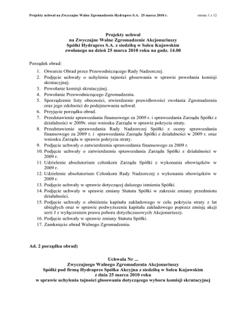 Projekty uchwał na Zwyczajne Walne Zgromadzenie Hydrapres S.A. 25 marca 2010 r. strona 1 z 12 Projekty uchwał na Zwyczajne Walne Zgromadzenie Akcjonariuszy Spółki Hydrapres S.A. z siedzibą w Solcu Kujawskim zwołanego na dzień 25 marca 2010 roku na godz. 14.00 Porządek obrad: 1. Otwarcie Obrad przez Przewodniczącego Rady Nadzorczej. 2. Podjęcie uchwały o uchyleniu tajności głosowania w sprawie powołania komisji skrutacyjnej. 3. Powołanie komisji skrutacyjnej. 4. Powołanie Przewodniczącego Zgromadzenia. 5. Sporządzenie listy obecności, stwierdzenie prawidłowości zwołania Zgromadzenia oraz jego zdolności do podejmowania uchwał. 6. Przyjęcie porządku obrad. 7. Przedstawienie sprawozdania finansowego za 2009 r. i sprawozdania Zarządu Spółki z działalności w 2009r. oraz wniosku Zarządu w sprawie pokrycia straty. 8. Przedstawienie sprawozdania Rady Nadzorczej Spółki z oceny sprawozdania finansowego za 2009 r. i sprawozdania Zarządu Spółki z działalności w 2009 r. oraz wniosku Zarządu w sprawie pokrycia straty. 9. Podjęcie uchwały o zatwierdzeniu sprawozdania finansowego za 2009 r. 10. Podjęcie uchwały o zatwierdzeniu sprawozdania Zarządu Spółki z działalności w 2009 r. 11. Udzielenie absolutorium członkom Zarządu Spółki z wykonania obowiązków w 2009 r. 12. Udzielenie absolutorium Członkom Rady Nadzorczej z wykonania obowiązków w 2009 r. 13. Podjęcie uchwały w sprawie dotyczącej dalszego istnienia Spółki. 14. Podjęcie uchwały w sprawie zmiany Statutu Spółki w zakresie zmiany przedmiotu działalności. 15. Podjęcie uchwały o obniżeniu kapitału zakładowego w celu pokrycia straty z lat ubiegłych oraz w sprawie podwyższenia kapitału zakładowego poprzez emisję akcji serii J z wyłączeniem prawa poboru dotychczasowych Akcjonariuszy. 16. Podjęcie uchwały w sprawie zmiany Statutu Spółki. 17. Zamknięcie obrad Walnego Zgromadzenia. Ad. 2 porządku obrad) Uchwała Nr ... Zwyczajnego Walnego Zgromadzenia Akcjonariuszy Spółki pod firmą Hydrapres Spółka Akcyjna z siedzibą w Solcu Kujawskim z dnia 25 marca 2010 roku w sprawie uchylenia tajności głosowania dotyczącego wyboru komisji skrutacyjnej Projekty uchwał na Zwyczajne Walne Zgromadzenie Hydrapres S.A. 25 marca 2010 r. strona 2 z 12 Na podstawie art. 420 § 3 Kodeksu spółek handlowych Zwyczajne Walne Zgromadzenie Akcjonariuszy Hydrapres Spółki Akcyjnej z siedzibą w Solcu Kujawskim, niniejszym postanawia uchylić tajność głosowania w sprawie powołania komisji skrutacyjnej i wyboru jej członków. Ad. 3 porządku obrad) Uchwała Nr ... Zwyczajnego Walnego Zgromadzenia Akcjonariuszy Spółki pod firmą Hydrapres Spółka Akcyjna z siedzibą w Solcu Kujawskim z dnia 25 marca 2010 roku w sprawie powołania komisji skrutacyjnej Zwyczajne Walne Zgromadzenie Akcjonariuszy Hydrapres Spółki Akcyjnej z siedzibą w Solcu Kujawskim, postanawia niniejszym powołać komisję skrutacyjną i dokonać wyboru jej członków w osobach: …………………………………… - jako Przewodniczącego komisji skrutacyjnej i ……………………………………… - jako Sekretarza komisji skrutacyjnej. Ad. 4 porządku obrad) Uchwała Nr ... Zwyczajnego Walnego Zgromadzenia Akcjonariuszy Spółki pod firmą Hydrapres Spółka Akcyjna z siedzibą w Solcu Kujawskim z dnia 25 marca 2010 roku w sprawie powołania Przewodniczącego Zwyczajnego Walnego Zgromadzenia Akcjonariuszy Zwyczajne Walne Zgromadzenie Akcjonariuszy Spółki Hydrapres S.A.. powołuje na przewodniczącego Zgromadzenia Pana/Panią ................................……………….. Ad. 6 porządku obrad) Uchwała Nr ... Zwyczajnego Walnego Zgromadzenia Akcjonariuszy Spółki pod firmą Hydrapres Spółka Akcyjna z siedzibą w Solcu Kujawskim z dnia 25 marca 2010 roku w sprawie przyjęcia porządku obrad Walnego Zgromadzenia Zwyczajne Walne Zgromadzenie Akcjonariuszy Hydrapres Spółki Akcyjnej z siedzibą w Solcu Kujawskim postanawia przyjąć porządek obrad niniejszego Zwyczajnego Walnego Zgromadzenia Spółki w brzmieniu zamieszczonym na stronie internetowej Spółki w dniu 26 lutego 2010 roku oraz przekazanym do publicznej wiadomości raportem bieżącym nr ..../2010. Projekty uchwał na Zwyczajne Walne Zgromadzenie Hydrapres S.A. 25 marca 2010 r. strona 3 z 12 Ad. 9 porządku obrad) Uchwała Nr ... Zwyczajnego Walnego Zgromadzenia Akcjonariuszy Spółki pod firmą Hydrapres Spółka Akcyjna z siedzibą w Solcu Kujawskim z dnia 25 marca 2010 roku w sprawie zatwierdzenia sprawozdania finansowego za rok obrotowy 2009 Zwyczajne Walne Zgromadzenie Akcjonariuszy Hydrapres Spółki Akcyjnej z siedzibą w Solcu Kujawskim po rozpatrzeniu sprawozdania finansowego Spółki za rok obrotowy 2009 oraz sprawozdania Rady Nadzorczej z badania sprawozdania finansowego Spółki za rok obrotowy 2009 oraz wniosku w sprawie sposobu pokrycia straty w roku obrotowym 2009, na podstawie art. 395 § 2 pkt 1 Kodeksu spółek handlowych postanawia zatwierdzić sprawozdanie finansowe za rok obrotowy 2009, na które składa się: 1) wprowadzenie do sprawozdania finansowego; 2) bilans, zamykający się po stronie aktywów i pasywów kwotą ................; 3) rachunek zysków i strat, wykazujący stratę netto w kwocie .................; 4) zestawienie zmian w kapitale własnym, wykazujące zmniejszenie kapitału własnego o kwotę ......................; 5) rachunek przepływów pieniężnych wykazujący zmniejszenie stanu środków pieniężnych o kwotę ........................; 6) dodatkowe informacje i wyjaśnienia. Ad. 10 porządku obrad) Uchwała Nr ... Zwyczajnego Walnego Zgromadzenia Akcjonariuszy Spółki pod firmą Hydrapres Spółka Akcyjna z siedzibą w Solcu Kujawskim z dnia 25 marca 2010 roku w sprawie zatwierdzenia sprawozdania Zarządu Spółki z działalności w 2009 r. Zwyczajne Walne Zgromadzenie Akcjonariuszy Hydrapres Spółki Akcyjnej z siedzibą w Solcu Kujawskim po rozpatrzeniu sprawozdania Zarządu z dz