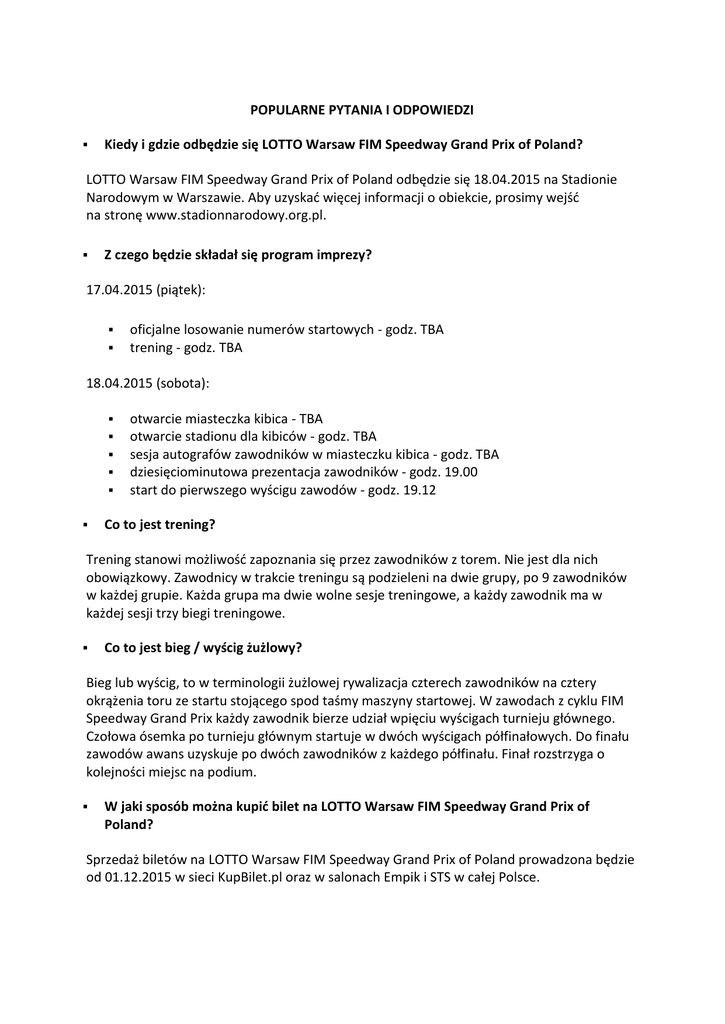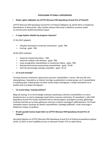 POPULARNE PYTANIA I ODPOWIEDZI Kiedy i gdzie odbędzie się LOTTO Warsaw FIM Speedway Grand Prix of Poland? LOTTO Warsaw FIM Speedway Grand Prix of Poland odbędzie się 18.04.2015 na Stadionie Narodowym w Warszawie. Aby uzyskać więcej informacji o obiekcie, prosimy wejść na stronę www.stadionnarodowy.org.pl. Z czego będzie składał się program imprezy? 17.04.2015 (piątek): oficjalne losowanie numerów startowych - godz. TBA trening - godz. TBA 18.04.2015 (sobota): otwarcie miasteczka kibica - TBA otwarcie stadionu dla kibiców - godz. TBA sesja autografów zawodników w miasteczku kibica - godz. TBA dziesięciominutowa prezentacja zawodników - godz. 19.00 start do pierwszego wyścigu zawodów - godz. 19.12 Co to jest trening? Trening stanowi możliwość zapoznania się przez zawodników z torem. Nie jest dla nich obowiązkowy. Zawodnicy w trakcie treningu są podzieleni na dwie grupy, po 9 zawodników w każdej grupie. Każda grupa ma dwie wolne sesje treningowe, a każdy zawodnik ma w każdej sesji trzy biegi treningowe. Co to jest bieg / wyścig żużlowy? Bieg lub wyścig, to w terminologii żużlowej rywalizacja czterech zawodników na cztery okrążenia toru ze startu stojącego spod taśmy maszyny startowej. W zawodach z cyklu FIM Speedway Grand Prix każdy zawodnik bierze udział wpięciu wyścigach turnieju głównego. Czołowa ósemka po turnieju głównym startuje w dwóch wyścigach półfinałowych. Do finału zawodów awans uzyskuje po dwóch zawodników z każdego półfinału. Finał rozstrzyga o kolejności miejsc na podium. W jaki sposób można kupić bilet na LOTTO Warsaw FIM Speedway Grand Prix of Poland? Sprzedaż biletów na LOTTO Warsaw FIM Speedway Grand Prix of Poland prowadzona będzie od 01.12.2015 w sieci KupBilet.pl oraz w salonach Empik i STS w całej Polsce. Ile kosztują bilety na LOTTO Warsaw FIM Speedway Grand Prix of Poland? 49 PLN KAT. I – KAT. II – 59 PLN KAT. III – 69 PLN KAT. IV - 79 PLN KAT. V – 79 PLN KAT. VI – 89 PLN KAT. VII – 99 PLN VIP – 850 PLN Na bilet VIP składa się: miejsce siedzące, catering, open bar, program, drobny upominek od organizatora. Menu zamieścimy w terminie późniejszym. BILETY DO NABYCIA JUŻ OD 1 GRUDNIA 2014 NA: KUPBILET.PL PONADTO BILETY DO NABYCIA: EMPIK i STS SZCZEGÓŁY: SGPNARODOWY.PL Ile kosztuje i czym jest program zawodów LOTTO Warsaw FIM Speedway Grand Prix of Poland? Jest to publikacja zawierająca podstawowe informacje na temat zawodów i ich uczestników z tabelą wyścigów wraz z możliwością jej uzupełniania. Program ma wartość kolekcjonerską, stanowi też zbiór informacji statystycznych. Program zawodów kosztuje 15 zł (do nabycia od 16.04.2015 w kasach na terenie SN). Jak dojechać na Stadion Narodowy? Komunikacja miejska przed imprezą: Przystanek PKP Warszawa Stadion linie SKM S1, S2 Przystanek Al. Zieleniecka linie tramwajowe: 3, 7, 8, 22 linie autobusowe: 123,125, 135, 138, 146, 147, 166, 226, 509, 517 Przystanek Rondo Waszyngtona linie tramwajowe: 7, 8, 9, 22, 24, 25 linie autobusowe: 102, 111, 117, 123, 138, 146, 147, 158, 166, 507, 509, 517, 521 Komunikacja miejska po imprezie: Przystanek PKP Warszawa Stadion linie SKM S1, S2 Ostatnie pociągi z dworca Stadion odjeżdżać będą w kierunku wschodnim o godzinie 23.38, a w kierunku zachodnim o godzinie 23.51. Przystanek Al. Zieleniecka linie tramwajowe: 3, 7, 8, 22 kursujące na trasach objazdowych tylko po Pradze linie autobusowe: 123,125, 135, 138, 146, 147, 166, 226, 509, 517, N02, N03, N21, N71 Przystanek Rondo Waszyngtona linie tramwajowe: 7, 8, 9, 22, 24, 25 linie autobusowe: 123, 138, 146, 147, 509, 517, N02 (stan na 13.11.2014) Czy na miejscu dostępny będzie parking dla publiczności? Podczas LOTTO Warsaw FIM Speedway Grand Prix of Poland zostaną zorganizowane parkingi dla publiczności na terenie miasta stołecznego Warszawa. O ich lokalizacji poinformujemy w terminie późniejszym. Planując przybycie na LOTTO Warsaw FIM Speedway Grand Prix of Poland, warto wziąć pod uwagę korzystanie z transportu publicznego. Rekomendujemy dojazd komunikacją miejską. Którzy zawodnicy wystąpią podczas LOTTO Warsaw FIM Speedway Grand Prix of Poland? Wszystkie szczegóły dotycząc programu wydarzenia na bieżąco będą publikowane na oficjalnej stronie internetowej www.sgpnarodowy.pl. Oficjalna strona cyklu FIM Speedway Grand Prix www.speedwaygp.com zawiera wszystkie informacje o uczestnikach. Czy po zawodach będzie wiadomo, który zawodnik został Indywidualnym Mistrzem Świata na żużlu w sezonie 2015? Nie. LOTTO Warsaw FIM Speedway Grand Prix of Poland to pierwszy turniej z cyklu FIM Speedway Grand Prix w sezonie 2015. Zawodnicy zbierają punkty przez cały sezon do klasyfikacji generalnej. Szczegóły dotyczące klasyfikacji i uczestników na www.speedwaygp.com. Czy na zawody LOTTO Warsaw FIM Speedway Grand Prix of Poland można będzie wnieść aparat fotograficzny? Na teren imprezy nie będzie można wnosić, bez uprzedniego uzyskania akredytacji prasowej, profesjonalnego sprzętu fotograficznego i wideo. Osoby które będą starały się wnieść na teren imprezy aparat fotograficzny z wymiennym zestawem optycznym lub kamerę wideo, będą musiały liczyć się z koniecznością przekazania go w depozyt, którego koszt wynosi 50 PLN. Koszt depozytu nie podlega zwrotowi. Czy na zawodach LOTTO Warsaw FIM Speedway Grand Prix of Poland będą dostępne punkty gastronomiczne? Na teren Stadionu Narodowego nie można wnosić jedzenia ani napojów. Dla widzów przygotowana będzie bogata oferta gastronomiczna (przekąski zimne, ciepłe, napoje) na promenadzie zewnętrznej oraz wewnątrz Stadionu. Płatność gotówką. Czy na zawodach LOTTO Warsaw FIM Speedway Grand Prix of Poland będzie audiodeskrypcja? Na Stadionie Narodowym dostępny będzie serwis audiodeskrypcji (częstotliwość 95,1 MHz), czyli głosowy opis treści wizualnych dla osób niewidomych i niedowidzących. Aby skorzystać z usługi nale