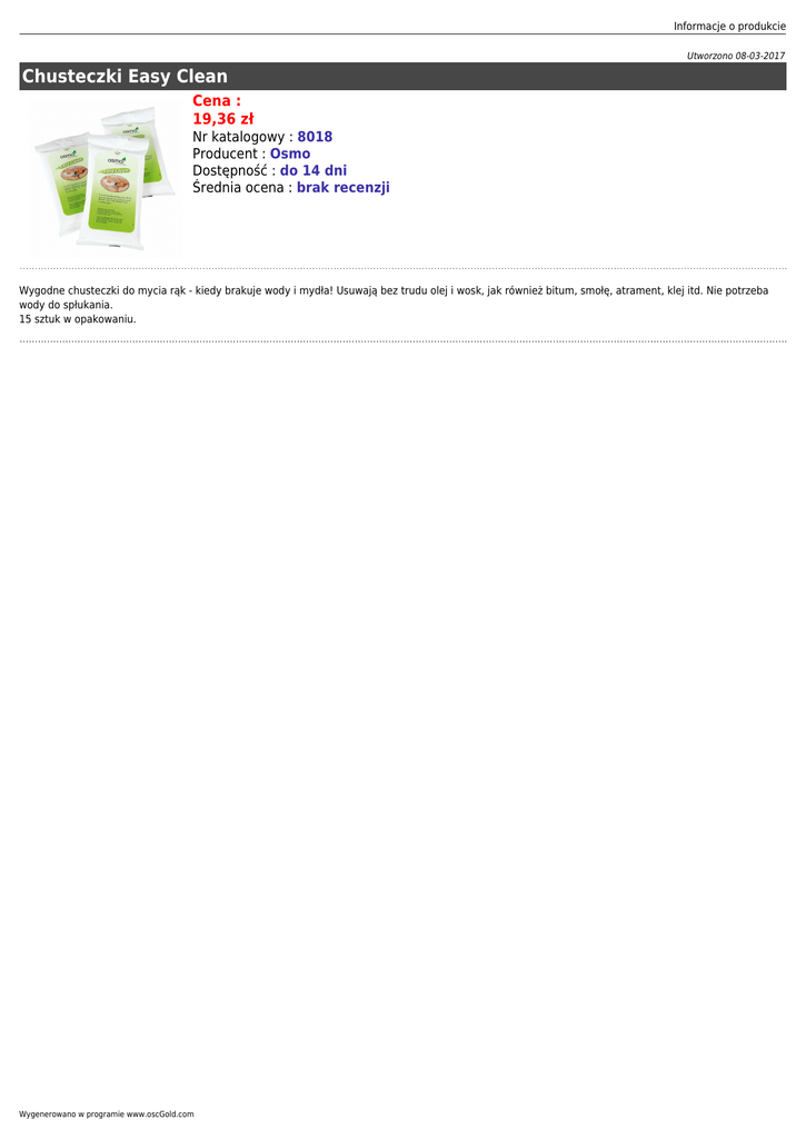 Informacje o produkcie Utworzono 08-03-2017 Chusteczki Easy Clean Cena : 19,36 zł Nr katalogowy : 8018 Producent : Osmo Dostępność : do 14 dni Średnia ocena : brak recenzji Wygodne chusteczki do mycia rąk - kiedy brakuje wody i mydła! Usuwają bez trudu olej i wosk, jak również bitum, smołę, atrament, klej itd. Nie potrzeba wody do spłukania. 15 sztuk w opakowaniu. Wygenerowano w programie www.oscGold.com