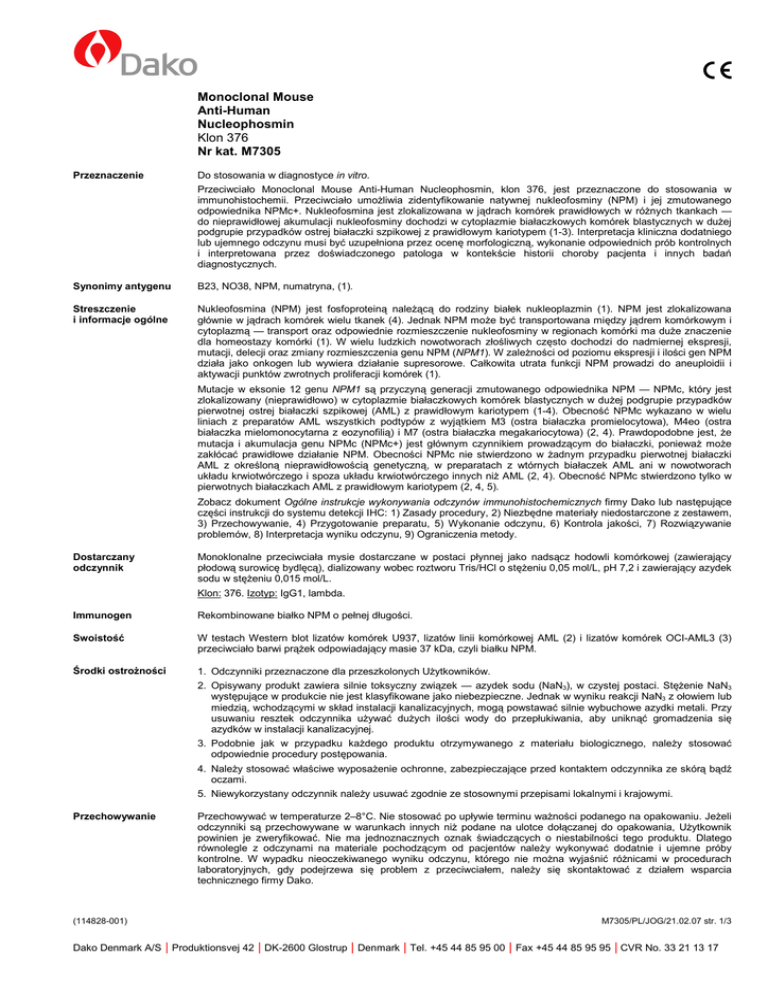 Monoclonal Mouse Anti-Human Nucleophosmin Klon 376 Nr kat. M7305 Przeznaczenie Do stosowania w diagnostyce in vitro. Przeciwciało Monoclonal Mouse Anti-Human Nucleophosmin, klon 376, jest przeznaczone do stosowania w immunohistochemii. Przeciwciało umożliwia zidentyfikowanie natywnej nukleofosminy (NPM) i jej zmutowanego odpowiednika NPMc+. Nukleofosmina jest zlokalizowana w jądrach komórek prawidłowych w różnych tkankach — do nieprawidłowej akumulacji nukleofosminy dochodzi w cytoplazmie białaczkowych komórek blastycznych w dużej podgrupie przypadków ostrej białaczki szpikowej z prawidłowym kariotypem (1-3). Interpretacja kliniczna dodatniego lub ujemnego odczynu musi być uzupełniona przez ocenę morfologiczną, wykonanie odpowiednich prób kontrolnych i interpretowana przez doświadczonego patologa w kontekście historii choroby pacjenta i innych badań diagnostycznych. Synonimy antygenu B23, NO38, NPM, numatryna, (1). Streszczenie i informacje ogólne Nukleofosmina (NPM) jest fosfoproteiną należącą do rodziny białek nukleoplazmin (1). NPM jest zlokalizowana głównie w jądrach komórek wielu tkanek (4). Jednak NPM może być transportowana między jądrem komórkowym i cytoplazmą — transport oraz odpowiednie rozmieszczenie nukleofosminy w regionach komórki ma duże znaczenie dla homeostazy komórki (1). W wielu ludzkich nowotworach złośliwych często dochodzi do nadmiernej ekspresji, mutacji, delecji oraz zmiany rozmieszczenia genu NPM (NPM1). W zależności od poziomu ekspresji i ilości gen NPM działa jako onkogen lub wywiera działanie supresorowe. Całkowita utrata funkcji NPM prowadzi do aneuploidii i aktywacji punktów zwrotnych proliferacji komórek (1). Mutacje w eksonie 12 genu NPM1 są przyczyną generacji zmutowanego odpowiednika NPM — NPMc, który jest zlokalizowany (nieprawidłowo) w cytoplazmie białaczkowych komórek blastycznych w dużej podgrupie przypadków pierwotnej ostrej białaczki szpikowej (AML) z prawidłowym kariotypem (1-4). Obecność NPMc wykazano w wielu liniach z preparatów AML wszystkich podtypów z wyjątkiem M3 (ostra białaczka promielocytowa), M4eo (ostra białaczka mielomonocytarna z eozynofilią) i M7 (ostra białaczka megakariocytowa) (2, 4). Prawdopodobne jest, że mutacja i akumulacja genu NPMc (NPMc+) jest głównym czynnikiem prowadzącym do białaczki, ponieważ może zakłócać prawidłowe działanie NPM. Obecności NPMc nie stwierdzono w żadnym przypadku pierwotnej białaczki AML z określoną nieprawidłowością genetyczną, w preparatach z wtórnych białaczek AML ani w nowotworach układu krwiotwórczego i spoza układu krwiotwórczego innych niż AML (2, 4). Obecność NPMc stwierdzono tylko w pierwotnych białaczkach AML z prawidłowym kariotypem (2, 4, 5). Zobacz dokument Ogólne instrukcje wykonywania odczynów immunohistochemicznych firmy Dako lub następujące części instrukcji do systemu detekcji IHC: 1) Zasady procedury, 2) Niezbędne materiały niedostarczone z zestawem, 3) Przechowywanie, 4) Przygotowanie preparatu, 5) Wykonanie odczynu, 6) Kontrola jakości, 7) Rozwiązywanie problemów, 8) Interpretacja wyniku odczynu, 9) Ograniczenia metody. Dostarczany odczynnik Monoklonalne przeciwciała mysie dostarczane w postaci płynnej jako nadsącz hodowli komórkowej (zawierający płodową surowicę bydlęcą), dializowany wobec roztworu Tris/HCl o stężeniu 0,05 mol/L, pH 7,2 i zawierający azydek sodu w stężeniu 0,015 mol/L. Klon: 376. Izotyp: IgG1, lambda. Immunogen Rekombinowane białko NPM o pełnej długości. Swoistość W testach Western blot lizatów komórek U937, lizatów linii komórkowej AML (2) i lizatów komórek OCI-AML3 (3) przeciwciało barwi prążek odpowiadający masie 37 kDa, czyli białku NPM. Środki ostrożności 1. Odczynniki przeznaczone dla przeszkolonych Użytkowników. 2. Opisywany produkt zawiera silnie toksyczny związek — azydek sodu (NaN3), w czystej postaci. Stężenie NaN3 występujące w produkcie nie jest klasyfikowane jako niebezpieczne. Jednak w wyniku reakcji NaN3 z ołowiem lub miedzią, wchodzącymi w skład instalacji kanalizacyjnych, mogą powstawać silnie wybuchowe azydki metali. Przy usuwaniu resztek odczynnika używać dużych ilości wody do przepłukiwania, aby uniknąć gromadzenia się azydków w instalacji kanalizacyjnej. 3. Podobnie jak w przypadku każdego produktu otrzymywanego z materiału biologicznego, należy stosować odpowiednie procedury postępowania. 4. Należy stosować właściwe wyposażenie ochronne, zabezpieczające przed kontaktem odczynnika ze skórą bądź oczami. 5. Niewykorzystany odczynnik należy usuwać zgodnie ze stosownymi przepisami lokalnymi i krajowymi. Przechowywanie (114828-001) Przechowywać w temperaturze 2–8°C. Nie stosować po upływie terminu ważności podanego na opakowaniu. Jeżeli odczynniki są przechowywane w warunkach innych niż podane na ulotce dołączanej do opakowania, Użytkownik powinien je zweryfikować. Nie ma jednoznacznych oznak świadczących o niestabilności tego produktu. Dlatego równolegle z odczynami na materiale pochodzącym od pacjentów należy wykonywać dodatnie i ujemne próby kontrolne. W wypadku nieoczekiwanego wyniku odczynu, którego nie można wyjaśnić różnicami w procedurach laboratoryjnych, gdy podejrzewa się problem z przeciwciałem, należy się skontaktować z działem wsparcia technicznego firmy Dako. M7305/PL/JOG/21.02.07 str. 1/3 Dako Denmark A/S | Produktionsvej 42 | DK-2600 Glostrup | Denmark | Tel. +45 44 85 95 00 | Fax +45 44 85 95 95 | CVR No. 33 21 13 17 Przygotowanie próbek i materiały dodatkowe wymagane, ale niedostarczane Skrawki parafinowe: Przeciwciała mogą być wykorzystane do znakowania utrwalonych formaliną lub B5 (2) skrawków zatapianych w parafinie. Wymagane jest poddanie odparafinowanych skrawków tkankowych cieplnemu odmaskowaniu antygenu (HIER). Optymalne wyniki uzyskuje się w wyniku wstępnej obróbki tkanek, polegają