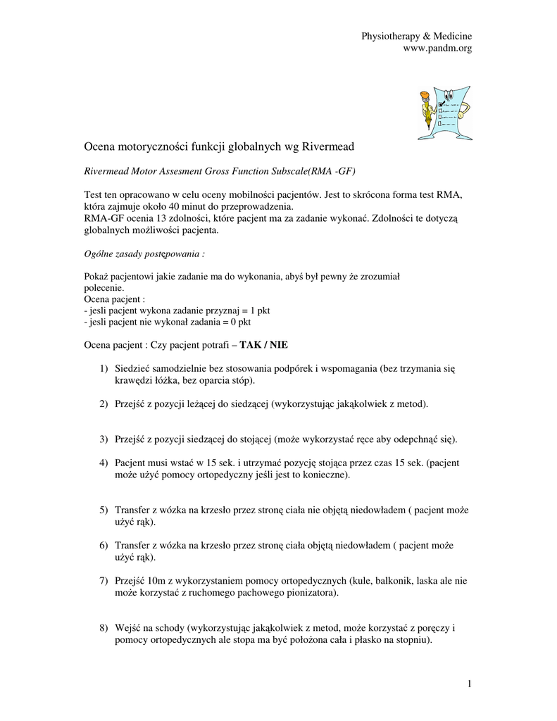 Physiotherapy & Medicine www.pandm.org Ocena motoryczności funkcji globalnych wg Rivermead Rivermead Motor Assesment Gross Function Subscale(RMA -GF) Test ten opracowano w celu oceny mobilności pacjentów. Jest to skrócona forma test RMA, która zajmuje około 40 minut do przeprowadzenia. RMA-GF ocenia 13 zdolności, które pacjent ma za zadanie wykonać. Zdolności te dotyczą globalnych możliwości pacjenta. Ogólne zasady postępowania : Pokaż pacjentowi jakie zadanie ma do wykonania, abyś był pewny że zrozumiał polecenie. Ocena pacjent : - jesli pacjent wykona zadanie przyznaj = 1 pkt - jesli pacjent nie wykonał zadania = 0 pkt Ocena pacjent : Czy pacjent potrafi – TAK / NIE 1) Siedzieć samodzielnie bez stosowania podpórek i wspomagania (bez trzymania się krawędzi łóżka, bez oparcia stóp). 2) Przejść z pozycji leżącej do siedzącej (wykorzystując jakąkolwiek z metod). 3) Przejść z pozycji siedzącej do stojącej (może wykorzystać ręce aby odepchnąć się). 4) Pacjent musi wstać w 15 sek. i utrzymać pozycję stojąca przez czas 15 sek. (pacjent może użyć pomocy ortopedyczny jeśli jest to konieczne). 5) Transfer z wózka na krzesło przez stronę ciała nie objętą niedowładem ( pacjent może użyć rąk). 6) Transfer z wózka na krzesło przez stronę ciała objętą niedowładem ( pacjent może użyć rąk). 7) Przejść 10m z wykorzystaniem pomocy ortopedycznych (kule, balkonik, laska ale nie może korzystać z ruchomego pachowego pionizatora). 8) Wejść na schody (wykorzystując jakąkolwiek z metod, może korzystać z poręczy i pomocy ortopedycznych ale stopa ma być położona cała i płasko na stopniu). 1 Physiotherapy & Medicine www.pandm.org 9) Przejść 10m bez wykorzystania pomocy ortopedycznych. 10) Przejść 10m, podnieść woreczek z piaskiem z podłogi, obrócić się i wrócić (wykorzystując jakąkolwiek z metod oraz pomoce ortopedyczne jeśli są konieczne przy podnoszeniu woreczka. Nie może korzystać z ruchomego pachowego pionizatora. Może użyć którejkolwiek z rąk przy podnoszeniu woreczka. 11) Chód 40m w terenie (może użyć pomocy ortopedycznych: ortez, łusek. Nie może korzystać z ruchomego pachowego pionizatora). 12) Wchodzenie i schodzenie z 4 stopni (pacjent nie może trzymać się za poręcz, może wykorzystywać pomoce ortopedyczne wspomagające chód, które używa w życiu codziennym). 13) Bieg 10m (musi być symetryczny). 14) Podskok na objętej niedowładem kończynie dolnej 5 razy ( musi podskoczyć na przodostopiu bez zatrzymywania się w celu oceny równowagi. Pacjent nie może pomagać sobie rękoma). Interpretacja : Minimalna liczba pkt – 0 Maksymalna liczba pkt – 13 Im większy wynik tym mniejsza niepełnosprawność Bibliografia : Rivermead Rehabilitation Centre in Oxford England. 2