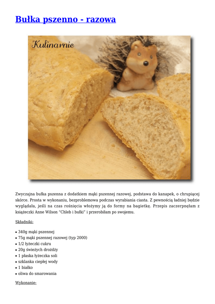 Bułka pszenno - razowa Zwyczajna bułka pszenna z dodatkiem mąki pszennej razowej, podstawa do kanapek, o chrupiącej skórce. Prosta w wykonaniu, bezproblemowa podczas wyrabiania ciasta. Z pewnością ładniej będzie wyglądała, jeśli na czas rośnięcia włożymy ją do formy na bagietkę. Przepis zaczerpnęłam z książeczki Anne Wilson “Chleb i bułki” i przerobiłam po swojemu. Składniki: ■ ■ ■ ■ ■ ■ ■ ■ 340g mąki pszennej 75g mąki pszennej razowej (typ 2000) 1/2 łyżeczki cukru 20g świeżych drożdży 1 płaska łyżeczka soli szklanka ciepłej wody 1 białko oliwa do smarowania Wykonanie: 1. Drożdże rozcieramy z cukrem i rozpuszczamy w wodzie, mieszamy. 2. Mąki mieszamy z solą w dużej misce, dodajemy rozczyn z drożdży. 3. Mieszamy wszystko ręką lub drewnianą łyżką. Blat posypujemy mąką pszenną i wykładamy na niego ciasto. Wyrabiamy około 8-10 minut, aż ciasto stanie się elastyczne, sprężyste i bez problemu będzie odchodzić od rąk. W razie konieczności podsypujemy mąką. Długie wyrabianie jest w tym przypadku bardzo ważne. 4. Miskę smarujemy cienko oliwą z oliwek, z ciasta formujemy kulę i wkładamy do miski. Przykrywamy i odstawiamy na godzinę w ciepłe miejsce. Dobrze wyrośnięte ciasto podwaja swoją objętość. 5. Ciasto przebijamy i wygniatamy przez około minutę. Rozwałkowujemy na prostokąt. Musi on być mniej więcej tej długości, by zmieścił nam się na blachę (największą). Ewentualnie możemy uformować dwie bułki i piec je razem (nieco krócej i w niższej temperaturze). Rolujemy ciasto w długi wałek, z końcówek formujemy szpice. Kładziemy ukośnie na natłuszczonej blasze lub na blasze wyłożonej papierem do pieczenia, przykrywamy i odstawiamy do wyrośnięcia na około 40 minut. 6. Piekarnik rozgrzewamy do 210 stopni Celsjusza, na dno wstawiamy foremkę z wodą. 7. Bułkę smarujemy białkiem jaja rozbitym z łyżką wody, po czym nacinamy ukośnie co 3-5 centymetrów. Wstawiamy do piekarnika na 15 minut. 8. Bułkę ponownie szybko smarujemy białkiem, po czym zamykamy drzwiczki piekarnika, zmniejszamy temperaturę do 180 stopni Celsjusza i pieczemy jeszcze około 25 minut. Po upieczeniu bułkę studzimy na kratce.