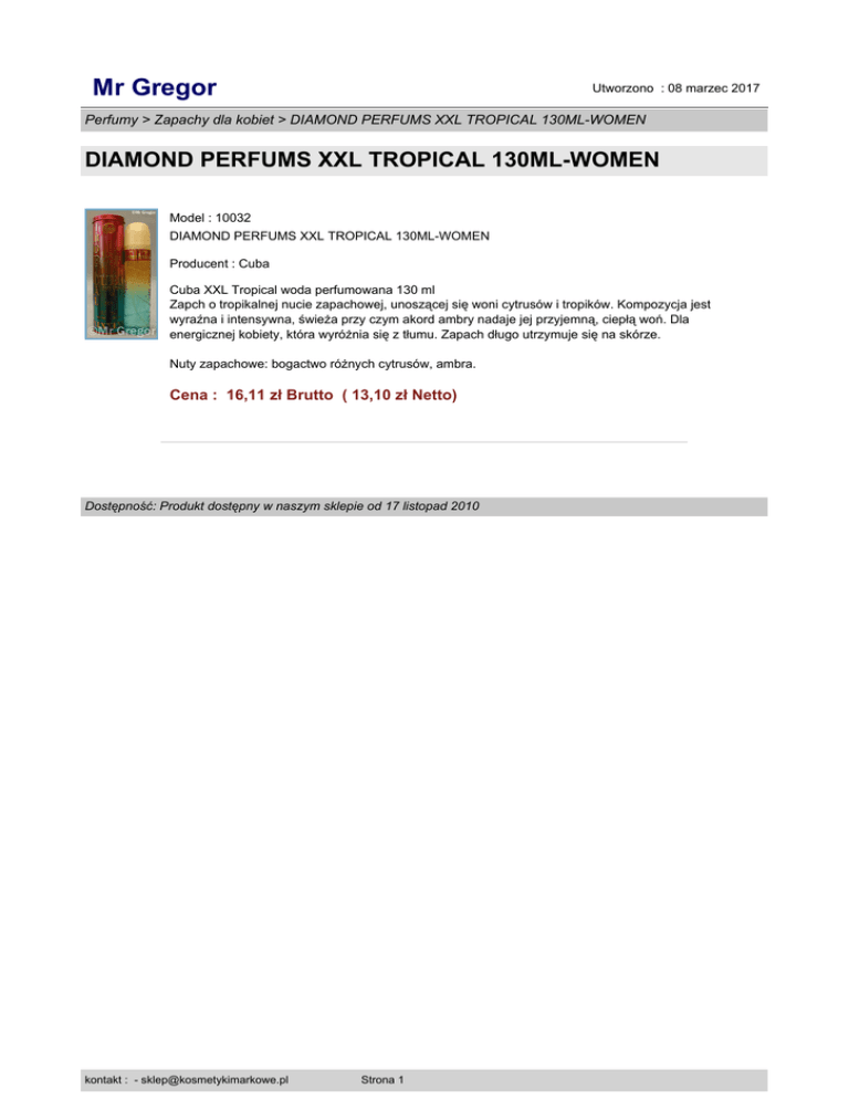 Mr Gregor Utworzono : 08 marzec 2017 Perfumy > Zapachy dla kobiet > DIAMOND PERFUMS XXL TROPICAL 130ML-WOMEN DIAMOND PERFUMS XXL TROPICAL 130ML-WOMEN Model : 10032 DIAMOND PERFUMS XXL TROPICAL 130ML-WOMEN Producent : Cuba Cuba XXL Tropical woda perfumowana 130 ml Zapch o tropikalnej nucie zapachowej, unoszącej się woni cytrusów i tropików. Kompozycja jest wyraźna i intensywna, świeża przy czym akord ambry nadaje jej przyjemną, ciepłą woń. Dla energicznej kobiety, która wyróżnia się z tłumu. Zapach długo utrzymuje się na skórze. Nuty zapachowe: bogactwo różnych cytrusów, ambra. Cena : 16,11 zł Brutto ( 13,10 zł Netto) Dostępność: Produkt dostępny w naszym sklepie od 17 listopad 2010 kontakt : - [email protected] Strona 1
