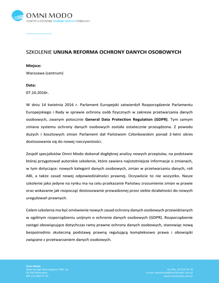SZKOLENIE UNIJNA REFORMA OCHRONY DANYCH OSOBOWYCH Miejsce: Warszawa (centrum) Data: 07.10.2016r. W dniu 14 kwietnia 2016 r. Parlament Europejski zatwierdził Rozporządzenie Parlamentu Europejskiego i Rady w sprawie ochrony osób fizycznych w zakresie przetwarzania danych osobowych, zwanym potocznie General Data Protection Regulation (GDPR). Tym samym zmiana systemu ochrony danych osobowych została ostatecznie przesądzona. Z powodu dużych i kosztowych zmian Parlament dał Państwom Członkowskim ponad 2-letni okres dostosowania się do nowej rzeczywistości. Zespół specjalistów Omni Modo dokonał dogłębnej analizy nowych przepisów, na podstawie której przygotował autorskie szkolenie, które zawiera najistotniejsze informacje o zmianach, w tym dotyczące: nowych kategorii danych osobowych, zmian w przetwarzaniu danych, roli ABI, a także zasad nowej odpowiedzialności prawnej. Oczywiście to nie wszystko. Nasze szkolenie jako jedyne na rynku ma na celu przekazanie Państwu zrozumienie zmian w prawie oraz wskazanie jak rozpocząć dostosowanie prowadzonej przez siebie działalności do nowych uregulowań prawnych. Celem szkolenia ma być omówienie nowych zasad ochrony danych osobowych przewidzianych w ogólnym rozporządzeniu unijnym o ochronie danych osobowych (GDPR). Rozporządzenie zastąpi obowiązujące dotychczas ramy prawne ochrony danych osobowych, stanowiąc nową bezpośrednio skuteczną podstawę prawną regulującą kompleksowo prawa i obowiązki związane z przetwarzaniem danych osobowych. Omni Modo Aleja Jerzego Waszyngtona 40A, 1p. 03-910 Warszawa NIP 113-060-77-41 tel./fax: 22 616 25 70 e-mail: [email protected] www.omnimodo.com.pl Szkolenie uzupełnione zostanie o najnowsze kierunki wykładni przepisów ogólnego rozporządzenia, prezentowane na łamach najnowszej, krajowej oraz europejskiej literatury prawniczej oraz w dokumentach Grupy Roboczej art. 29. Otwarcie szkolenia (wprowadzenie) cele oraz ogólne założenia reformy sektora ochrony danych osobowych I Blok Forma prawna reformy sektora ochrony danych osobowych jak przygotować się do daty, w której rozporządzenie stanie się wiążące bezpośrednie stosowanie ogólnego rozporządzenia do krajowych porządków prawnych dalszy los prawny ustawy o ochronie danych osobowych bezpośrednie stosowanie ogólnego rozporządzenia, a wymóg jego transpozycji do porządków prawnych państw członkowskich polskie organy odpowiedzialne za wdrożenie ogólnego rozporządzenia II Blok Podstawowe obowiązki administratorów danych osobowych nowe przesłanki przetwarzania danych osobowych zwykłych oraz wrażliwych obowiązek przeprowadzenia oceny skutków przetwarzania danych osobowych na ich ochronę nowe zasady realizacji obowiązku informacyjnego audyty należytej ochrony danych osobowych zasada ochrony danych osobowych na etapie projektowania tzw. privacy by design wspólne operacje przetwarzania danych osobowych przez kilku administratorów (Grupy spółek) nowe zasady powierzania danych osobowych obowiązek zgłoszenia GIODO przypadków naruszenia danych osobowych Omni Modo Aleja Jerzego Waszyngtona 40A, 1p. 03-910 Warszawa NIP 113-060-77-41 tel./fax: 22 616 25 70 e-mail: [email protected] www.omnimodo.com.pl III Blok ABI/Inspektor ochrony danych osobowych (DPO) Status prawny inspektora ochrony danych Powołanie oraz odwołanie inspektora ochrony danych Nowe zadania inspektora ochrony danych IV Blok Wybrane zagadnienia Przetwarzanie danych osobowych dzieci Profilowanie Współpraca w sprawach ochrony danych osobowych Kary finansowe za naruszenie zasad ochrony danych osobowych Kodeksy postępowania z danymi osobowymi Nowe mechanizmy certyfikacji w dziedzinie ochrony danych osobowych V Zakończenie Ogólna ocena nowych ram prawych ochrony danych osobowych Najnowsze komentarze, stanowiska praktyków i doktryny do uchwalonego GDPR, czyli co się mówi o rozporządzeniu Dlaczego OMNI MODO: Nasi eksperci to prawnicy i informatycy posiadający wieloletnie doświadczenie zdobyte zarówno w pracy w Biurze Generalnego Inspektora Ochrony Danych Osobowych, jak i podczas pełnienia przez wiele lat funkcji Administratora Bezpieczeństwa Informacji. Jesteśmy jedną z najstarszych i największych firm oferujących usługę zewnętrznego ABI, dzięki czemu możemy uczyć w oparciu o naszą własną metodykę jakiej dopracowaliśmy się na przestrzeni kilkunastu lat. Omni Modo Aleja Jerzego Waszyngtona 40A, 1p. 03-910 Warszawa NIP 113-060-77-41 tel./fax: 22 616 25 70 e-mail: [email protected] www.omnimodo.com.pl Znamy specyfikę każdej dziedziny gospodarki, jak i administracji. Pełnimy funkcję ABI w podmiotach z każdej z branż, w tym m.in. marketingowej, kosmetycznej, usługowej, handlowej, produkcyjnej, farmaceutycznej, finansowej, windykacyjnej, wydawniczej, ubezpieczeniowej, jak i w administracji państwowej. Szkolenie ma charakter wybitnie warsztatowy i praktyczny, każdy z uczestników znajdzie odpowiedzi na nurtujące go pytania prawne. W ramach szkolenia: otrzymasz certyfikat poświadczający udział w szkoleniu, otrzymasz pakiet materiałów szkoleniowych profilowanych pod kątem zagadnień, które Cię zainteresowały, zapewniamy pyszny obiad, kawę, herbatę, zapewniamy wsparcie merytoryczne. Prowadzący: Prawnik/Specjalista ds. ochrony danych osobowych: Poznaj naszych specjalistów Termin i miejsce szkolenia: 07.10.2016r, Warszawa (centrum) Koszt szkolenia: 586,50 zł + 23% VAT od osoby Cena zawiera: pakiet materiałów szkoleniowych, obiad, kawę, herbatę, certyfikat poświadczający udział w szkoleniu, Omni Modo Aleja Jerzego Waszyngtona 40A, 1p. 03-910 Warszawa NIP 113-060-77-41 tel./fax: 22 616 25 70 e-mail: [email protected] www.omnimodo.com.pl wsparcie merytoryczne. Na wszelkie pytania w sprawie szkoleń odpowiemy po numerem telefonu 22 616 25 70 lub drogą mailową: [email protected] Dodatkowych informacji udzieli: Kamila Grzeszczak, tel. 22 616 25 70, 502 109 114. Zapraszamy! Omni Modo Aleja Jerzego 