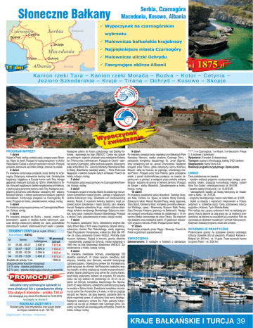 Słoneczne Bałkany Czarnogóra Budva Cetynia PWypoczynek na czarnogórskim Serbia Bułgaria Macedonia 11 dni Ochryd Albania wybrzeżu PMalownicze bałkańskie krajobrazy Skopje Tirana Serbia, Czarnogóra Macedonia, Kosowo, Albania Grecja PNajpiękniejsze miasta Czarnogóry PMalownicze uliczki Ochrydu PFascynujące oblicza Albanii od 1875 zł Kanion rzeki Tara – Kanion rzeki Morača – Budva – Kotor – Cetynia – Aegean Jezioro Szkoderskie – Kruje – Tirana – Ochryd – Kosowo – Skopje Ionian Sea Pátrai Athens k czyne Wypo iedzanie i zw Program imprezy 1 dzień Wyjazd z Polski według rozkładu jazdy, przejazd przez Słowację, Węgry do Serbii. Przejazd na nocleg tranzytowy* w okolicy miejscowości čačak w późnych godzinach nocnych. Podczas przejazdu planowane są krótkie postoje i przerwa na posiłek. 2 dzień Po śniadaniu kontynuacja przejazdu przez Serbię do Czarnogóry. Zobaczymy malownicze kaniony rzek i fantastyczne krajobrazy: najgłębszy w Europie kanion rzeki Tara, którego głębokość miejscami dochodzi do 1250 m, Wielki Most na Tarze, który jest wyjątkowym dziełem współczesnej architektury, z zachwycajcą panoramą kanionu rzeki Tary. Następnie przejedziemy do kanionu rzeki Morača i zwiedzimy XIII - wieczny Monastyr Morača, z dobrze zachowanymi freskami i pięknym ikonostasem. Kontynuacja przejazdu na Czarnogórską Riwierę. Przyjazd do hotelu, zakwaterowanie, kolacja, nocleg. 3 dzień Po śniadaniu pobyt wypoczynkowy na Czarnogórskiej Riwierze. Kolacja, nocleg. 4 dzień Po śniadaniu przejazd do Budvy - zwanej „małym Dubrownikiem”, spacer w obrębie murów obronnych, podczas którego zobaczymy katedrę św. Jana, pozostałości starożytnych budowli, średniowiecznych kaplic i cytadele. TERMINY I CENY (za os. w pok. 2/3 os.) Kod imprezy: KMTO Cena W promocji Nr Termin katalogowa już od: 01 25.06 - 05.07 2 499 zł 1 875 zł 02 09.07 - 19.07 2 599 zł 1 950 zł 03 20.08 - 30.08 2 599 zł 1 950 zł 04 03.09 - 13.09 2 499 zł 1 875 zł Dopłata do pokoju 1-os. 1000 zł Ubezpieczenie kosztów rezygnacji: 2,4 % ceny - stawka podstawowa 6,2 % ceny - stawka obejmująca choroby przewlekłe Promocje Aktualne ceny promocyjne sprawdź na www.almatur.pl lub u sprzedawców oferty. Dla stałych klientów - zniżka 150 zł (nie obowiązuje przy ofercie First Moment do 15.02.2015) szczegóły na stronie 5 Rozkład jazdy nr 6 Rozkład jazdy, lista przystanków oraz wykaz dopłat za miejsce wsiadania na str. 154-155 Następnie udamy do Kotoru położonego nad Zatoką Kotorską - wpisanego na listę UNESCO. Czeka nas spacer po urokliwych, wąskich uliczkach oraz zwiedzanie Katedry św. Trifona wraz z relikwiarzem. Przejazd do Cetynii - dawnej stolicy Czarnogóry, gdzie podczas spaceru zobaczymy pałac króla Nikoli, XV - wieczny Monastyr Narodzenia Matki Bożej, Bilardówkę (siedzibę władcy – Petra Petrovicia Njegosza) i niektóre budynki byłych ambasad. Powrót do hotelu, kolacja, nocleg. 5 dzień Po śniadaniu pobyt wypoczynkowy na Czarnogórskiej Riwierze. Kolacja, nocleg. 6 dzień Po śniadaniu wyjazd w kierunku Albanii do położonego nad Jeziorem Szkoderskim miasta Szkodra - jednego z największych centrów kulturalnych kraju. Zwiedzanie ruin średniowiecznej twierdzy Rozafa. Z wysokości twierdzy będziemy mogli podziwiać jezioro Szkoderskie i miasto Szkodra, jak i ołowiany meczet. Następnie odwiedzimy Kruje - miasto rodzinne albańskiego bohatera narodowego Skanderbega. Zobaczymy twierdzę, stary bazar i zwiedzimy Muzeum Skanderbega. Przejazd w okolice Tirany, zakwaterowanie w hotelu, kolacja, nocleg. 7 dzień Po śniadaniu zwiedzanie Tirany. Odwiedzimy wnętrze Meczetu Ethem Beja z XVIII wieku (najstarszy zabytek stolicy), zobaczymy również Plac Skanderbega, wieżę zegarową, Pałac Prezydencki i Kongresowy, a także tzw. Blok (dla VIP-ów za czasu panowania Envera Wodzy), Piramidę (byłe muzeum dyktatora). Wyjazd w kierunku granicy albańsko - macedońskiej, przejazd do Ochrydu, miasta wpisanego w 1980 roku na listę światowego dziedzictwa UNESCO. Zakwaterowanie w hotelu, kolacja, nocleg. 8 dzień Po śniadaniu zwiedzanie Ochrydu, posiadającego 356 obiektów sakralnych. W czasie spaceru zwiedzimy teatr antyczny, twierdzę cara Samuela, warsztat tradycyjnego czerpania papieru. Odwiedzimy cerkiew Św. Pantelejmona, gdzie spoczywa św. Kliment. Na Plaoszniku zwiedzimy wnętrza bazyliki, w której znajdują się mozaiki wczesnochrześcijańskie. Spacer zakończymy przy cerkwi Św. Jovana Kaneo, spod której popłyniemy łodziami do przystani. Po południu czeka nas rejs statkiem do położonego ok. 30 km na południe od Ochrydu kompleksu klasztornego Św. Nauma. Zanim do niego dotrzemy, odwiedzimy prehistoryczną osadę na wodzie w Zatoce Kości. Zwiedzanie kompleksu zaczniemy od cerkwi Św. Archaniołów z X wieku, w którym znajduje się grób św. Nauma. Jak głosi legenda, położenie dłoni na płycie nagrobnej sprawi, iż usłyszymy bicie serca świętego. Następnie zobaczymy cerkiew Św. Petki, patronki kobiet i udamy się na rejs po źródłach rzeki Czarnego Drinu. Dowiemy się również jak powstają perły ochrydzkie. Powrót do hotelu, kolacja, nocleg. 9 dzień Po śniadaniu przejazd przez największy na Bałkanach Park Narodowy Mavrovo, wzdłuż przełomu Czarnego Drinu, i zwiedzanie kompleksu klasztornego Sv. Jovan Bigorski, który poświęcony jest św. Janowi Chrzcicielowi. Następnie przejazd przez Tetovo, gdzie zobaczymy słynny Kolorowy Meczet i dalej do Kosowa, do pięknego, orientalnego miasta Prizren. Przejazd przez Szar Planinę, gdzie przepiękne widoki z ponad stukilometrowej przełęczy na zawsze zapadną nam w pamięci, a następnie przez serbską enklawę Strepce - jedziemy do granicy w General Jankovic. Przejazd do Skopje – stolicy Macedonii. Zakwaterowanie w hotelu, kolacja, nocleg. 10 dzień Po śniadaniu zwiedzanie stolicy Macedonii: Twierdza Skopsko Kale, Cerkiew św. Spasa na terenie Starej Czarsz