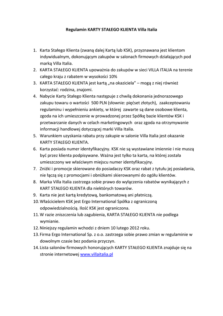 Regulamin KARTY STAŁEGO KLIENTA Villa Italia 1. Karta Stałego Klienta (zwaną dalej Kartą lub KSK), przyznawana jest klientom indywidualnym, dokonującym zakupów w salonach firmowych działających pod marką Villa Italia. 2. KARTA STAŁEGO KLIENTA upoważnia do zakupów w sieci VILLA ITALIA na terenie całego kraju z rabatem w wysokości 10% 3. KARTA STAŁEGO KLIENTA jest kartą „na okaziciela” – mogą z niej również korzystać: rodzina, znajomi. 4. Nabycie Karty Stałego Klienta następuje z chwilą dokonania jednorazowego zakupu towaru o wartości 500 PLN (słownie: pięćset złotych), zaakceptowaniu regulaminu i wypełnieniu ankiety, w której zawarte są dane osobowe klienta, zgoda na ich umieszczenie w prowadzonej przez Spółkę bazie klientów KSK i przetwarzanie danych w celach marketingowych oraz zgoda na otrzymywanie informacji handlowej dotyczącej marki Villa Italia. 5. Warunkiem uzyskania rabatu przy zakupie w salonie Villa Italia jest okazanie KARTY STAŁEGO KLIENTA. 6. Karta posiada numer identyfikacyjny. KSK nie są wystawiane imiennie i nie muszą być przez klienta podpisywane. Ważna jest tylko ta karta, na której została umieszczony we właściwym miejscu numer identyfikacyjny. 7. Zniżki i promocje skierowane do posiadaczy KSK oraz rabat z tytułu jej posiadania, nie łączą się z promocjami i obniżkami skierowanymi do ogółu klientów. 8. Marka Villa Italia zastrzega sobie prawo do wyłączenia rabatów wynikających z KART STAŁEGO KLIENTA dla niektórych towarów. 9. Karta nie jest kartą kredytową, bankomatową ani płatniczą. 10. Właścicielem KSK jest Ergo International Spółka z ograniczoną odpowiedzialnością. Ilość KSK jest ograniczona. 11. W razie zniszczenia lub zagubienia, KARTA STAŁEGO KLIENTA nie podlega wymianie. 12. Niniejszy regulamin wchodzi z dniem 10 lutego 2012 roku. 13. Firma Ergo International Sp. z o.o. zastrzega sobie prawo zmian w regulaminie w dowolnym czasie bez podania przyczyn. 14. Lista salonów firmowych honorujących KARTY STAŁEGO KLIENTA znajduje się na stronie internetowej www.villaitalia.pl
