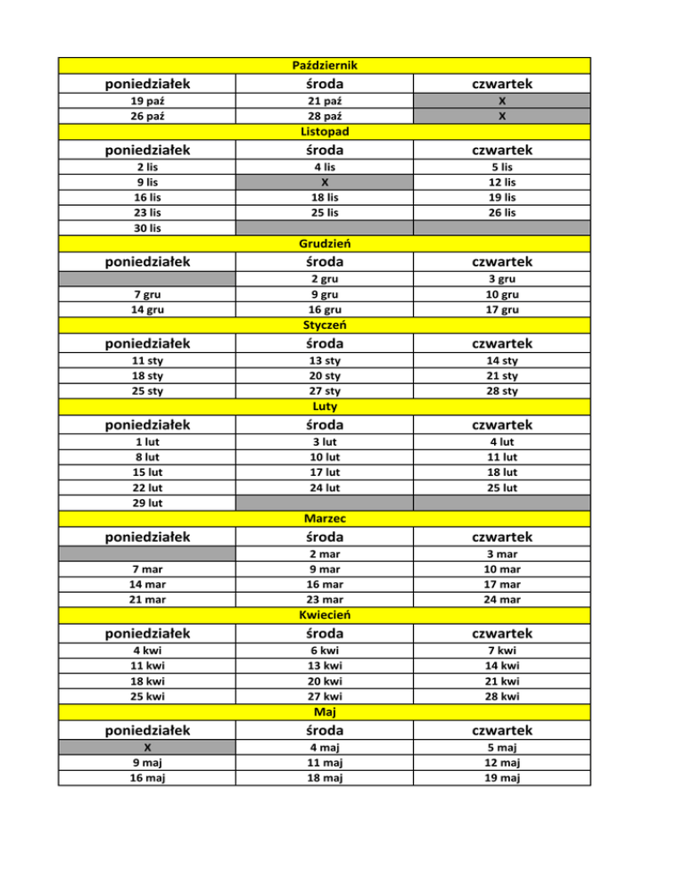 Październik poniedziałek środa czwartek 19 paź 26 paź 21 paź 28 paź X X Listopad poniedziałek środa czwartek 2 lis 9 lis 16 lis 23 lis 30 lis 4 lis X 18 lis 25 lis 5 lis 12 lis 19 lis 26 lis Grudzień poniedziałek środa czwartek 7 gru 14 gru 2 gru 9 gru 16 gru 3 gru 10 gru 17 gru Styczeń poniedziałek środa czwartek 11 sty 18 sty 25 sty 13 sty 20 sty 27 sty 14 sty 21 sty 28 sty Luty poniedziałek środa czwartek 1 lut 8 lut 15 lut 22 lut 29 lut 3 lut 10 lut 17 lut 24 lut 4 lut 11 lut 18 lut 25 lut Marzec poniedziałek środa czwartek 7 mar 14 mar 21 mar 2 mar 9 mar 16 mar 23 mar 3 mar 10 mar 17 mar 24 mar Kwiecień poniedziałek środa czwartek 4 kwi 11 kwi 18 kwi 25 kwi 6 kwi 13 kwi 20 kwi 27 kwi 7 kwi 14 kwi 21 kwi 28 kwi Maj poniedziałek środa czwartek X 9 maj 16 maj 4 maj 11 maj 18 maj 5 maj 12 maj 19 maj