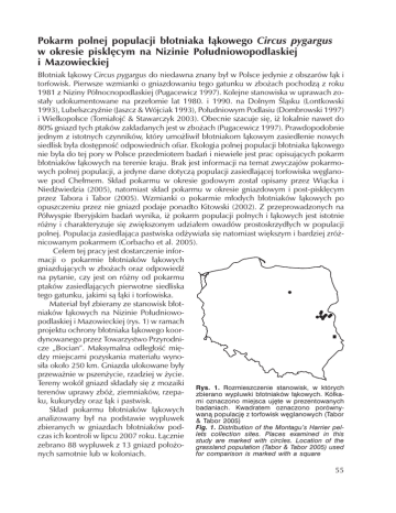 Pokarm polnej populacji błotniaka łąkowego Circus pygargus w okresie pisklęcym na Nizinie Południowopodlaskiej i Mazowieckiej Błotniak łąkowy Circus pygargus do niedawna znany był w Polsce jedynie z obszarów łąk i torfowisk. Pierwsze wzmianki o gniazdowaniu tego gatunku w zbożach pochodzą z roku 1981 z Niziny Północnopodlaskiej (Pugacewicz 1997). Kolejne stanowiska w uprawach zostały udokumentowane na przełomie lat 1980. i 1990. na Dolnym Śląsku (Lontkowski 1993), Lubelszczyźnie (Jaszcz & Wójciak 1993), Południowym Podlasiu (Dombrowski 1997) i Wielkopolsce (Tomiałojć & Stawarczyk 2003). Obecnie szacuje się, iż lokalnie nawet do 80% gniazd tych ptaków zakładanych jest w zbożach (Pugacewicz 1997). Prawdopodobnie jednym z istotnych czynników, który umożliwił błotniakom łąkowym zasiedlenie nowych siedlisk była dostępność odpowiednich ofiar. Ekologia polnej populacji błotniaka łąkowego nie była do tej pory w Polsce przedmiotem badań i niewiele jest prac opisujących pokarm błotniaków łąkowych na terenie kraju. Brak jest informacji na temat zwyczajów pokarmowych polnej populacji, a jedyne dane dotyczą populacji zasiedlającej torfowiska węglanowe pod Chełmem. Skład pokarmu w okresie godowym został opisany przez Wiącka i Niedźwiedzia (2005), natomiast skład pokarmu w okresie gniazdowym i post-pisklęcym przez Tabora i Tabor (2005). Wzmianki o pokarmie młodych błotniaków łąkowych po opuszczeniu przez nie gniazd podaje ponadto Kitowski (2002). Z przeprowadzonych na Półwyspie Iberyjskim badań wynika, iż pokarm populacji polnych i łąkowych jest istotnie różny i charakteryzuje się zwiększonym udziałem owadów prostoskrzydłych w populacji polnej. Populacja zasiedlająca pastwiska odżywiała się natomiast większym i bardziej zróżnicowanym pokarmem (Corbacho et al. 2005). Celem tej pracy jest dostarczenie informacji o pokarmie błotniaków łąkowych gniazdujących w zbożach oraz odpowiedź na pytanie, czy jest on różny od pokarmu ptaków zasiedlających pierwotne siedliska tego gatunku, jakimi są łąki i torfowiska. Materiał był zbierany ze stanowisk błotniaków łąkowych na Nizinie Południowopodlaskiej i Mazowieckiej (rys. 1) w ramach projektu ochrony błotniaka łąkowego koordynowanego przez Towarzystwo Przyrodnicze „Bocian”. Maksymalna odległość między miejscami pozyskania materiału wynosiła około 250 km. Gniazda ulokowane były przeważnie w pszenżycie, rzadziej w życie. Tereny wokół gniazd składały się z mozaiki Rys. 1. Rozmieszczenie stanowisk, w których terenów uprawy zbóż, ziemniaków, rzepa- zbierano wypluwki błotniaków łąkowych. Kółkami oznaczono miejsca ujęte w prezentowanych ku, kukurydzy oraz łąk i pastwisk. Skład pokarmu błotniaków łąkowych badaniach. Kwadratem oznaczono porównywaną populację z torfowisk węglanowych (Tabor analizowany był na podstawie wypluwek & Tabor 2005) zbieranych w gniazdach błotniaków pod- Fig. 1. Distribution of the Montagu’s Harrier pelczas ich kontroli w lipcu 2007 roku. Łącznie lets collection sites. Places examined in this study are marked with circles. Location of the zebrano 88 wypluwek z 13 gniazd położo- grassland population (Tabor & Tabor 2005) used for comparison is marked with a square nych samotnie lub w koloniach. 55 Wypluwki były preparowane „na mokro” (Cichocki & Mikusek 2005). Każda wypluwka była traktowana osobno, a liczbę ofiar ustalano na podstawie liczby diagnostycznych elementów szkieletu, takich jak czaszki lub żuchwy w przypadku ssaków, dzioby w przypadku ptaków, przedplecza, pary pokryw skrzydłowych czy żuwaczek w przypadku owadów. Kręgowce starano się oznaczyć do gatunku na podstawie kluczy do identyfikacji ssaków (Pucek 1984) oraz ptaków (Brown et al. 2006, Jenni & Winkler 1994). Owady oznaczano jedynie do rzędów. Kalkulacje biomasy ssaków i ptaków wykonano w oparciu o średnie masy ciała poszczególnych gatunków zestawione w pracy Jędrzejewskiej i Jędrzejewskiego (2001). Biomasę chrząszczy Coleoptera obliczono na podstawie przeciętnej wielkości biomasy średniej wielkości biegaczowatych Carabidae (Szyszko – mat. niepubl.). Wartość biomasy prostoskrzydłych uzyskano na podstawie masy pasikoników zielonych Tettigonia viridissima pochodzących z hodowli. W przypadku kręgowców, których nie udało się oznaczyć do gatunku, do kalkulacji ich biomasy użyto średniej ważonej z oznaczonych ofiar w tej grupie taksonomicznej. Uzyskane dane dotyczące liczebności poszczególnych grup ofiar porównano z dietą populacji z torfowisk węglanowych pod Chełmem (Tabor & Tabor 2005), istotność różnic sprawdzano testem 2. Łącznie oznaczono 313 ofiar, do których należały ssaki, ptaki i owady (tab. 1) Wśród ssaków dominowały nornikowate Arvicolidae, których jedynym przedstawicielem w wypluwkach był polnik Microtus arvalis. Z myszowatych Muridae wykazano jedynie mysz polną Apodemus agrarius. Tylko jedna trzecia ptaków została oznaczona do gatunku. Większość z nich stanowiły skowronki Alauda arvensis (zarówno pisklęta jak i lotne ptaki), rzadziej w pokarmie występowały pliszki żółte Motacilla flava. Najliczniejszą grupą ofiar były owady, spośród których zdecydowanie dominowały prostoskrzydłe, rzadziej chrząszcze. Ponad 25 % wypluwek zawierało wyłącznie owady, reprezentowane przede wszystkim przez prostoskrzydłe, ok. 11 % wypluwek zawierało więcej niż 5 szarańczaków. Porównanie pokarmu Tabela 1. Skład pokarmu błotniaków łąkowych w okresie pisklęcym na Nizinie Południowopodlaskiej i Mazowieckiej Table 1. Diet of the Montagu’s Harrier arable land population. (1) – prey species, (2) – number of prey items, (3) – share in the prey items, (4) – frequency in the pellets, (5) – share in the prey biomass, (6) – mammals in total, (7) – birds in total, (8) – insects in total, (9) – total Ofiara (1) Microtus arvalis