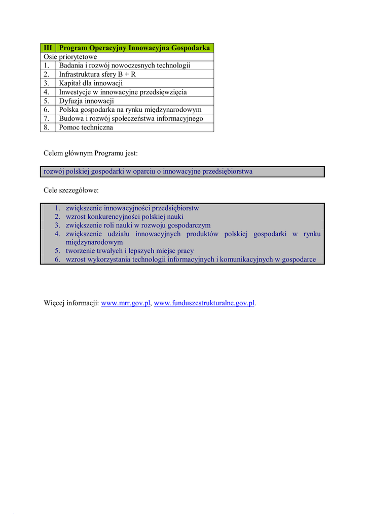 III Program Operacyjny Innowacyjna Gospodarka Osie priorytetowe 1. Badania i rozwój nowoczesnych technologii 2. Infrastruktura sfery B + R 3. Kapitał dla innowacji 4. Inwestycje w innowacyjne przedsięwzięcia 5. Dyfuzja innowacji 6. Polska gospodarka na rynku międzynarodowym 7. Budowa i rozwój społeczeństwa informacyjnego 8. Pomoc techniczna Celem głównym Programu jest: rozwój polskiej gospodarki w oparciu o innowacyjne przedsiębiorstwa Cele szczegółowe: 1. 2. 3. 4. zwiększenie innowacyjności przedsiębiorstw wzrost konkurencyjności polskiej nauki zwiększenie roli nauki w rozwoju gospodarczym zwiększenie udziału innowacyjnych produktów polskiej gospodarki w rynku międzynarodowym 5. tworzenie trwałych i lepszych miejsc pracy 6. wzrost wykorzystania technologii informacyjnych i komunikacyjnych w gospodarce Więcej informacji: www.mrr.gov.pl, www.funduszestrukturalne.gov.pl.