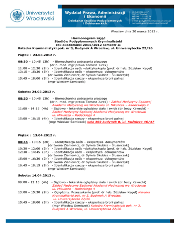 Wrocław dnia 20 marca 2012 r. Harmonogram zajęć Studiów Podyplomowych Kryminalistyki rok akademicki 2011/2012 semestr II Katedra Kryminalistyki pok. nr 3, Budynek A Wrocław, ul. Uniwersytecka 22/26 Piątek : 23.03.2012 r. 08:30 – 10:45 (3h) - Biomechanika potrącenia pieszego (dr n. med. mgr prawa Tomasz Jurek) 11:00 – 12:30 (2h) - Identyfikacja osób –daktyloskopia (prof. dr hab. Zdzisław Kegel) 13:15 – 15:30 (3h) - Identyfikacja osób – ekspertyza dokumentów (dr Iwona Zieniewicz, dr Sylwia Skubisz - Ślusarczyk) 15:45 – 18:00 (3h) - Identyfikacja rzeczy - ekspertyza broni palnej (mgr Wiesław Semiczek) Sobota: 24.03.2012 r. 08:30 – 10:45 (3h) - Biomechanika potrącenia pieszego (dr n. med. mgr prawa Tomasz Jurek) - Zakład Medycyny Sądowej Akademii Medycznej we Wrocławiu ul. Mikulicza – Radeckiego 4 11:00 - 14:15 (4h) - Sądowo - lekarskie oględziny ciała i zwłok (dr Jerzy Kawecki) Zakład Medycyny Sądowej Akademii Medycznej we Wrocławiu ul. Mikulicza – Radeckiego 4 15:00 – 18:15 (4h) - Identyfikacja rzeczy - ekspertyza broni palnej (mgr Wiesław Semiczek) sala 302 budynek B, ul. Kuźnicza 46/47 Piątek : 13.04.2012 r. 08:45 – 10:15 (2h) - Identyfikacja osób – ekspertyza dokumentów (dr Iwona Zieniewicz, dr Sylwia Skubisz - Ślusarczyk) 10:30 – 12:00 (2h) - Identyfikacja osób –daktyloskopia (prof. dr hab. Zdzisław Kegel) 12:30 – 14:45 (3h) - Identyfikacja osób – ekspertyza dokumentów (dr Iwona Zieniewicz, dr Sylwia Skubisz - Ślusarczyk) 15:00 – 16:30 (2h) - Identyfikacja osób – ekspertyza dokumentów (dr Iwona Zieniewicz, dr Sylwia Skubisz - Ślusarczyk) 16:45 – 18:15 (2h) - Identyfikacja rzeczy - ekspertyza broni palnej (mgr Wiesław Semiczek) Sobota: 14.04.2012 r. 09:00 - 12:15 (4h) - Sądowo - lekarskie oględziny ciała i zwłok (dr Jerzy Kawecki) Zakład Medycyny Sądowej Akademii Medycznej we Wrocławiu ul. Mikulicza – Radeckiego 4 13:00 – 15:30 (2h) - Oględziny. Przeszukanie (prof. dr hab. Zdzisław Kegel) Katedra Kryminalistyki pok. nr 3, Budynek A Wrocław, ul. Uniwersytecka 22/26 15:45 – 18:00 (3h) - Identyfikacja rzeczy - ekspertyza broni palnej (mgr Wiesław Semiczek) Katedra Kryminalistyki pok. nr 3, Budynek A Wrocław, ul. Uniwersytecka 22/26 Niedziela: 15.04.2012 r. 09:15 – 10:45 (2h) - Identyfikacja rzeczy - ekspertyza broni palnej (mgr Wiesław Semiczek) 11:00 – 12:30 (2h) - Oględziny. Przeszukanie (prof. dr hab. Zdzisław Kegel) 13:00 – 15:15 (3h) - Niekonwencjonalne metody wykrywcze i identyfikacyjne (dr hab. Maciej Trzciński) 15:30 – 17:00 (2h) - Niekonwencjonalne metody wykrywcze i identyfikacyjne (dr hab. Maciej Trzciński) Piątek : 18.05.2012 r. 08:30 – 10:45 (3h) - Niekonwencjonalne metody wykrywcze i identyfikacyjne (dr hab. Maciej Trzciński) 11:00 – 13:15 (3h) - Oględziny. Przeszukanie (prof. dr hab. Zdzisław Kegel) 13:45 – 16:00 (3h) - Zabezpieczenie dokumentów elektronicznych przed fałszerstwem (dr Rafał Cieśla) 16:15 – 17:45 (2h) - Zabezpieczenie dokumentów elektronicznych przed fałszerstwem (dr Rafał Cieśla) Sobota: 19.05.2012 r. 08:30 - 11:45 (4h) - Sądowo - lekarskie oględziny ciała i zwłok (dr Jerzy Kawecki) Zakład Medycyny Sądowej Akademii Medycznej we Wrocławiu ul. Mikulicza – Radeckiego 4 12:30 – 14:00 (2h) - Niekonwencjonalne metody wykrywcze i identyfikacyjne (dr hab. Maciej Trzciński) Katedra Kryminalistyki pok. nr 3, Budynek A Wrocław, ul. Uniwersytecka 22/26 14:15 – 16:30 (3h) - Zabezpieczenie dokumentów elektronicznych przed fałszerstwem (dr Rafał Cieśla) Katedra Kryminalistyki pok. nr 3, Budynek A Wrocław, ul. Uniwersytecka 22/26 16:45 – 18:15 (2h) - Zabezpieczenie dokumentów elektronicznych przed fałszerstwem (dr Rafał Cieśla) Katedra Kryminalistyki pok. nr 3, Budynek A Wrocław, ul. Uniwersytecka 22/26 Niedziela: 20.05.2012 r. 09:00 – 12:15 (4h) - Biomechanika potrącenia pieszego (dr n. med. mgr prawa Tomasz Jurek) 12:30 – 14:45 (3h) - Oględziny. Przeszukanie (prof. dr hab. Zdzisław Kegel) W semestrze II obowiązują egzaminy z następujących przedmiotów: 1. 2. 3. 4. 5. Sądowo-lekarskie oględziny ciała i zwłok, Identyfikacja rzeczy, Identyfikacja osób, Oględziny. Przeszukanie Biomechanika potrącenia pieszego. Z pozostałych przedmiotów obowiązują zaliczenia. W celu zaliczenia semestru II, indeksy i karty egzaminacyjne należy złożyć w dziekanacie w ciągu trzech dni po zakończeniu sesji egzaminacyjnej z pełnym kompletem wpisanych zaliczeń i stopni z obowiązujących egzaminów. Ocena winna być wpisana słownie, cyfrowo i z datą przeprowadzonego egzaminu lub uzyskanego zaliczenia.