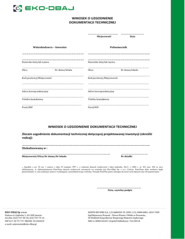 WNIOSEK O UZGODNIENIE DOKUMENTACJI TECHNICZNEJ ……………………………………….. Miejscowość Wnioskodawca – Inwestor ……………………………… Data Pełnomocnik ………………………………………………………………………….. ………………………………………………………………………….. ………………………………………………………………………….. ………………………………………………………………………….. Nazwisko Imię lub nazwa Nazwisko Imię lub nazwa ……………………………………………………………………………………… Ulica Nr domu/lokalu …………………………………………………………………………………….. Ulica Nr domu/lokalu ……………………………………………………………………………………… Kod pocztowy/Miejscowość ……………………………………………………………………………………… Kod pocztowy/Miejscowość ……………………………………………………………………………………… …………………………………………………………………………………….. …………………………………………………………………………………….. Adres korespondencyjny ……………………………………………………………………………………… Adres korespondencyjny ……………………………………………………………………………………… Telefon kontaktowy …………………………………………………………………………………….. Telefon kontaktowy …………………………………………………………………………………… Pesel/NIP …………………………………………………………………………………….. Pesel/NIP WNIOSEK O UZGODNIENIE DOKUMENTACJI TECHNICZNEJ Zlecam uzgodnienie dokumentacji technicznej dotyczącej projektowanej inwestycji (określić rodzaj): ……………………………………………………………………………………………………………………………………………. Zlokalizowaną w : …………………………………………………………………………………………. …………………………….. Miejscowość/Ulica/Nr domu/Nr lokalu …………………………………… Nr działki „ Zgodnie z art. 24 ust. 1 ustawy z dnia 29 sierpnia 1997 r. o ochronie danych osobowych ( tekst jednolity: Dz.U. z 2002 r. nr 101, poz. 926 ze zm.) informujemy, iż Administratorem Pani/Pana danych osobowych zawartych we wniosku jest Eko-Dbaj Sp. z o.o. Cielcza. Pani/Pana dane osobowe będą przetwarzanie w celu realizacji umowy wynikającej z przedmiotowego wniosku. Posiada Pani/Pan prawo dostępu do treści tych danych oraz ich poprawiania.” ………………………………………..…………………. Data, czytelny podpis